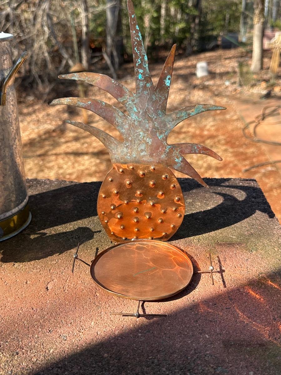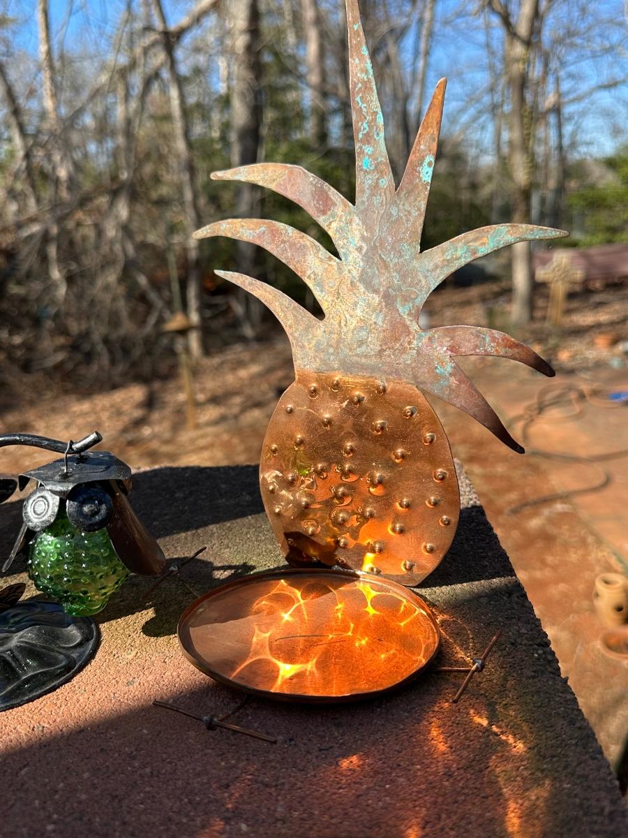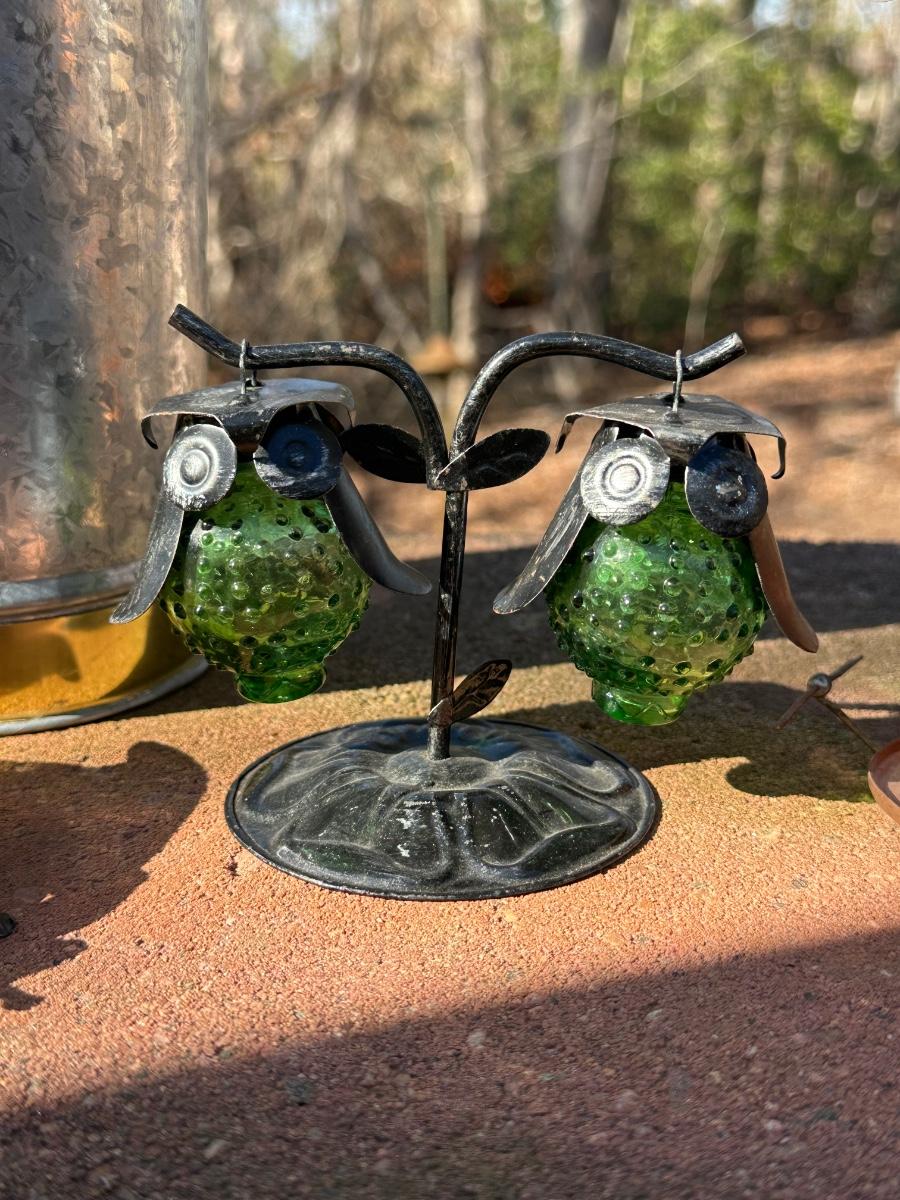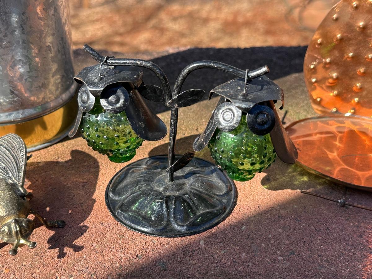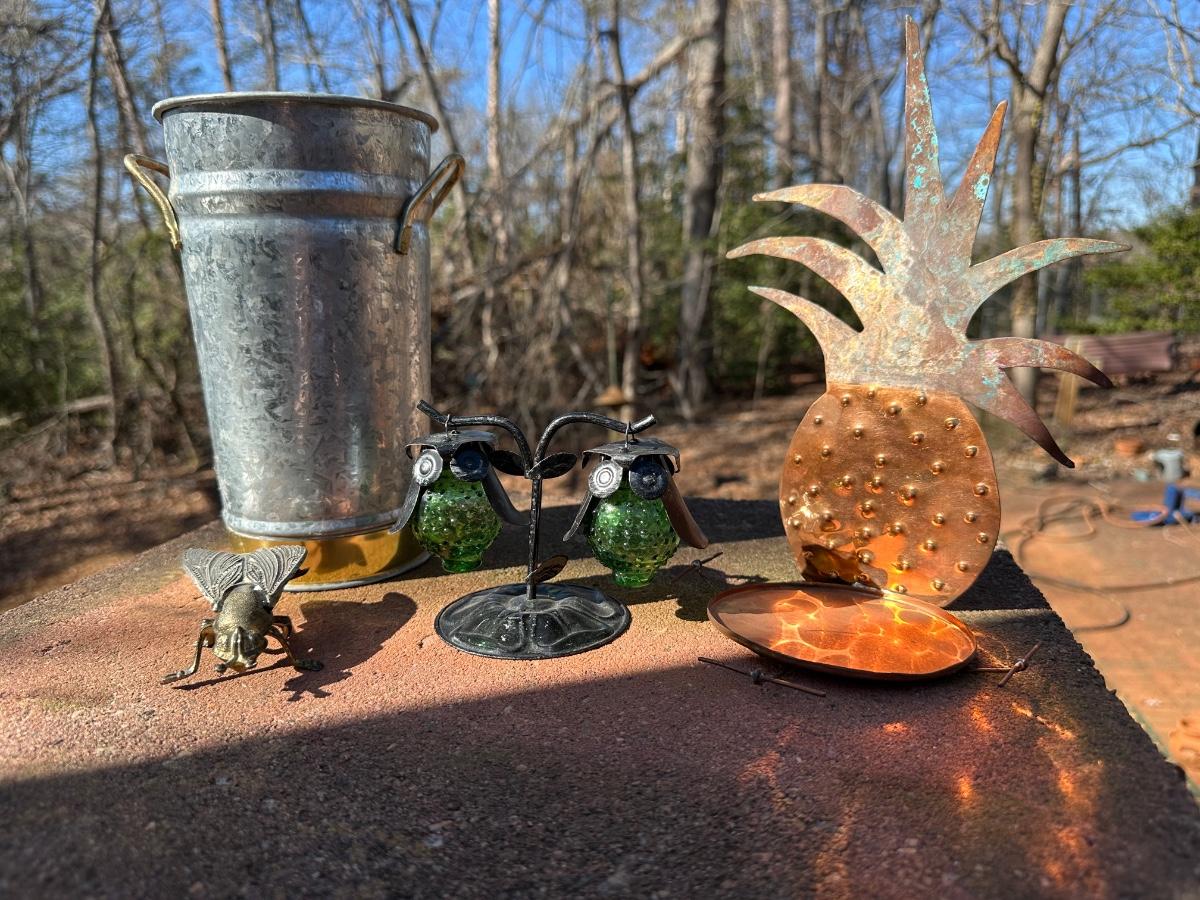 Incudes Tin pot, what appears to be a Pineapple plant stand, Owl Salt & Pepper Shakers and a Fly Trinket Dish