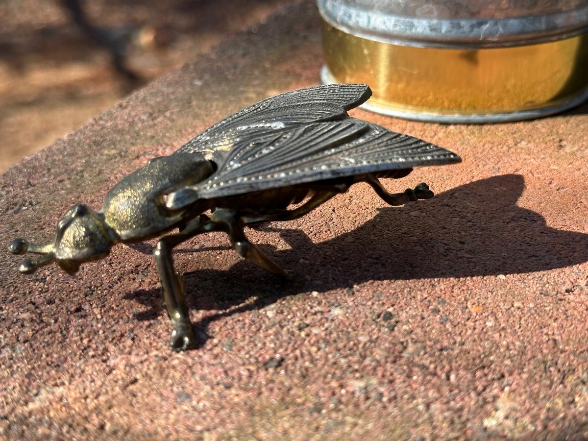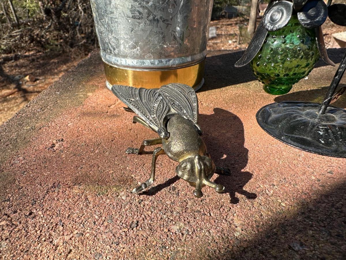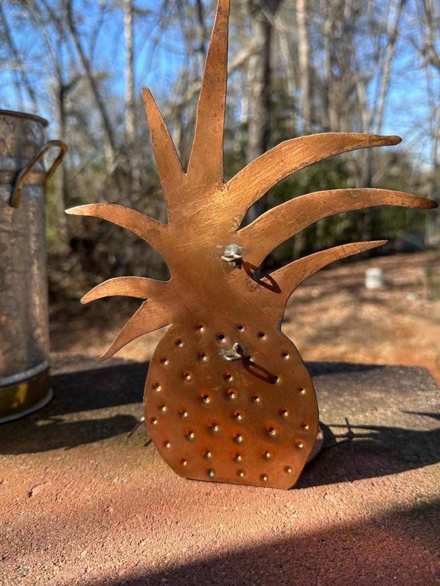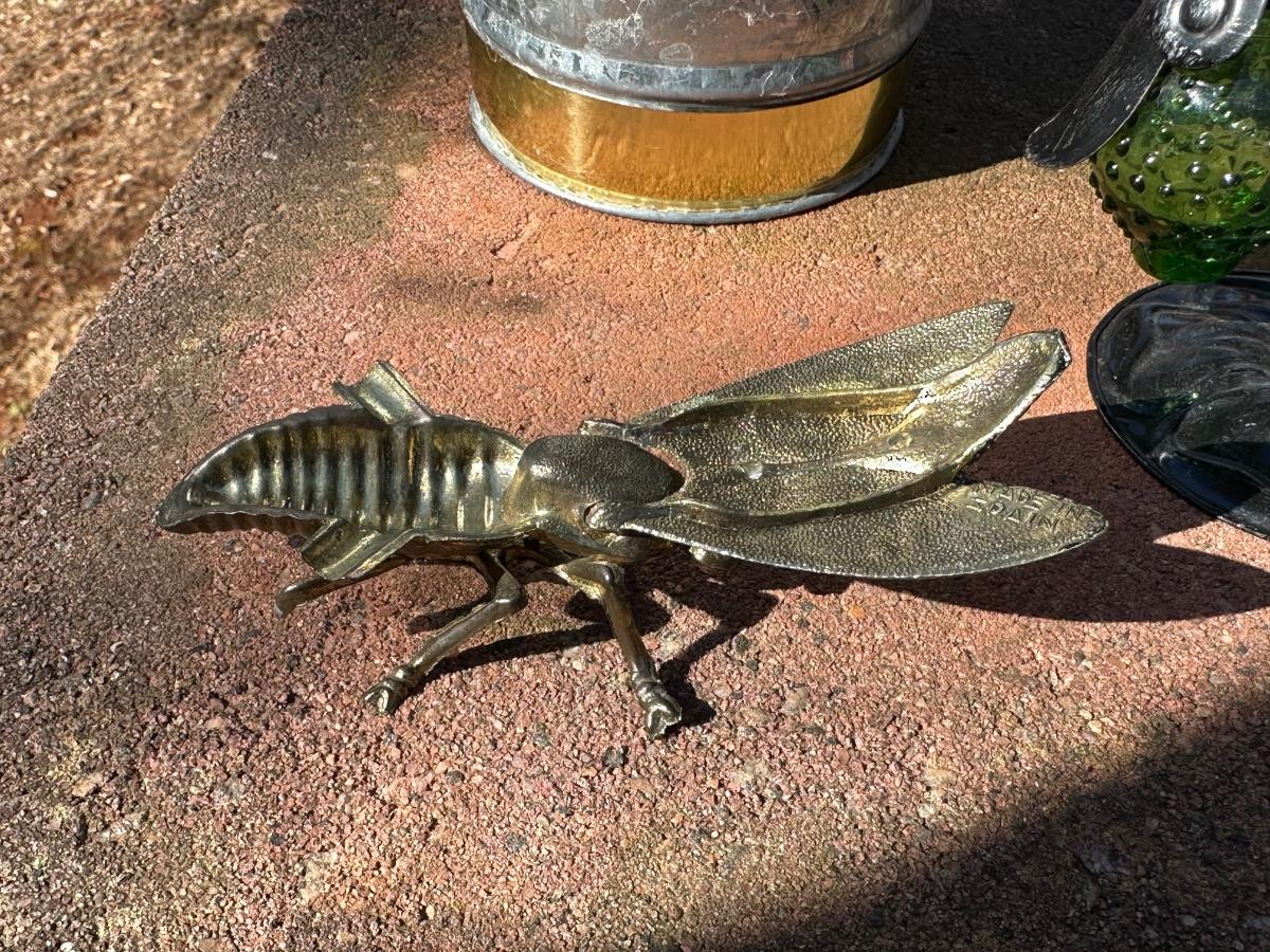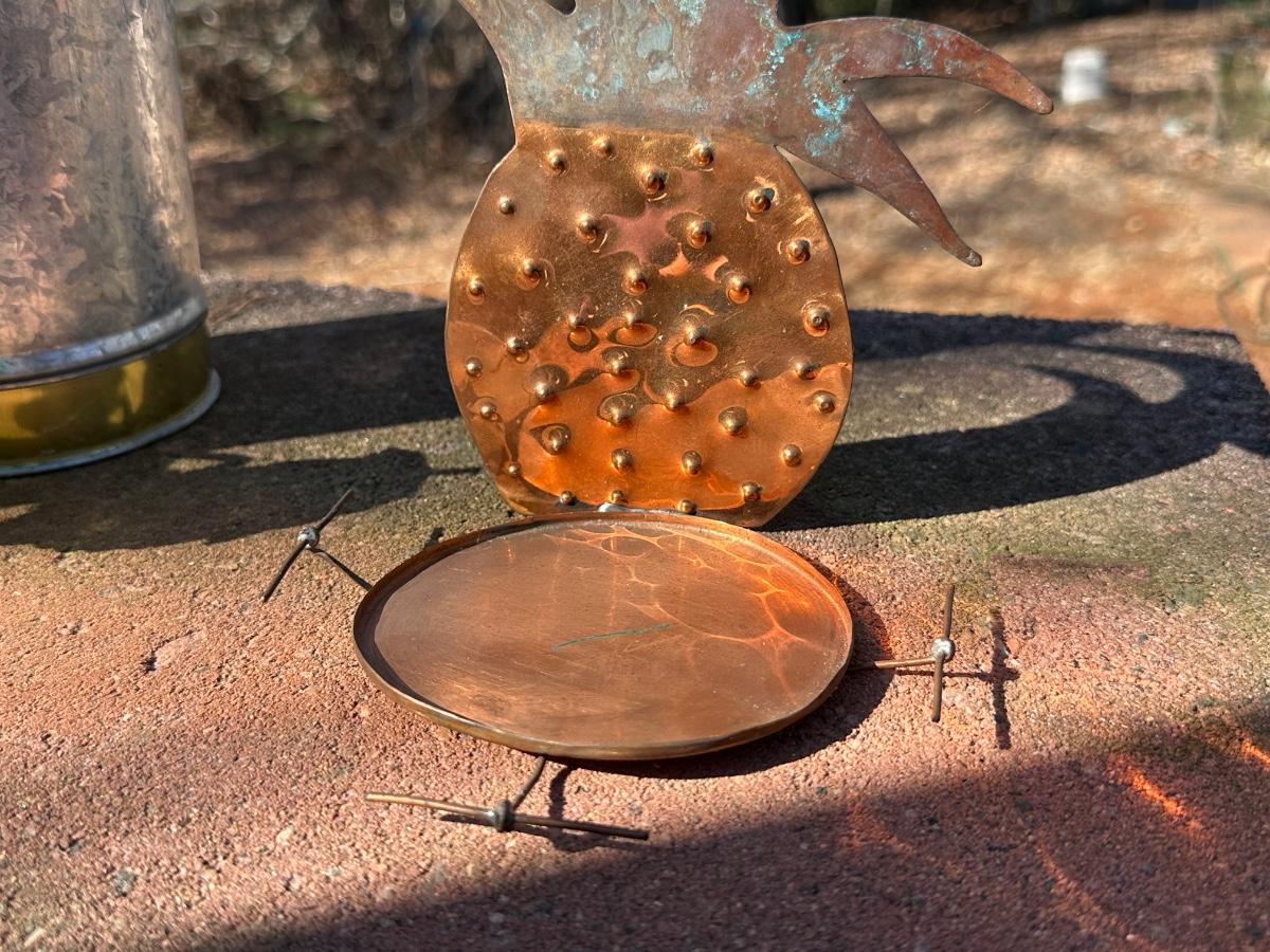 Incudes Tin pot, what appears to be a Pineapple plant stand, Owl Salt & Pepper Shakers and a Fly Trinket Dish
