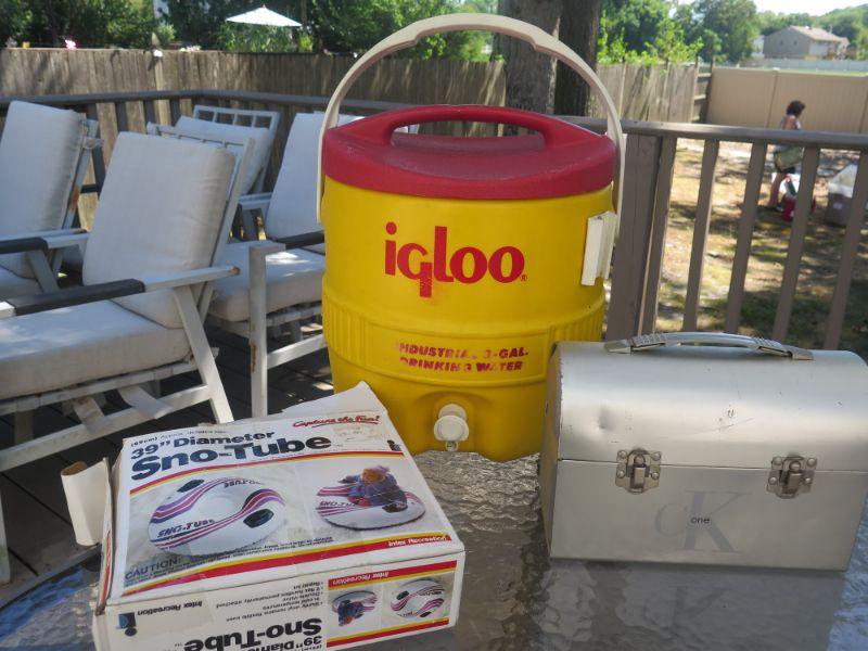 Igloo water cooler, Sno-tube and a metal lunch pail. **Please read Terms and Conditions before placing a bid. Pick up is Sunday, September 15, 2019 from 11am to 4pm and Tuesday, September 17 from 4pm-7pm in Sicklerville. All sales are final. All sales are as is, where is. Please review all photos. Any props included in photos are not included in listing. All measurements are approximate.