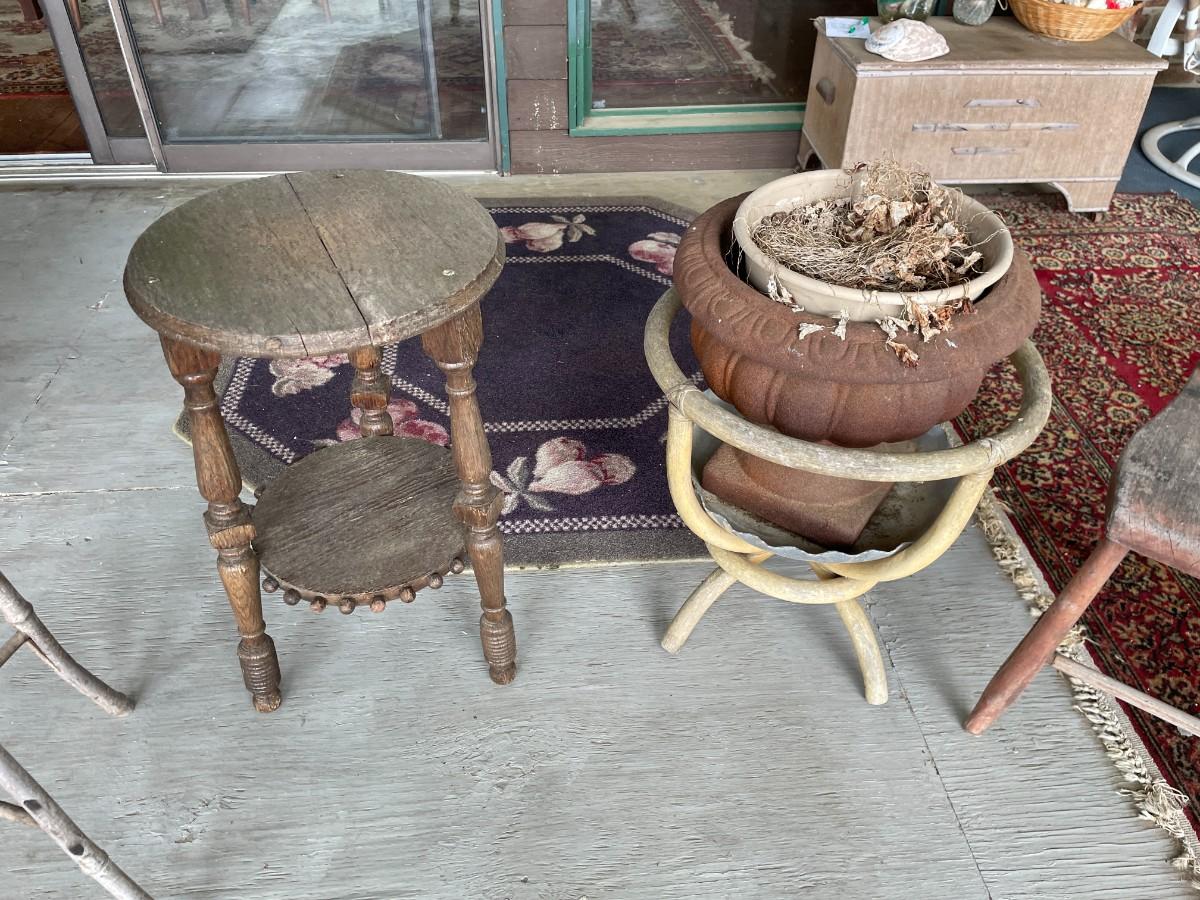 Lot of Outdoor Wooden Furniture and Planter items. Square Table: 14 x 14 x 30h