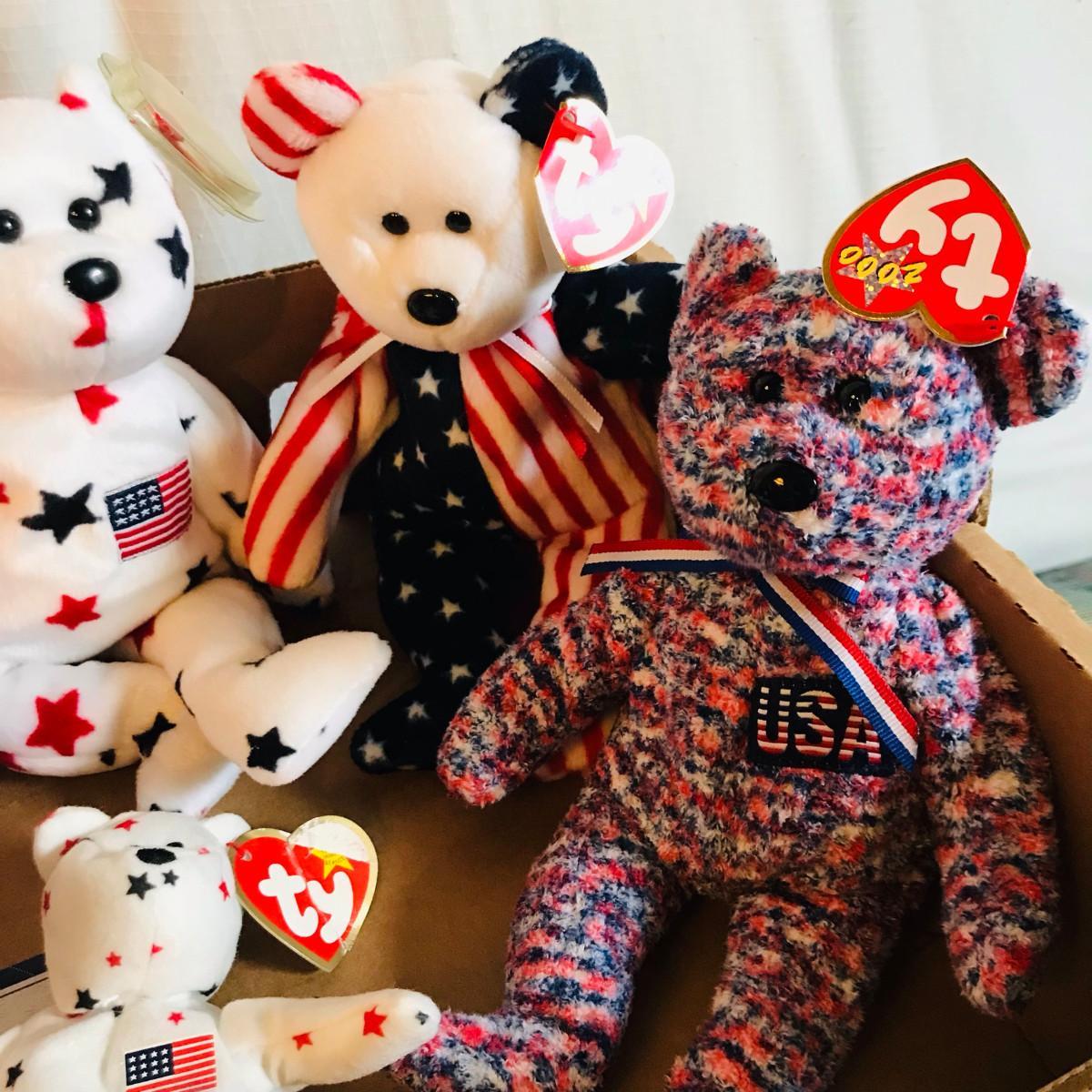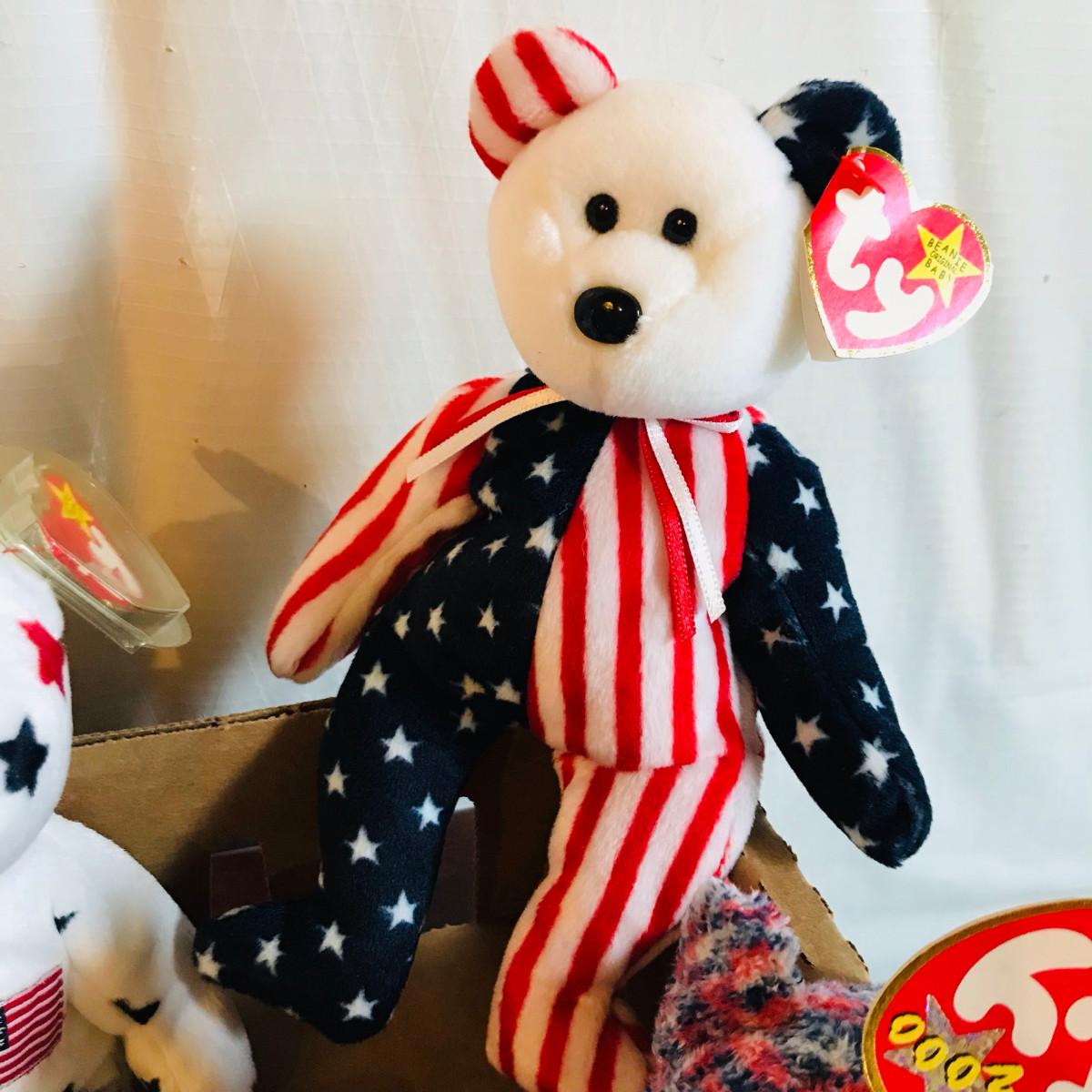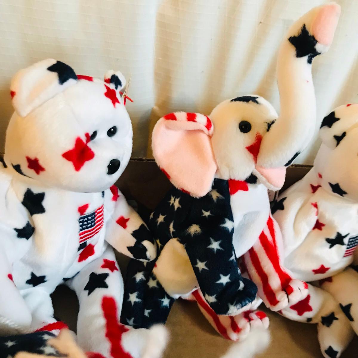 Flat of Patriotic Beanie Babies, all with hang tags, one teenie beanie!