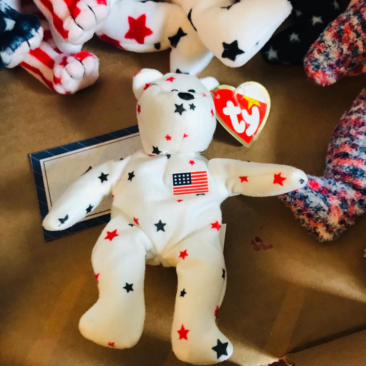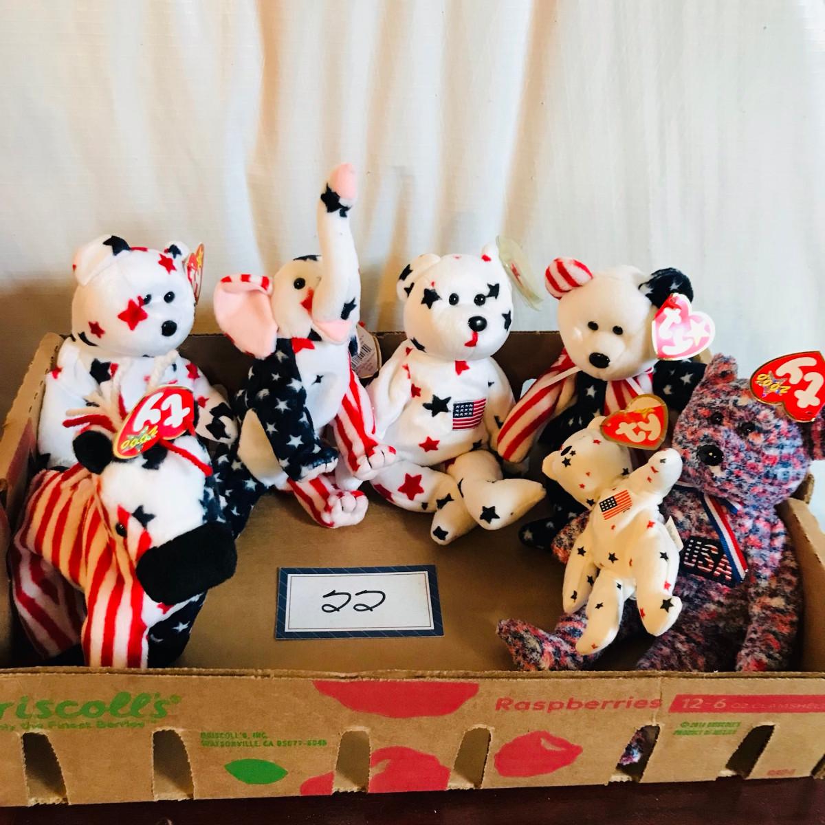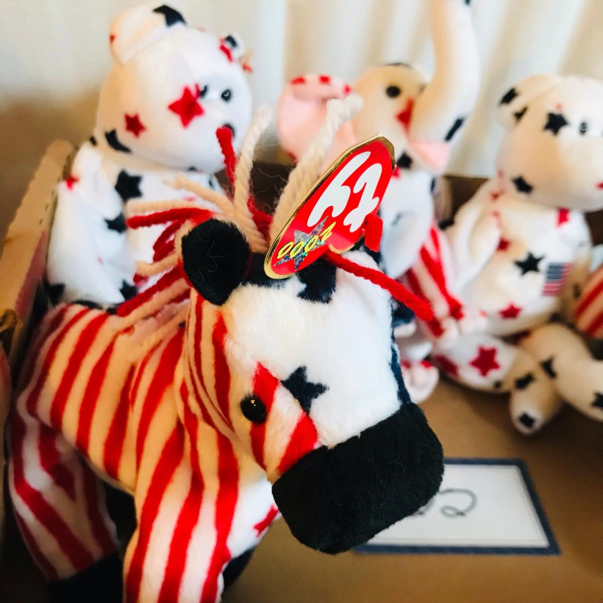 Flat of Patriotic Beanie Babies, all with hang tags, one teenie beanie!