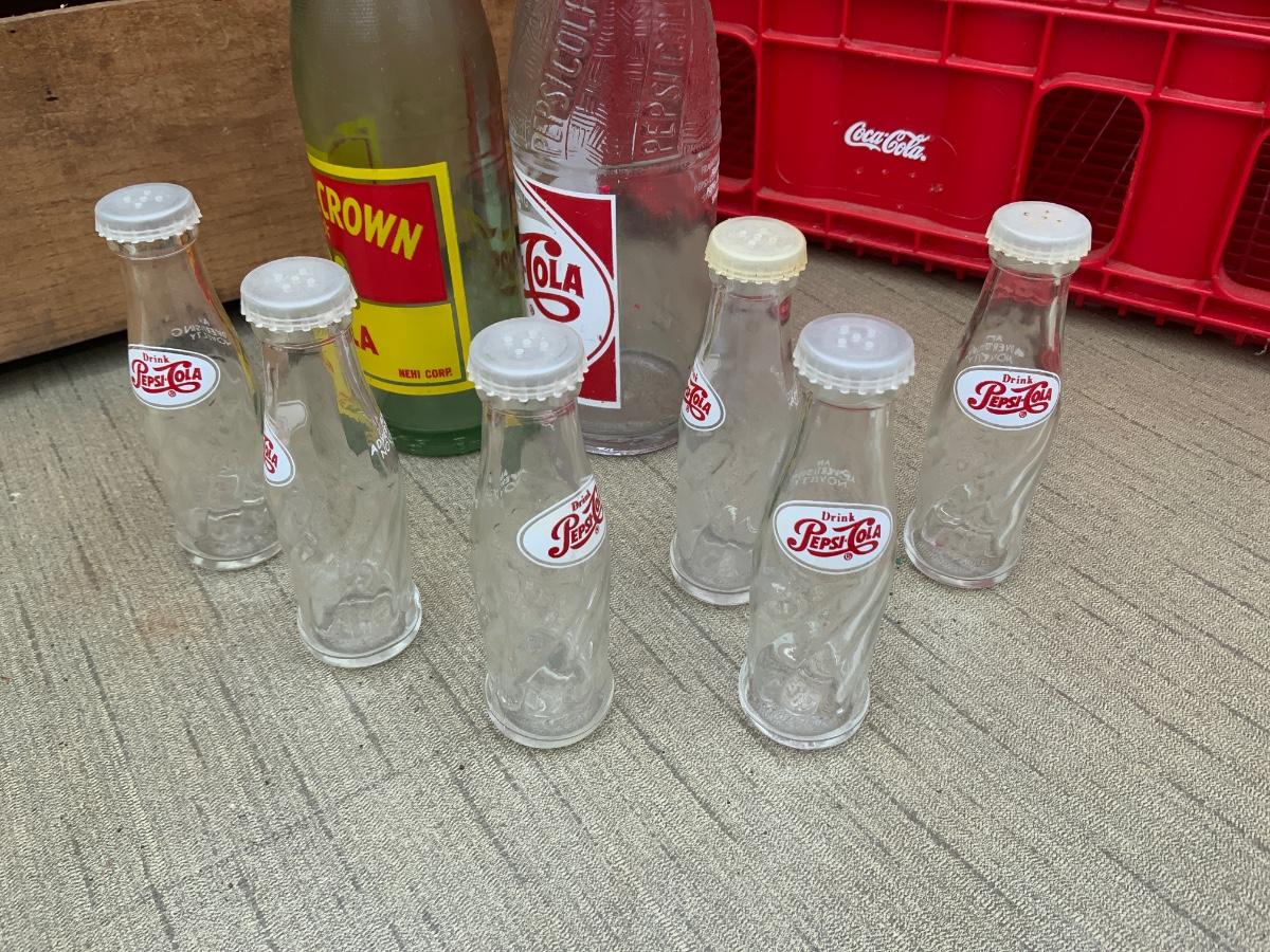 Lot of Pepsi and Coke Crates and Bottles. Includes little Pepsi bottles with salt and pepper tops