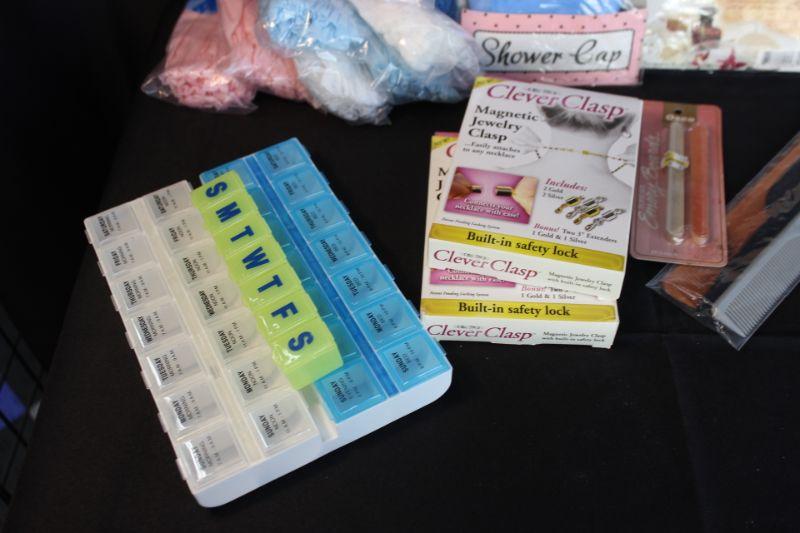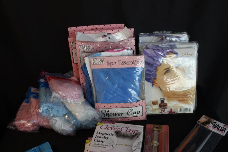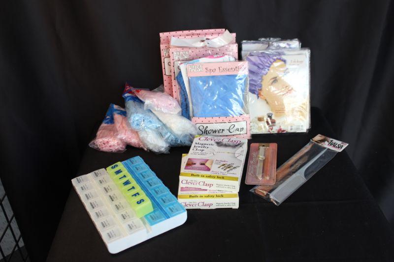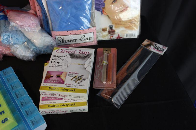 Lot of personal items. Everything in original packages except the pill containers. Shower caps, combs, nail files, magnetic jewelry clasps, and pill containers.