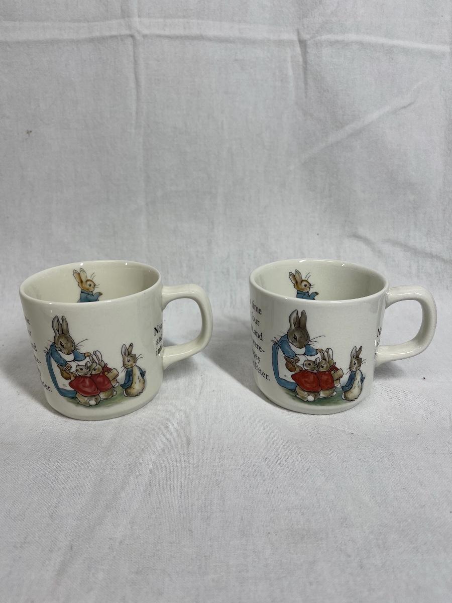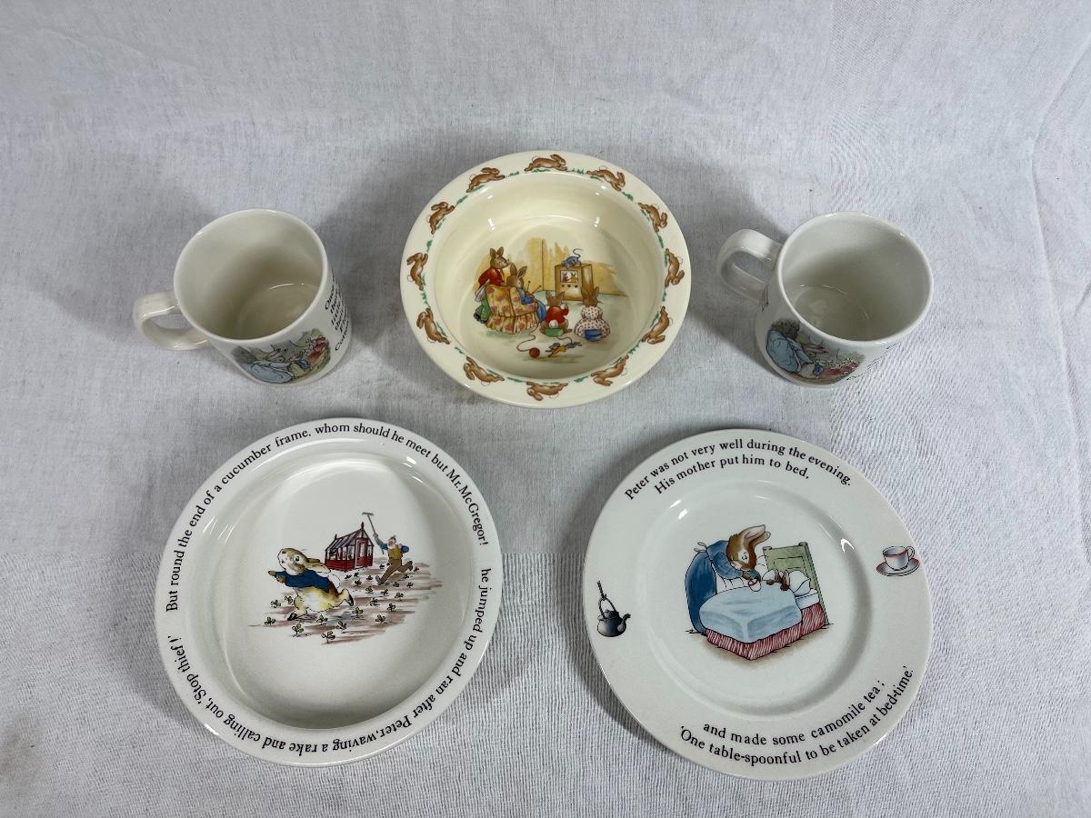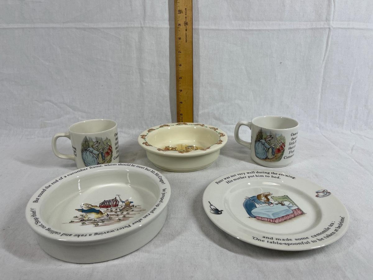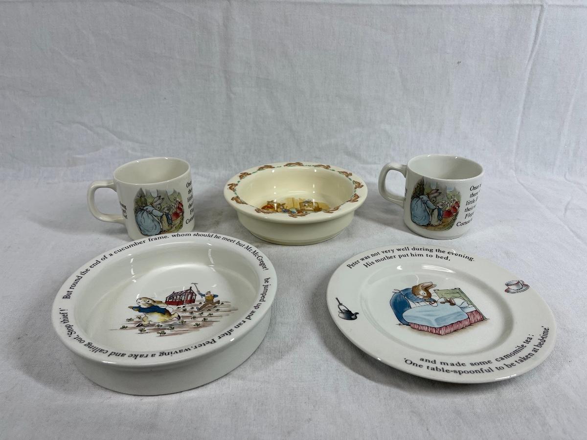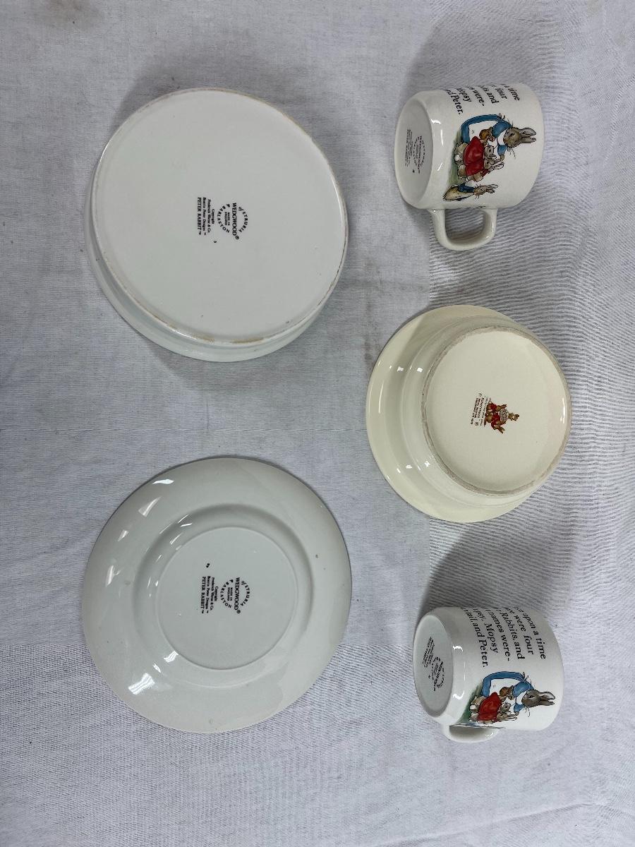 Lot of Peter Rabbit china cups, plate, bowls. Display great.