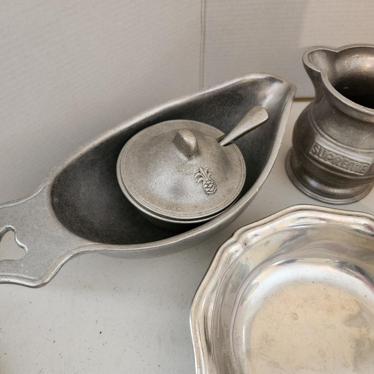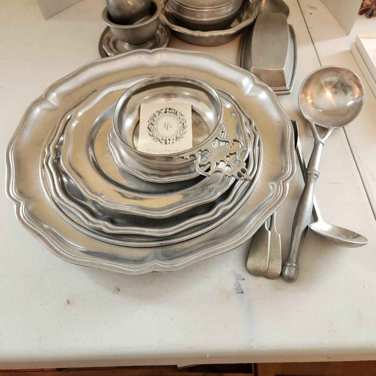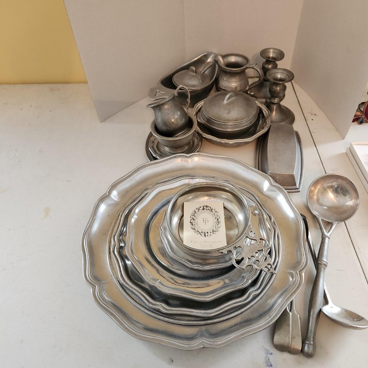 Lot of Pewter Plates, Creamer Sugar Bowl Gravy bowl Candle Holders