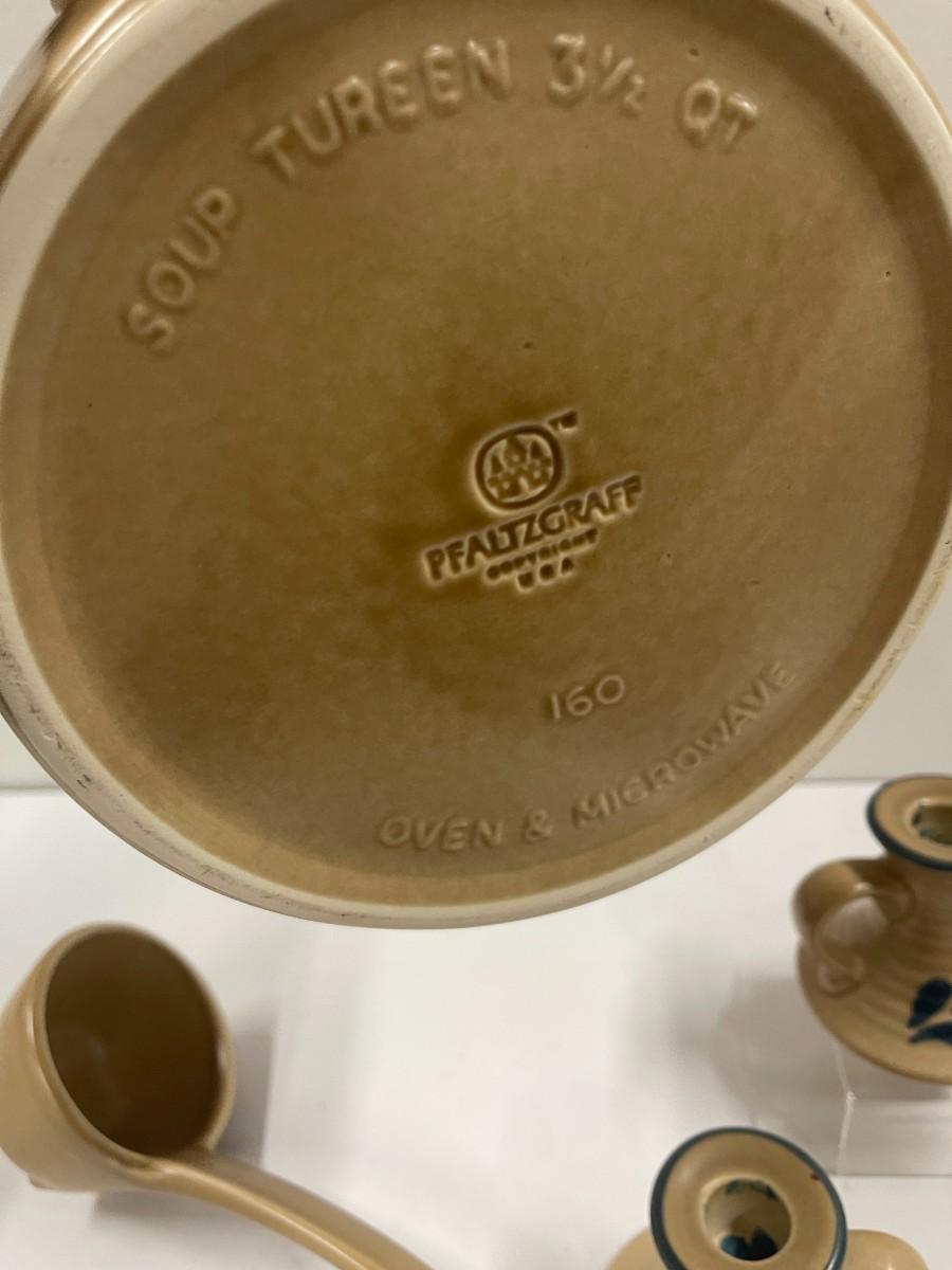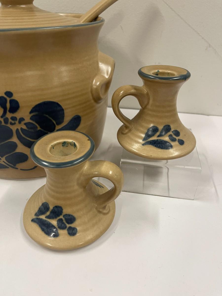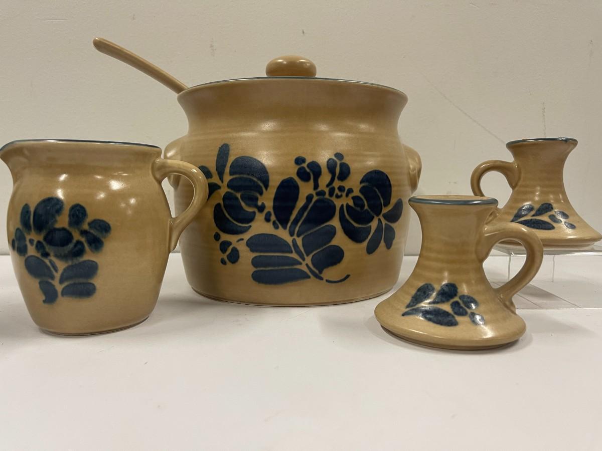 Lot of Pfaltzgraff Folk Art stoneware pieces. Lot includes 3 1/2" qt tureen with ladle, creamer and pair of candlesticks. All in excellent condition.