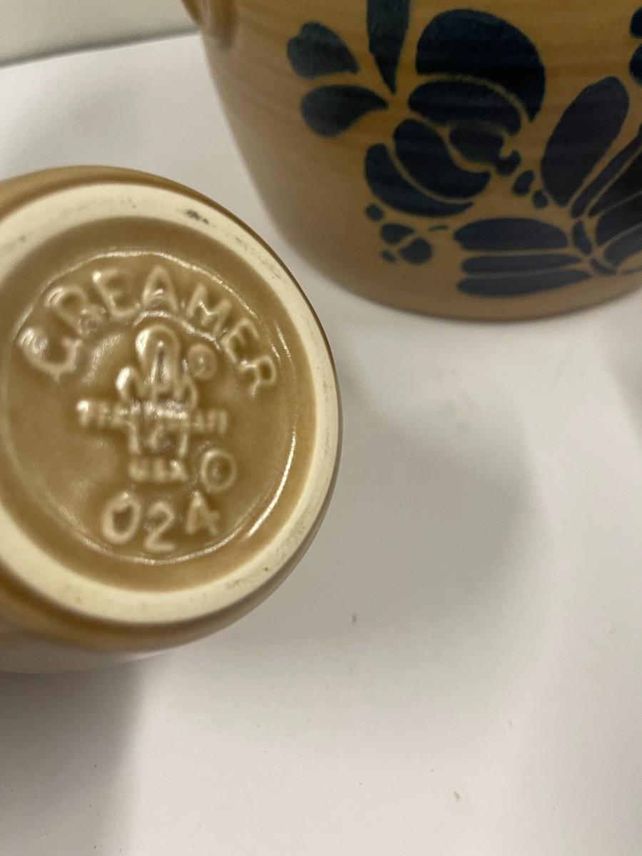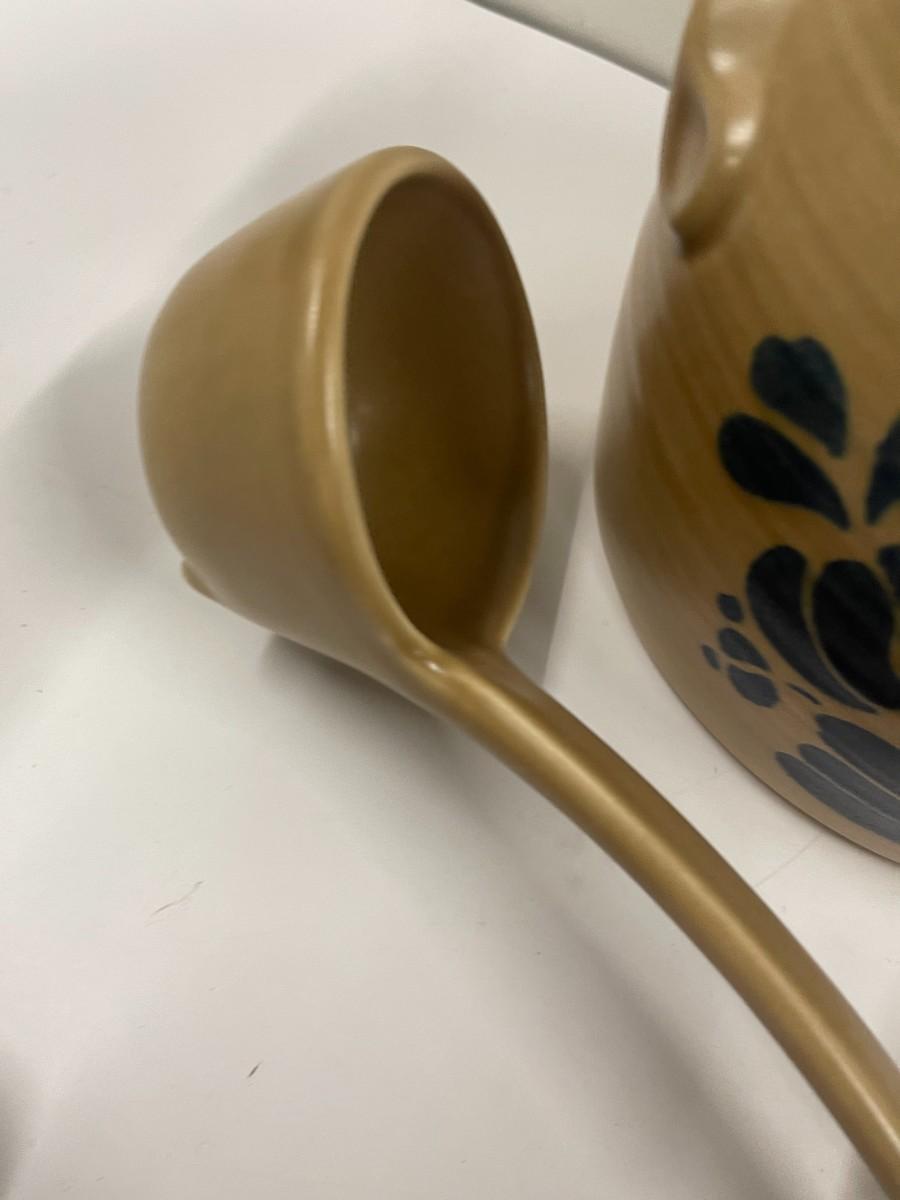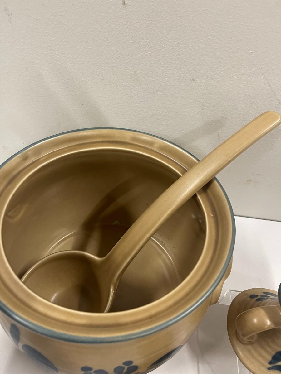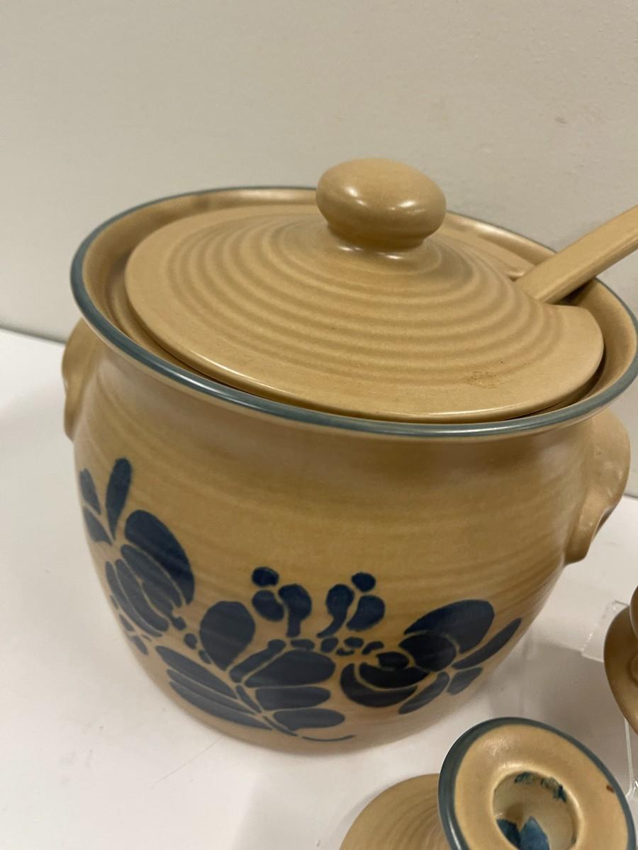 Lot of Pfaltzgraff Folk Art stoneware pieces. Lot includes 3 1/2" qt tureen with ladle, creamer and pair of candlesticks. All in excellent condition.