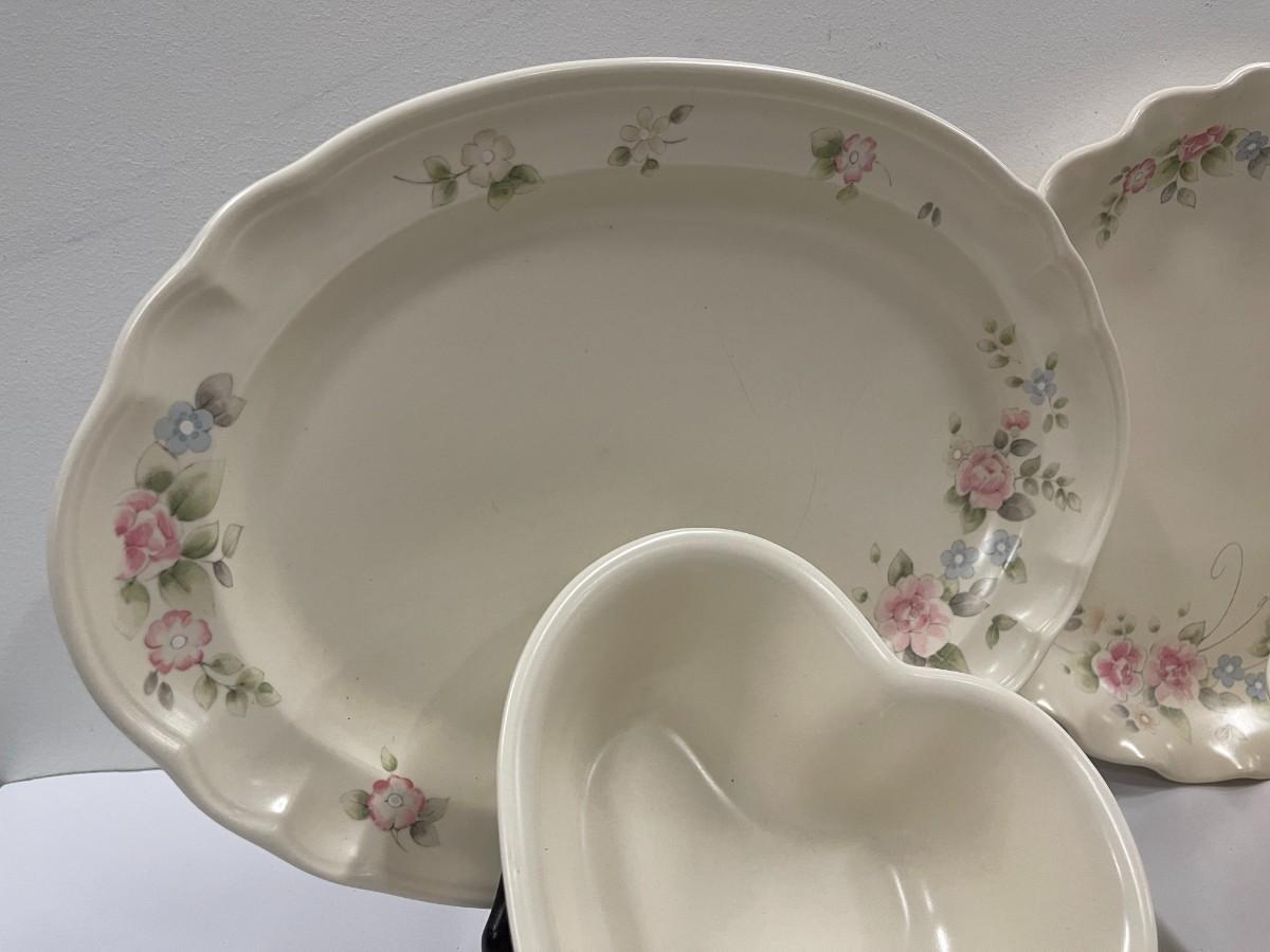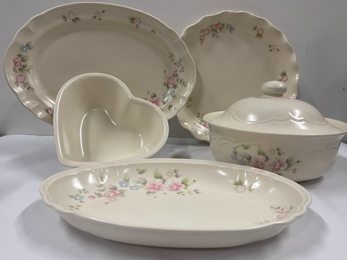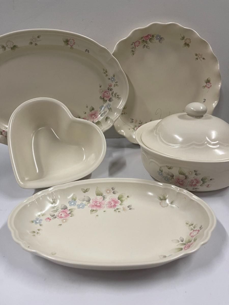 Vintage Pfaltzgraff Tearose serving dishes. Includes: covered vegetable, heart shaped dish, two oval serving platters and one round serving platter. All in very good condition.