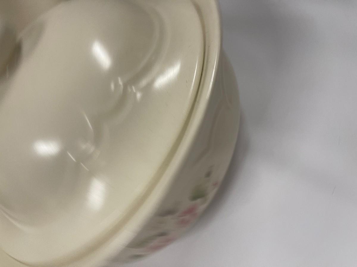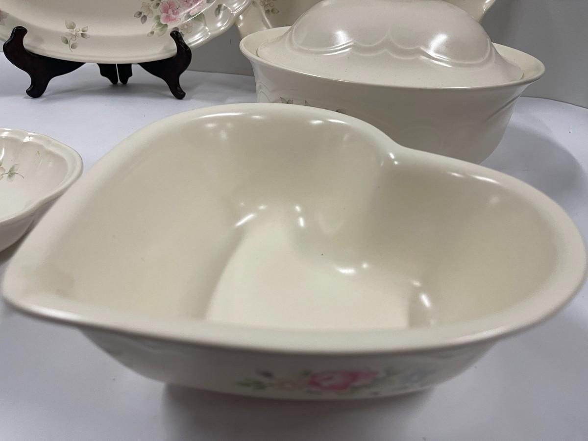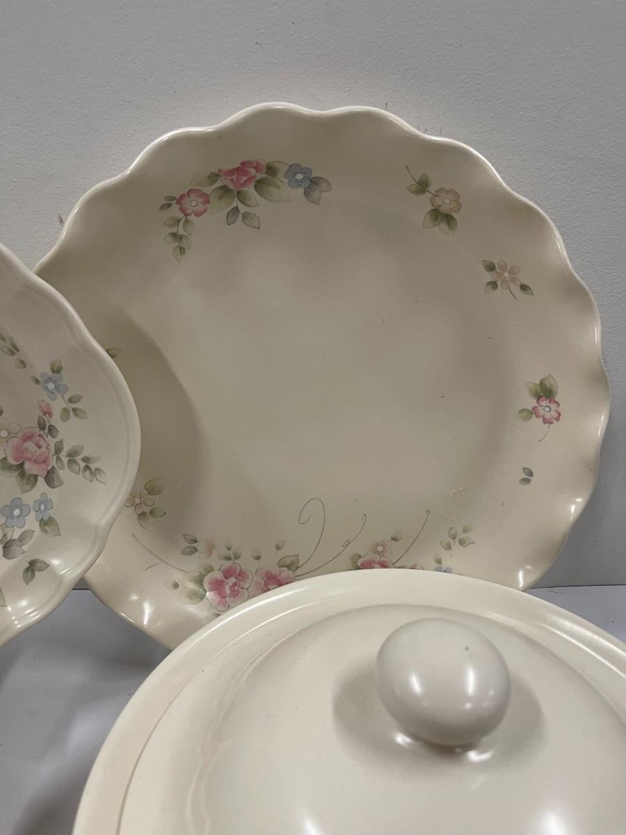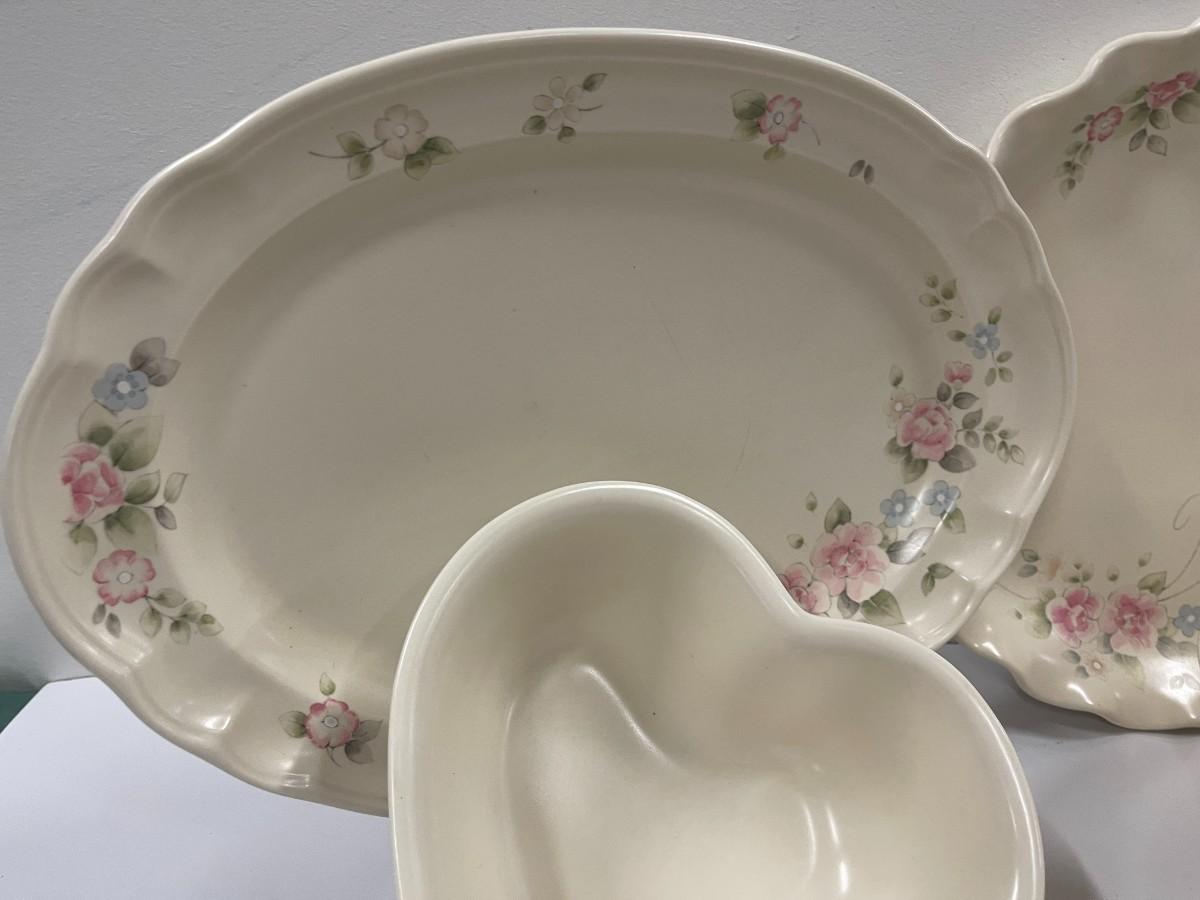 Vintage Pfaltzgraff Tearose serving dishes. Includes: covered vegetable, heart shaped dish, two oval serving platters and one round serving platter. All in very good condition.
