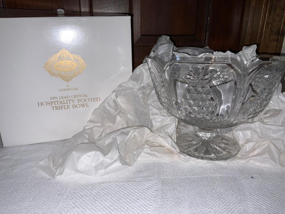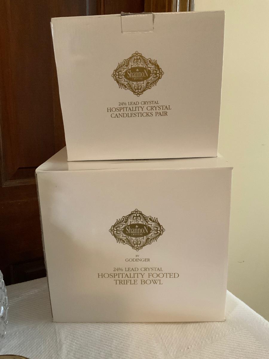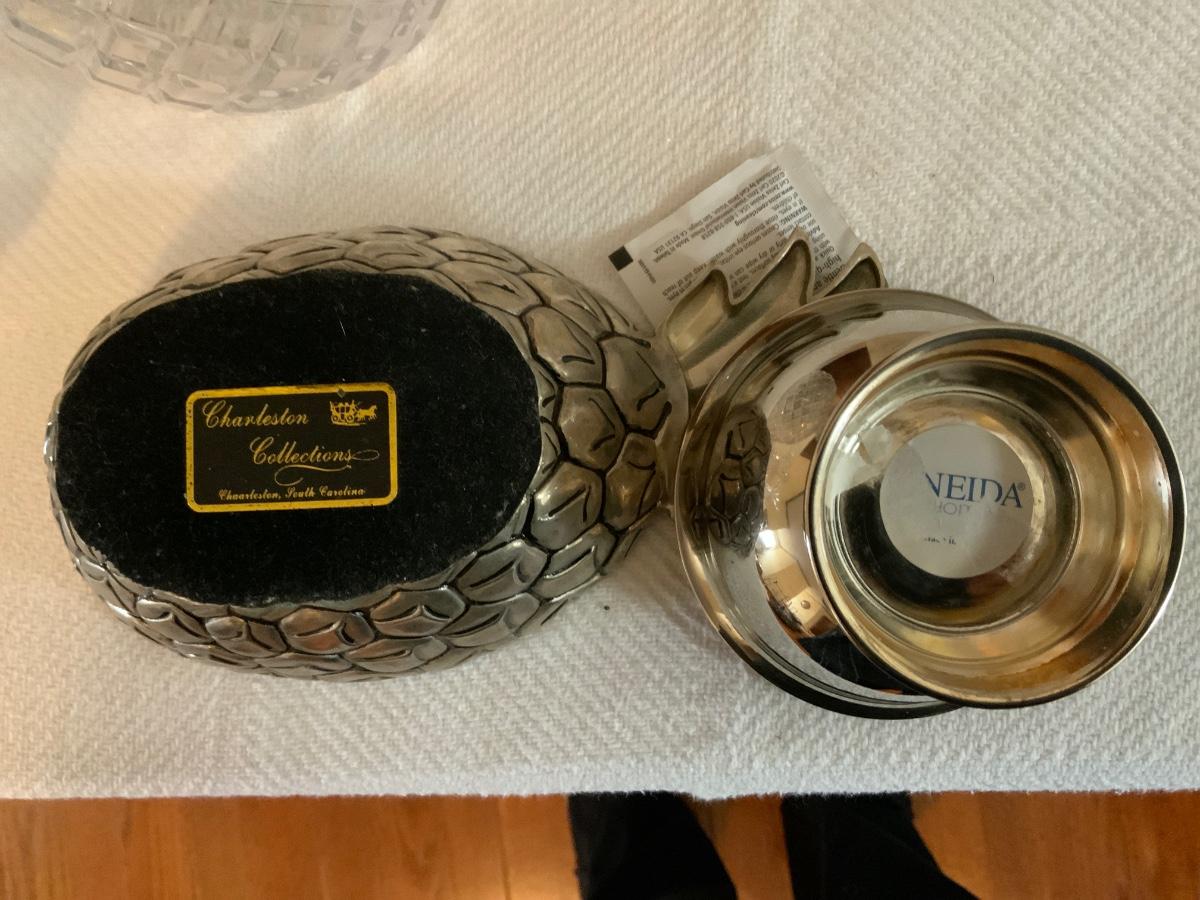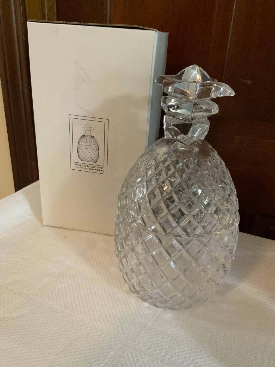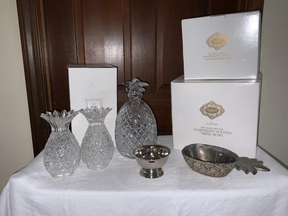 Lot of Pineapple themed Shannon Crystal. A footed Bowl, Candlesticks and a Biscuit barrel. Also includes 2 silver dishes.