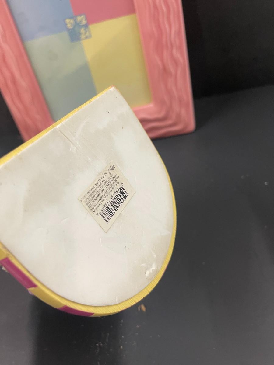 Lot of pink ceramic frame with a coordinating pair of book ends. Frame is for a 5" x 8" and bookends are 5" high. All in great shape.