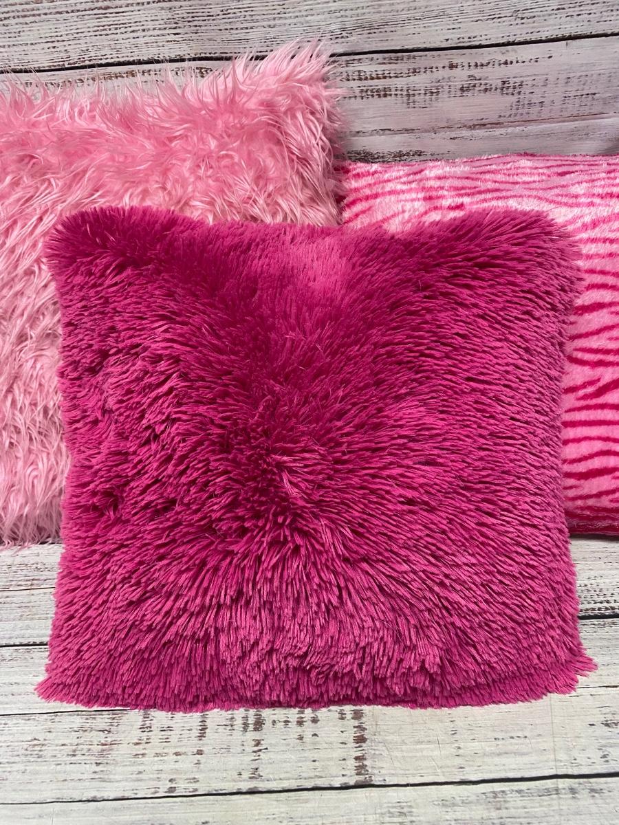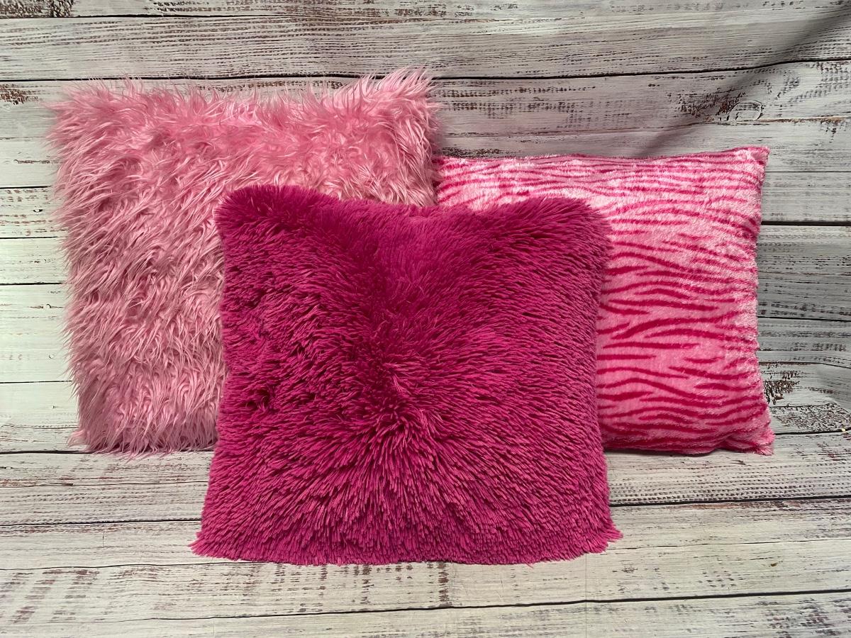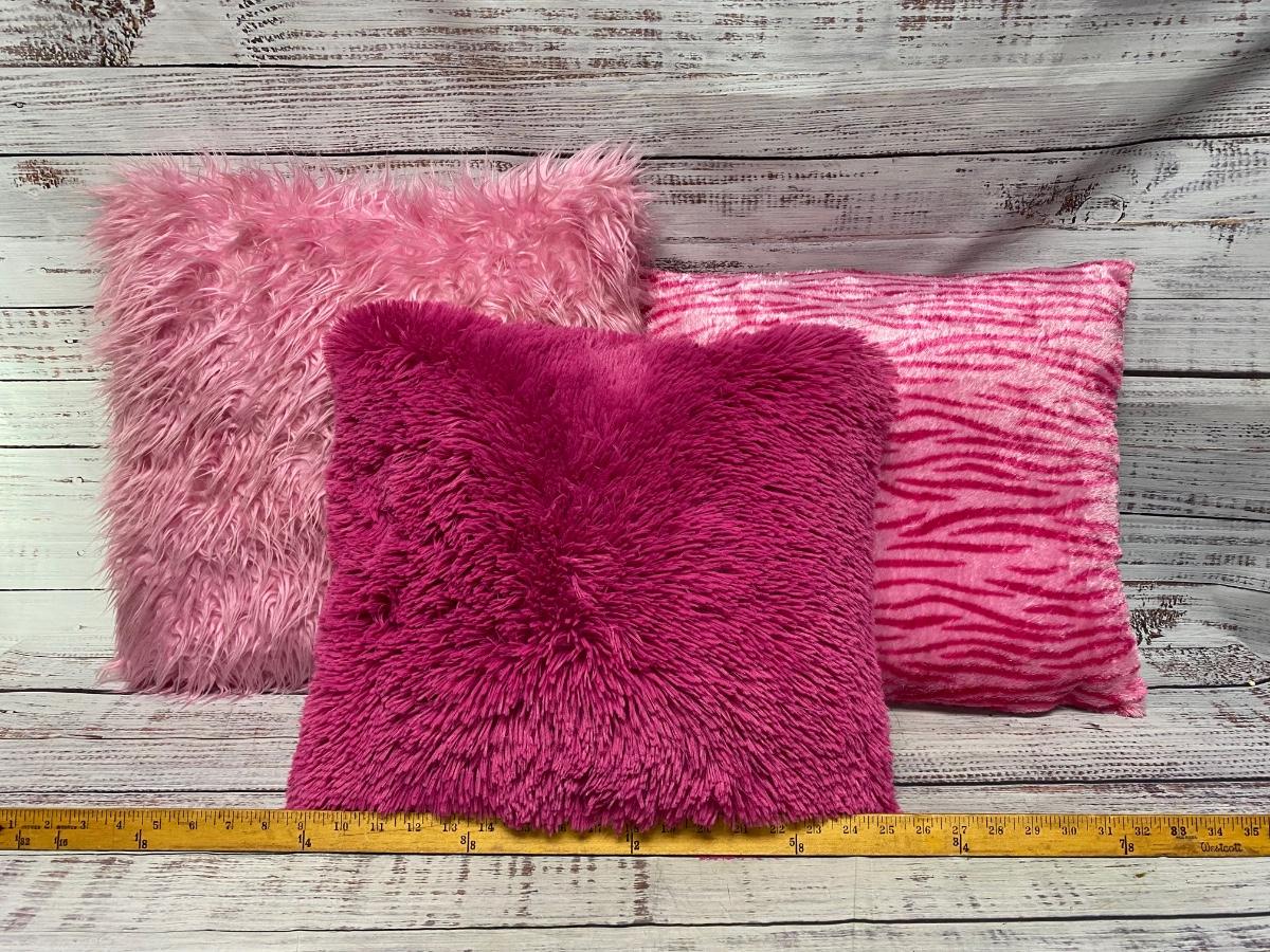 Lot of Pink Furry Fuzzy Pillows, there are no significant rips or tears to the pillows and is in good useable condition. Check pictures for more details and for sizing.
