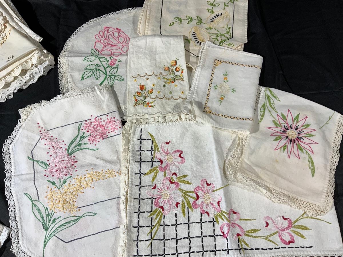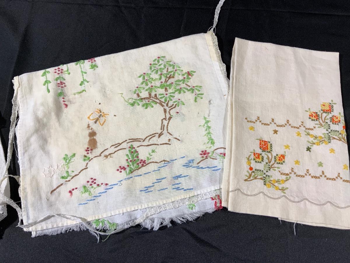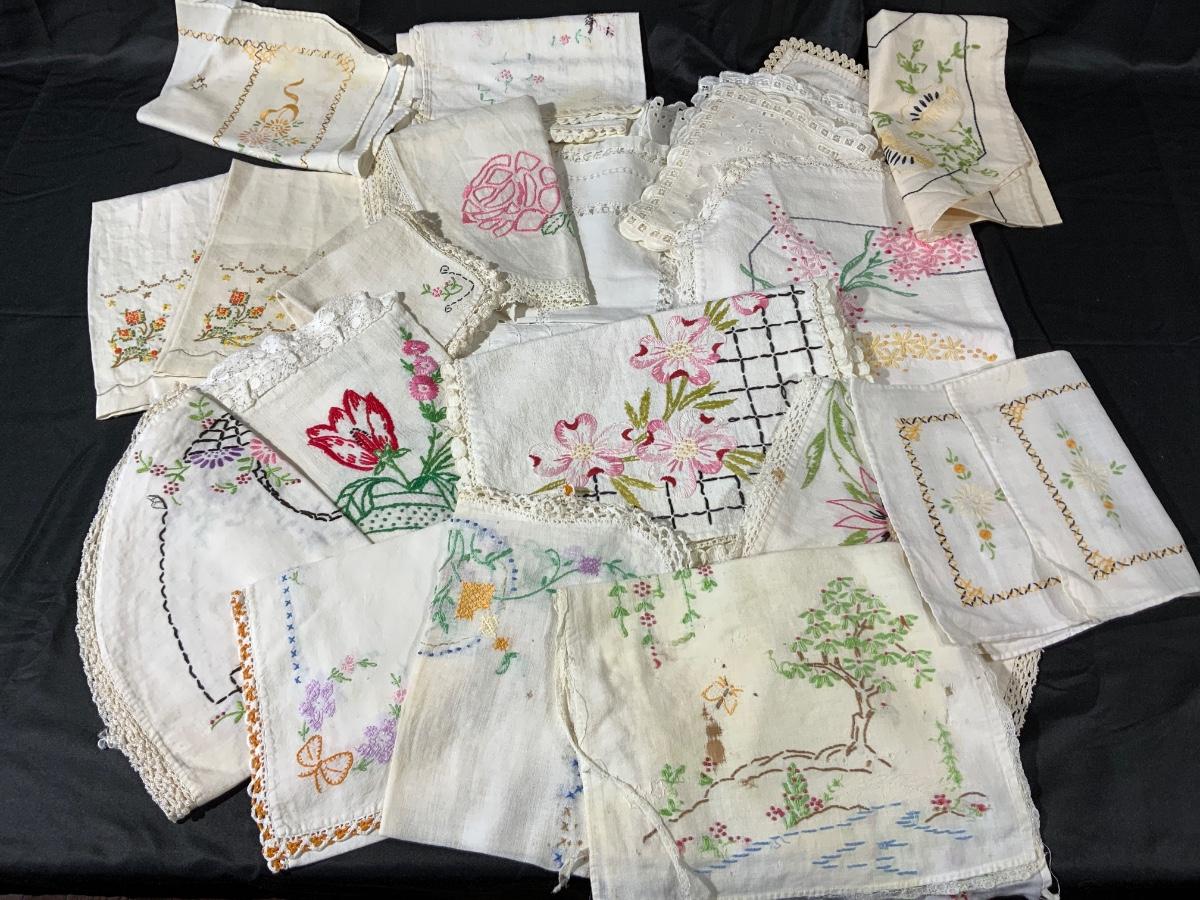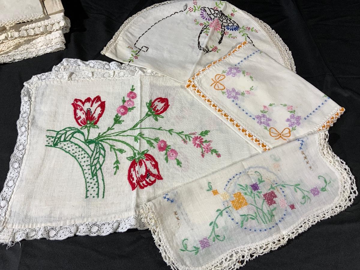 Lot of Pinks and Yellows and Greens embroidered linens including Dresser Scarves.