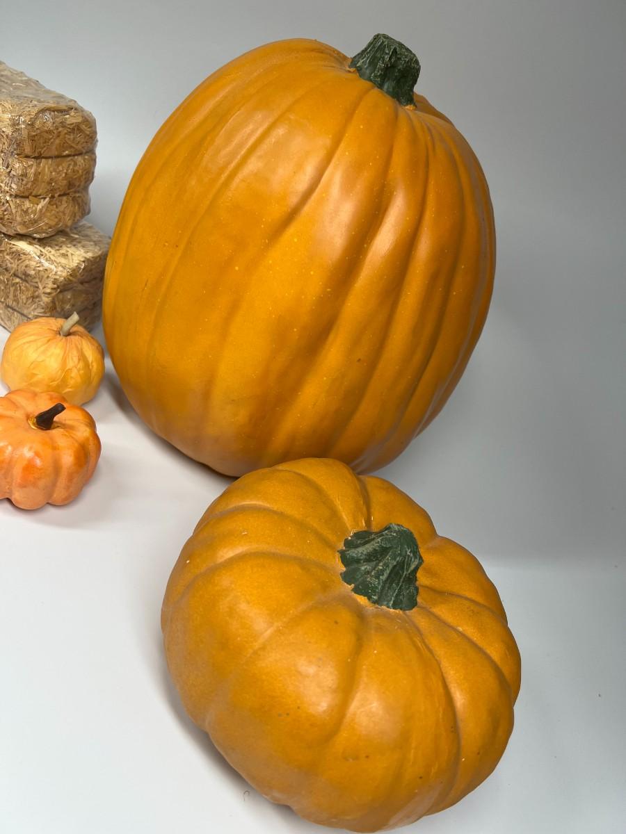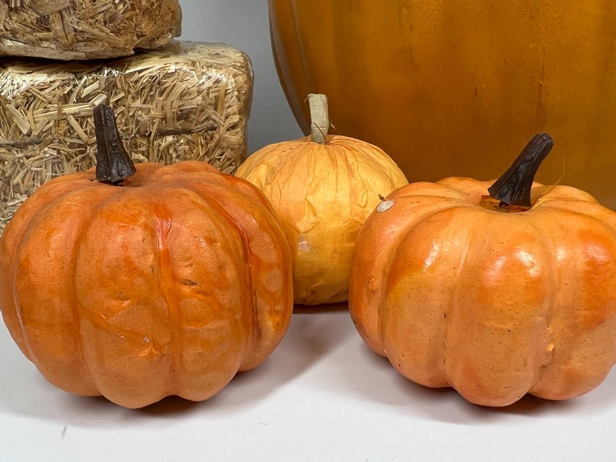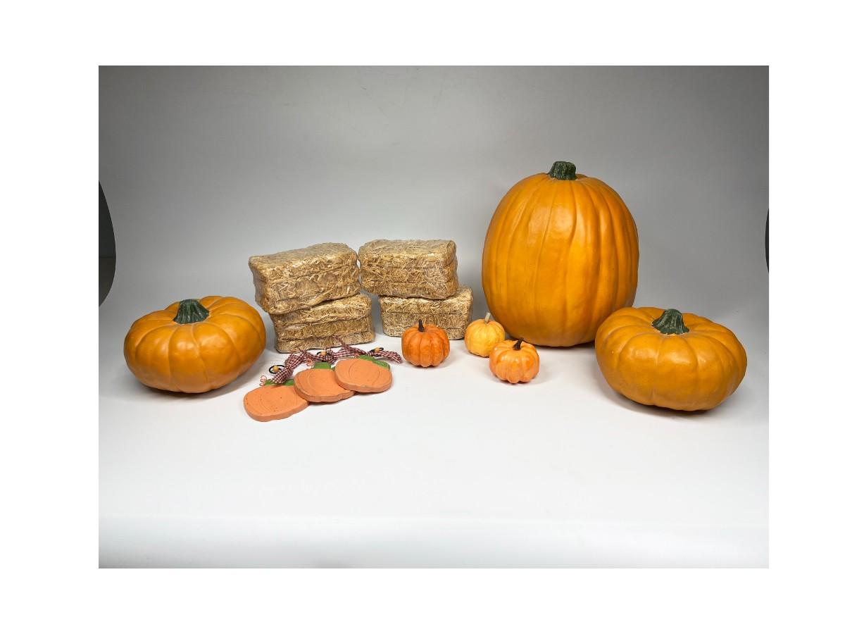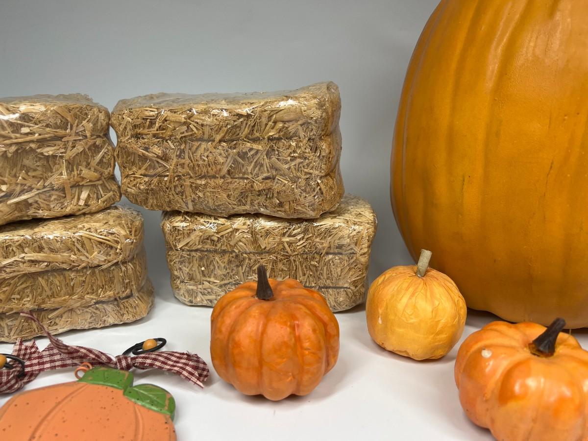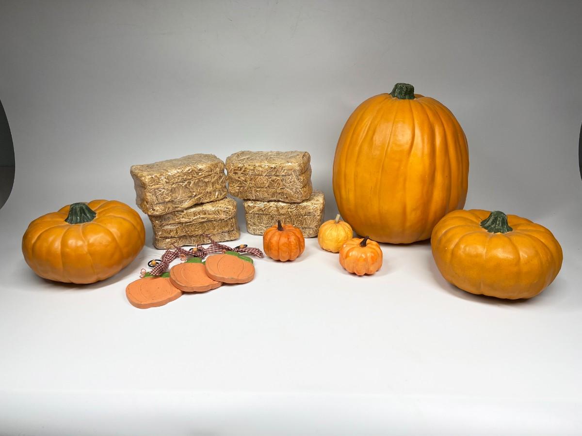 Lot of Plastic Foam Pumpkins, Wood Decor, Small Hay Bales & More