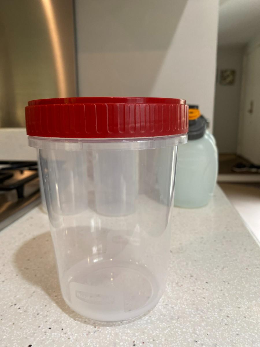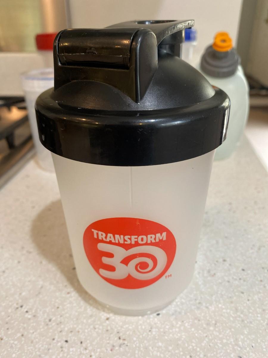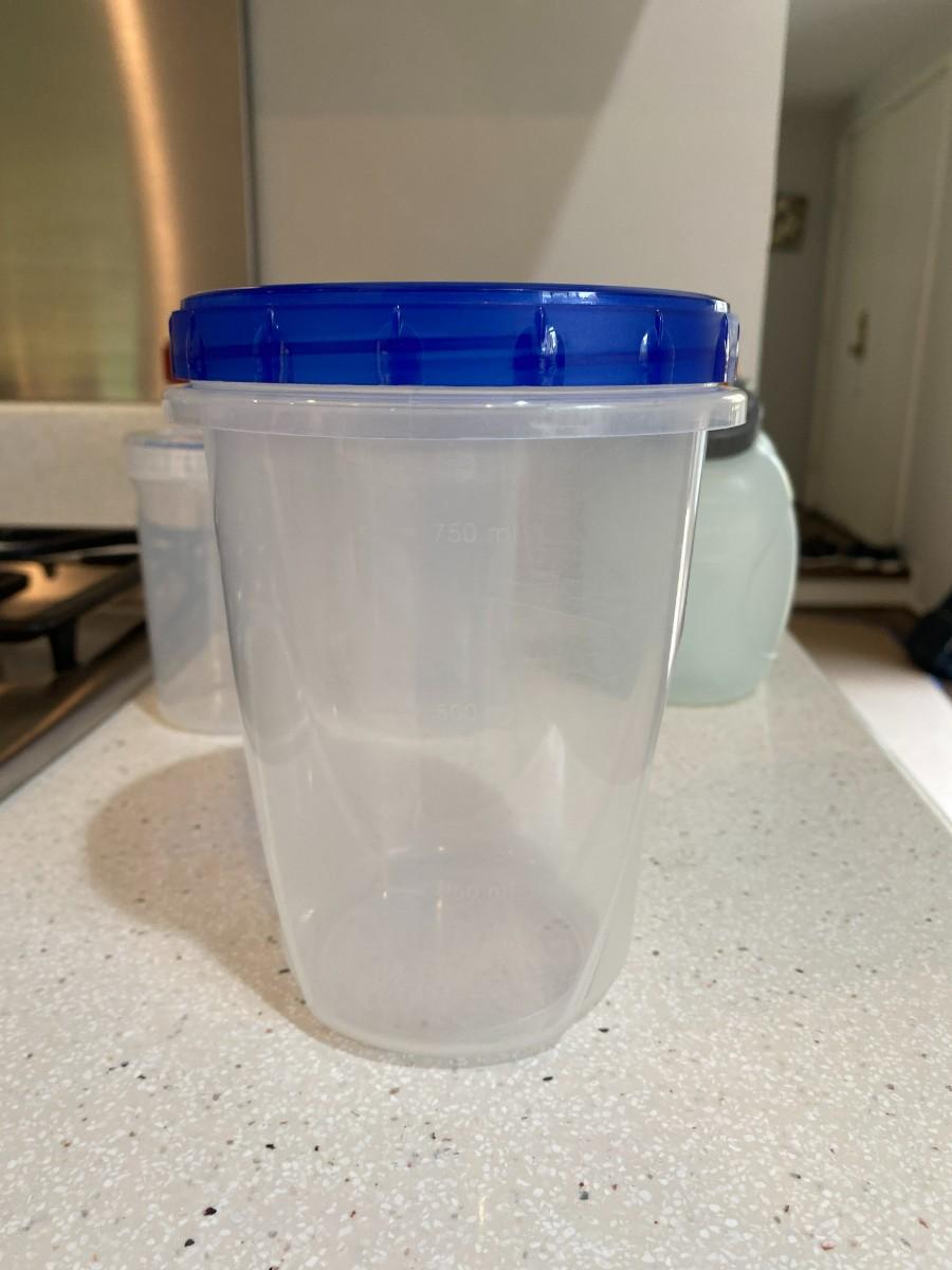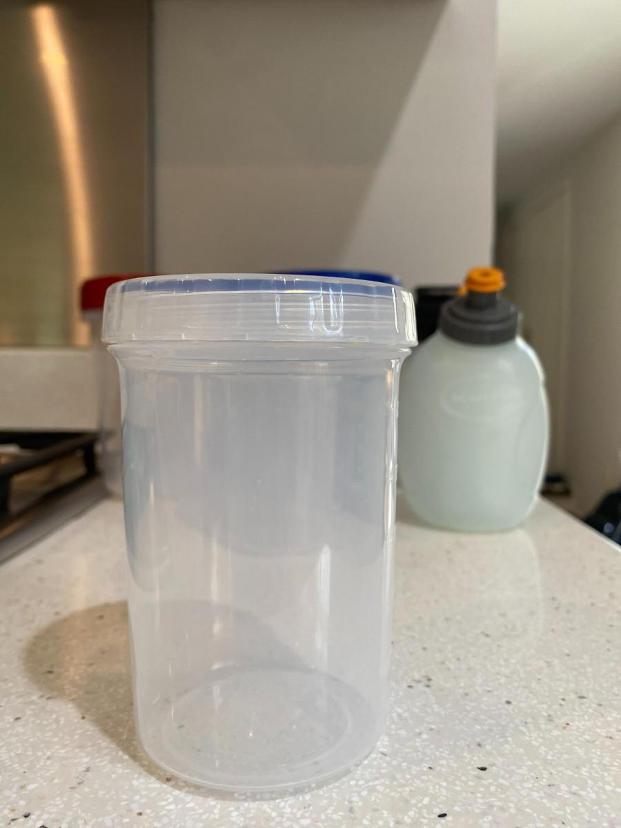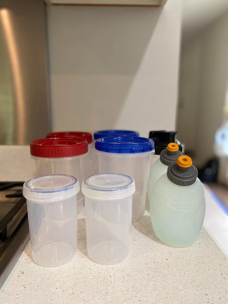Water bottles, protein shake bottle and containers with measurements included.