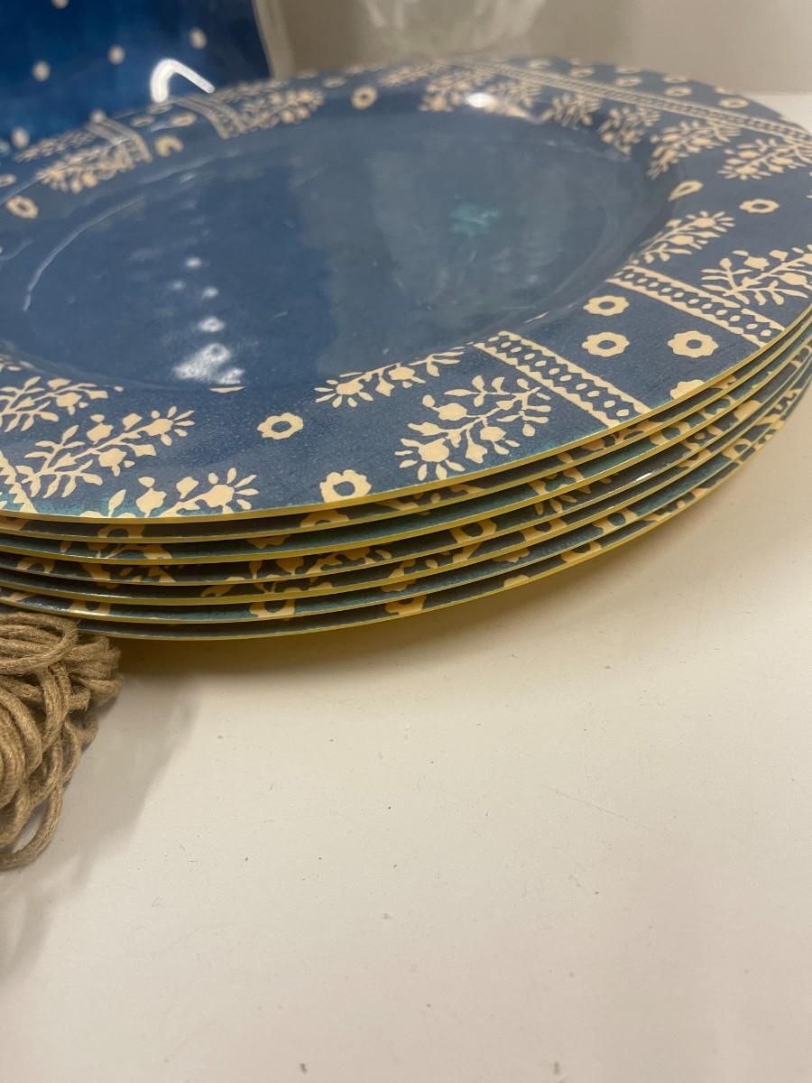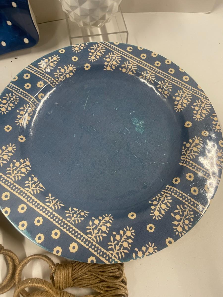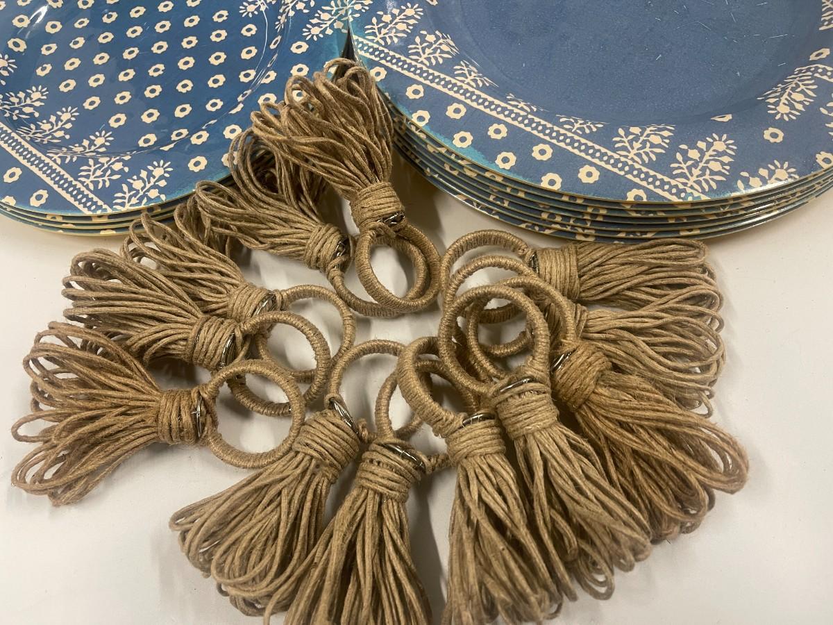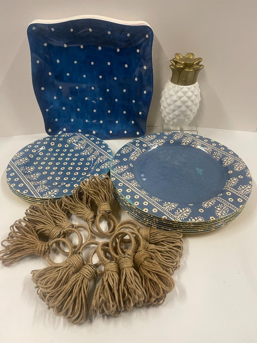 Lot of Plastic Outdoor Dishes, Pineapple Tiki Torch & 12 Napkin Rings. Some of the round dinner plates show a good amount of wear, the other pieces are in very good condition.