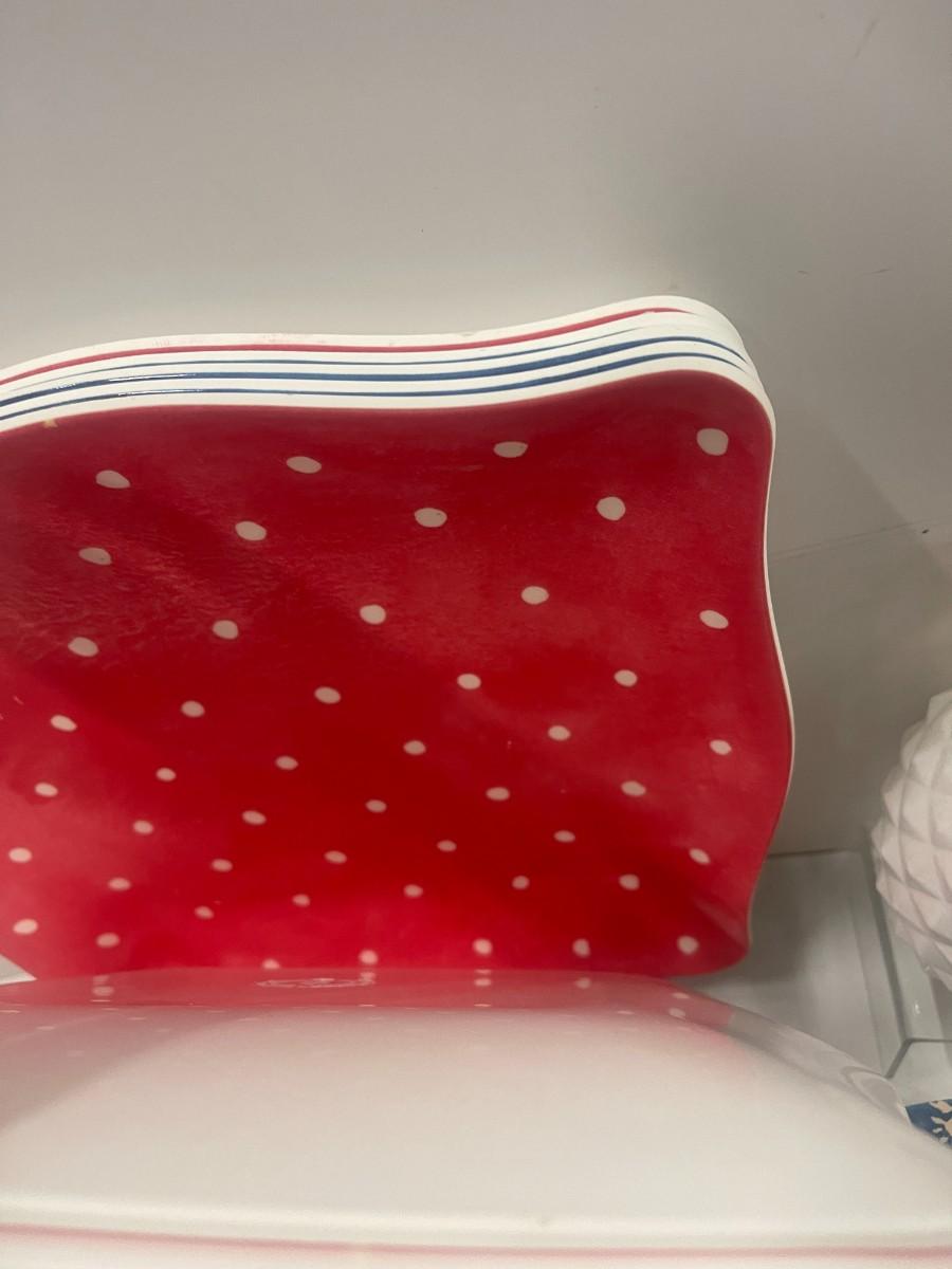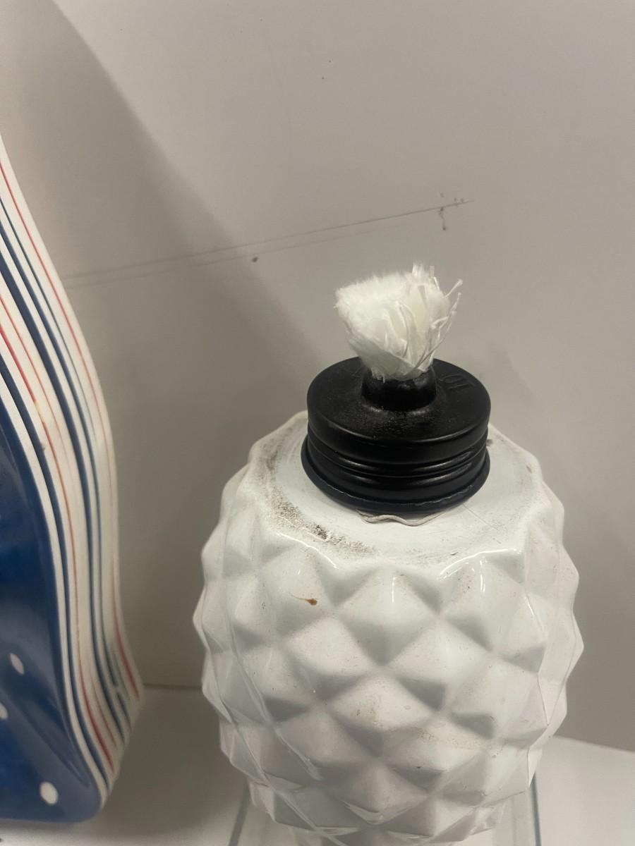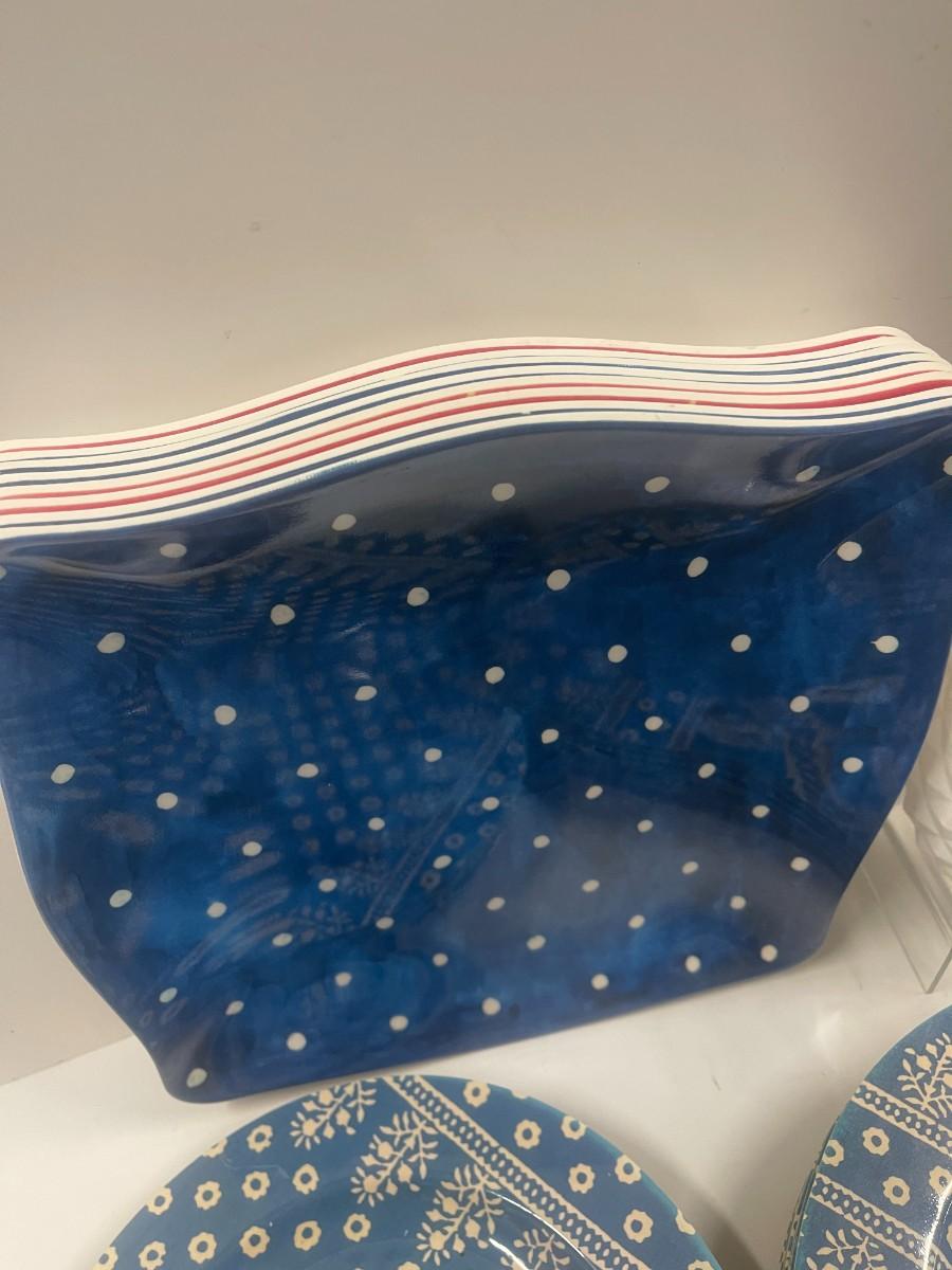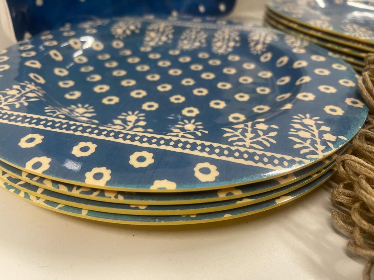 Lot of Plastic Outdoor Dishes, Pineapple Tiki Torch & 12 Napkin Rings. Some of the round dinner plates show a good amount of wear, the other pieces are in very good condition.