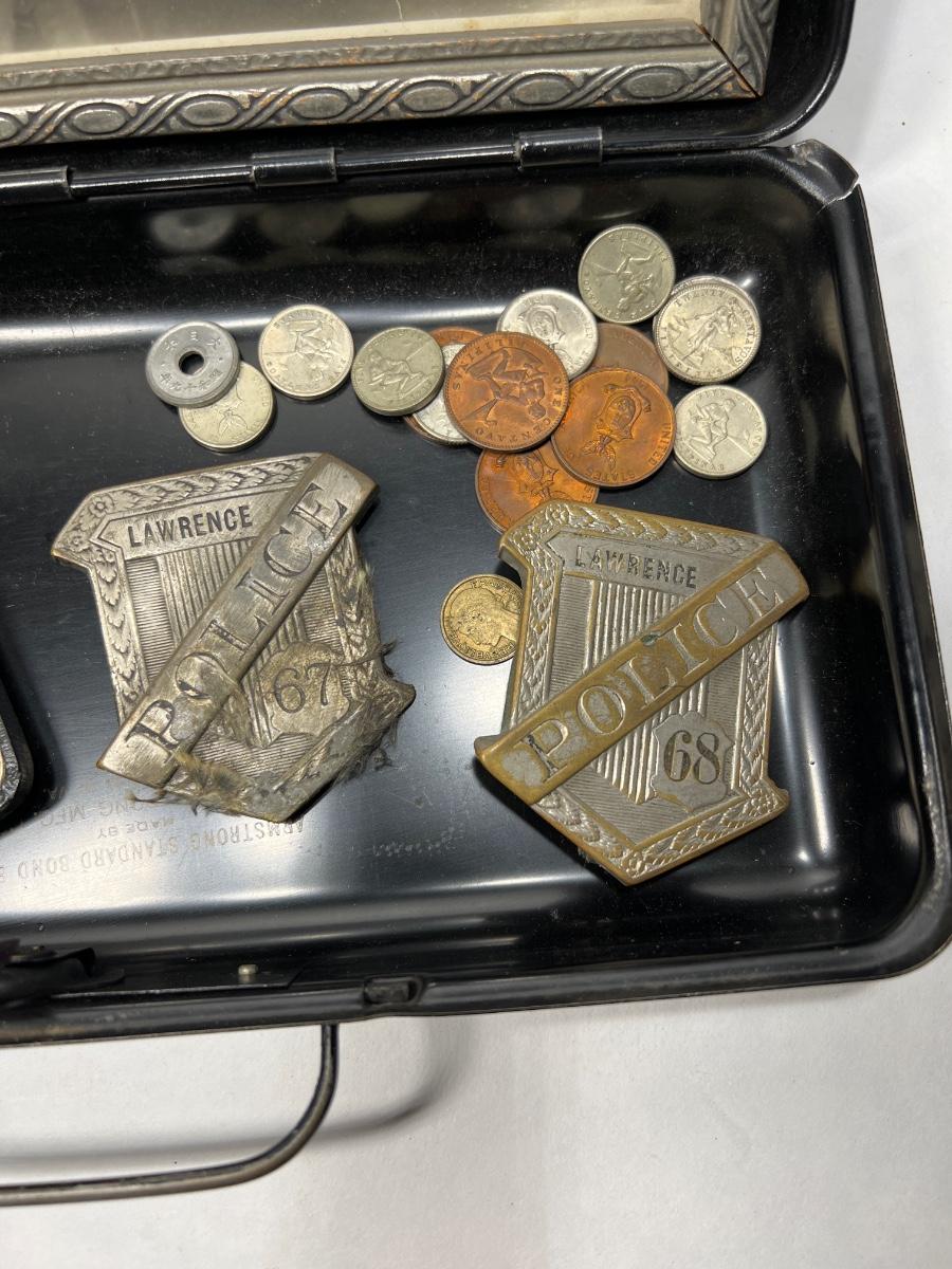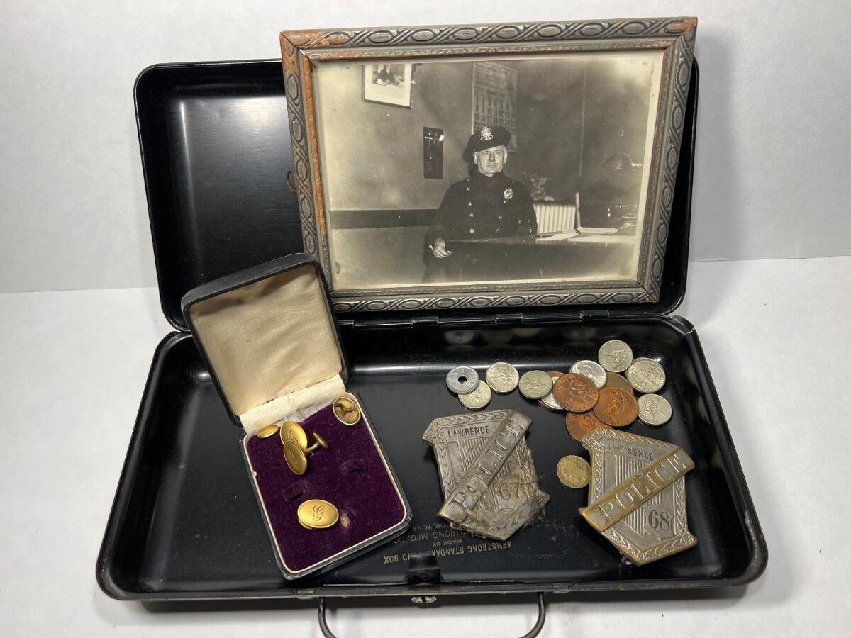 Lawrence Massachusetts Police Dept Early badges, law enforcement officer photograph, coins and jewelry
