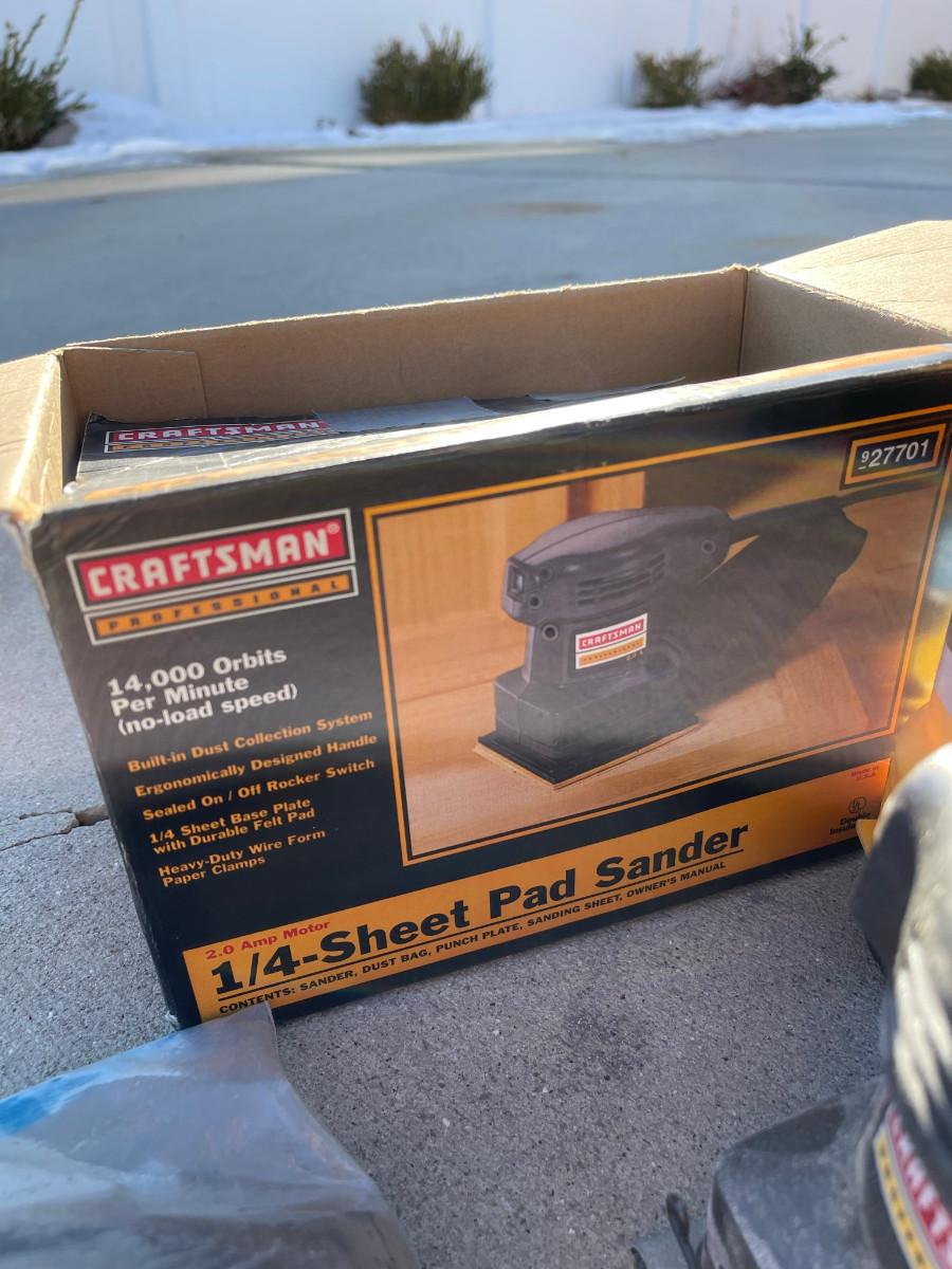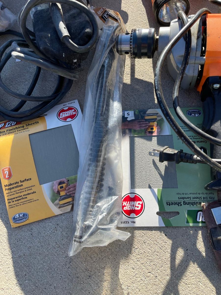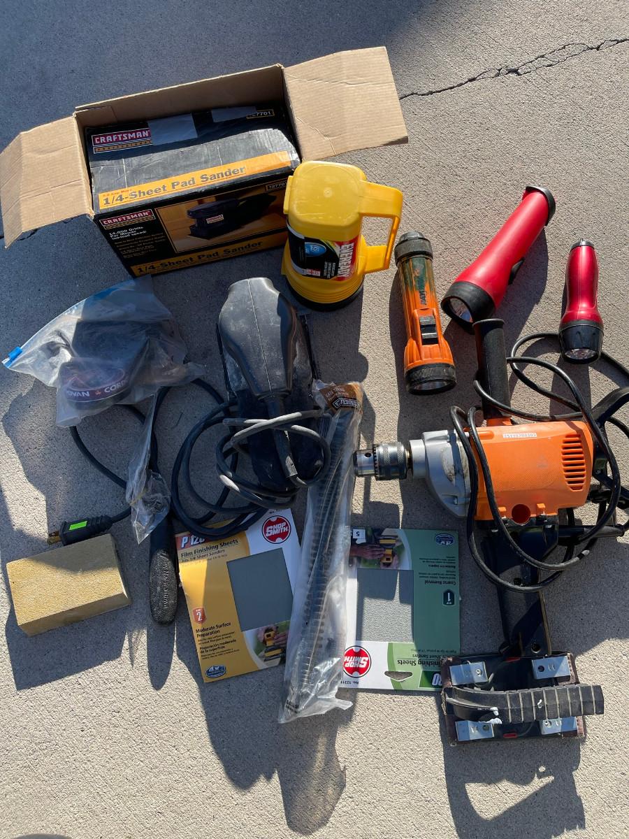 Industrial Power Drill, Pad Sander, Flashlights, Sandpaper- See photos for additonal details