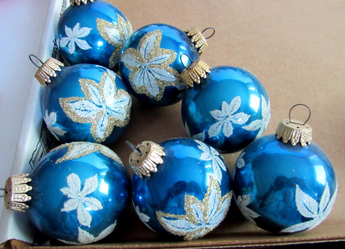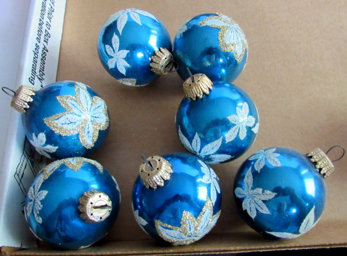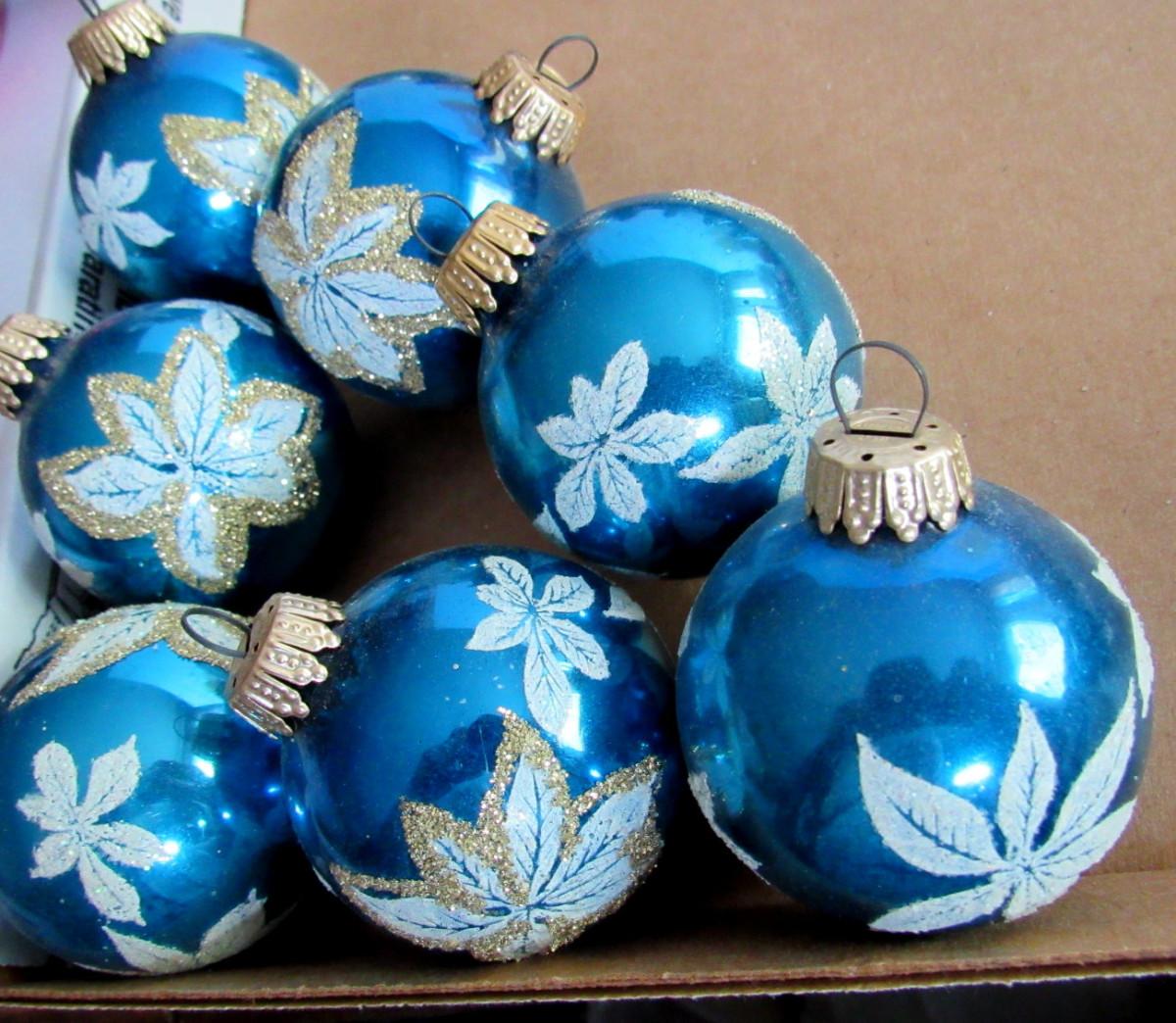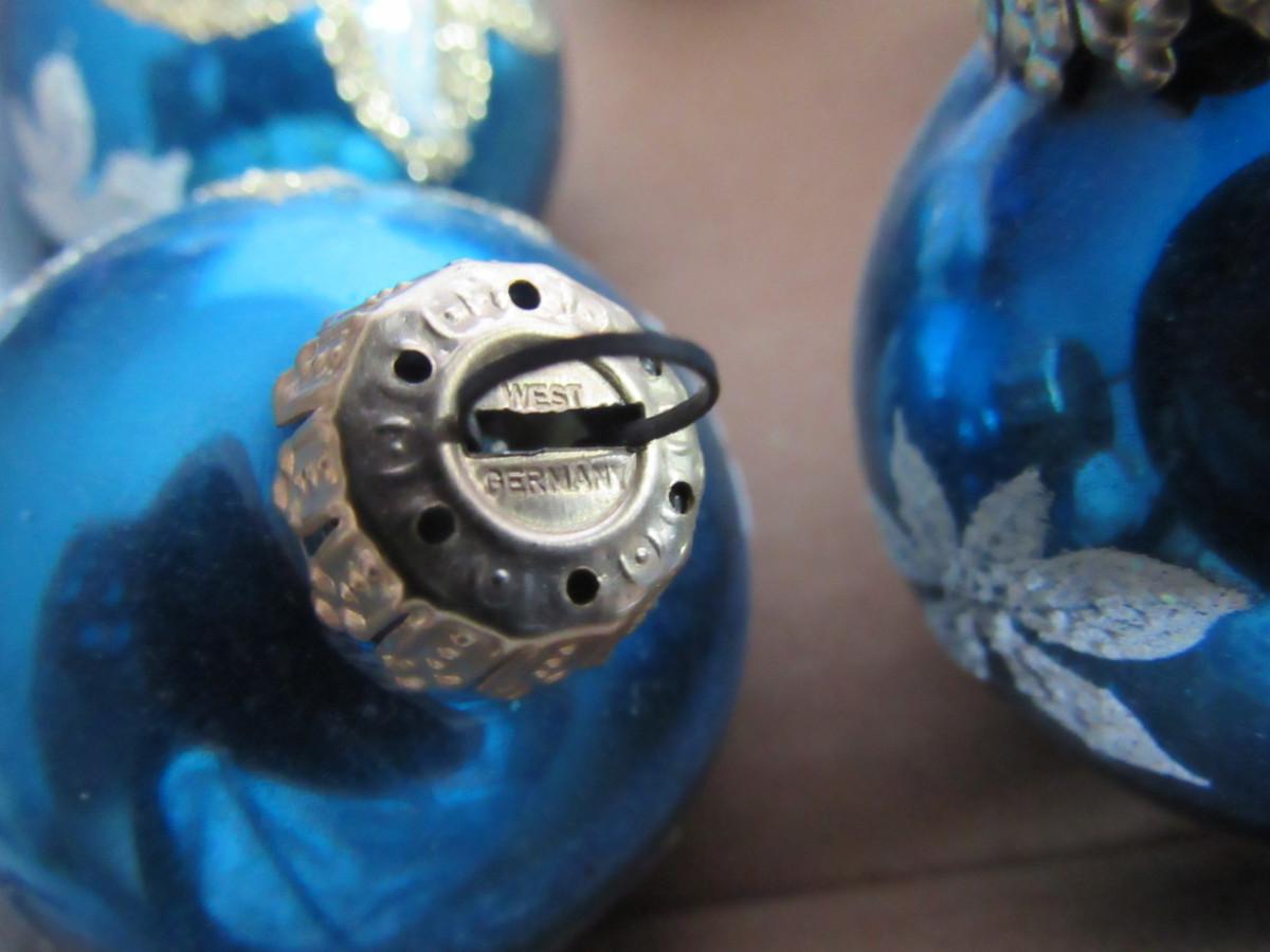 Lot of Pretty Blue and White Glitter Christmas Ball Ornaments, West Germany