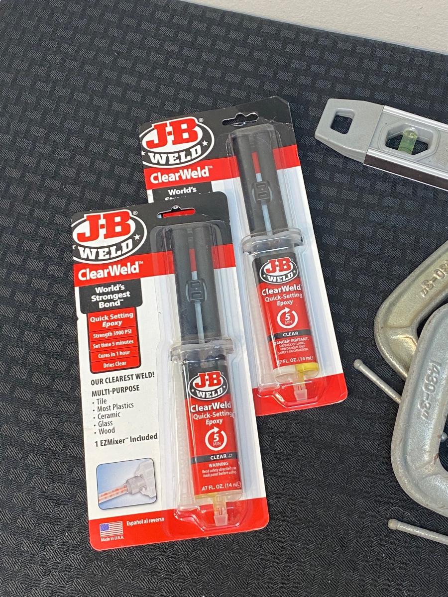 Lot of Quick Setting Epoxy, Gorilla Glue, Clamps, and Measuring Level, there is no damage to any of the pieces, the glues come new still in the packaging. Check pictures for more details.