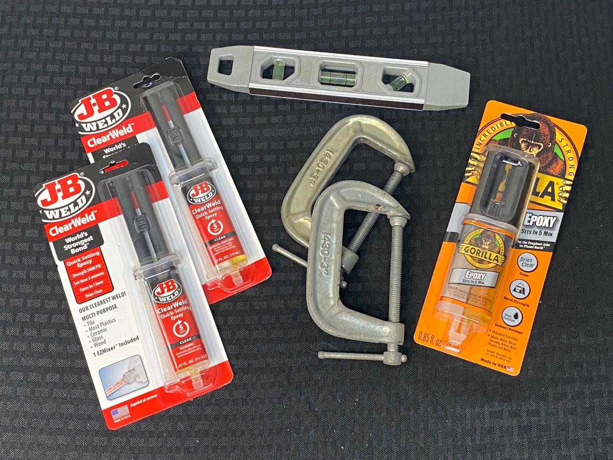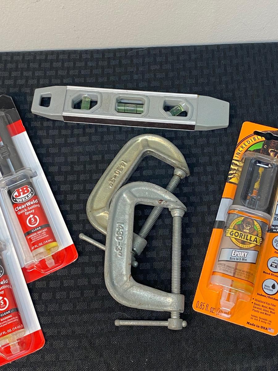 Lot of Quick Setting Epoxy, Gorilla Glue, Clamps, and Measuring Level