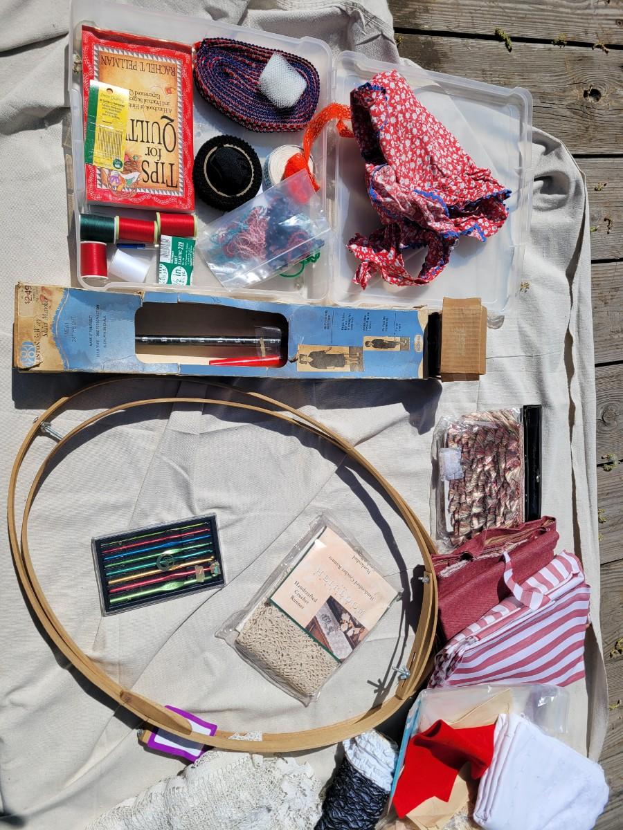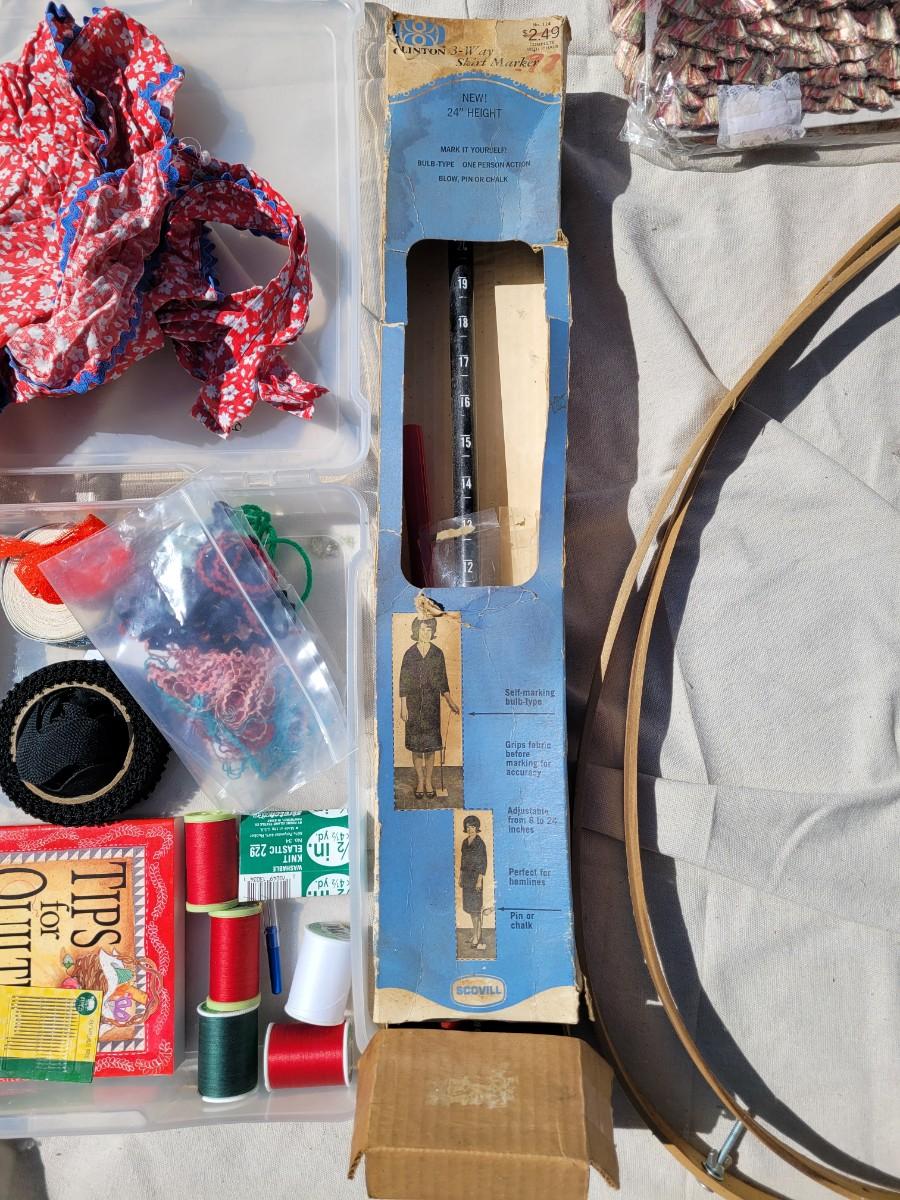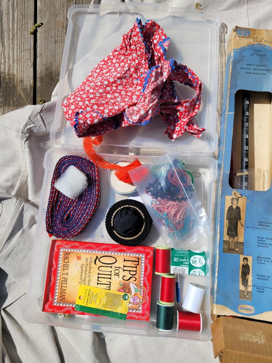 Looks like there's some thread some quilting needles, the skirt marker, an old apron, a quilt Loom, some fabric, and everything pictured.