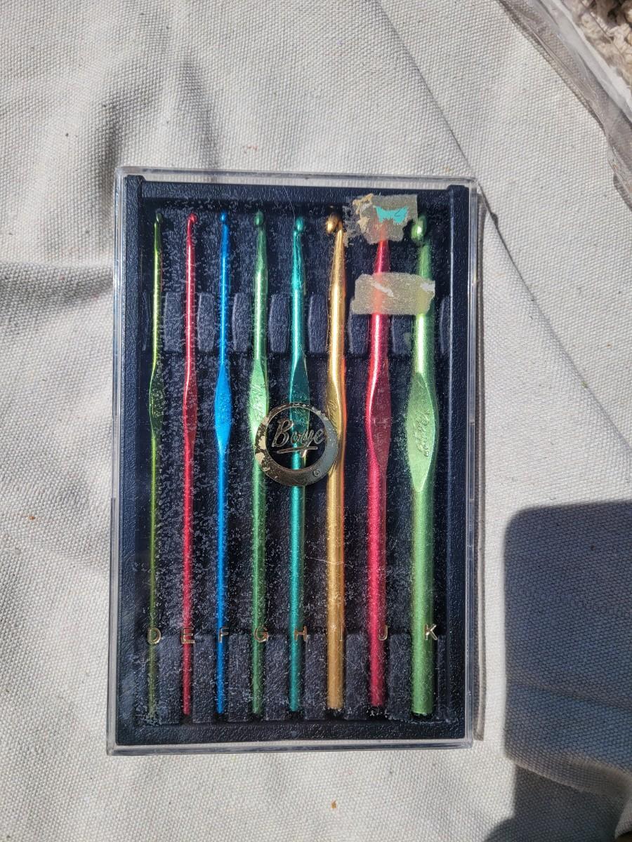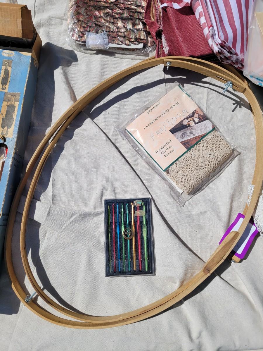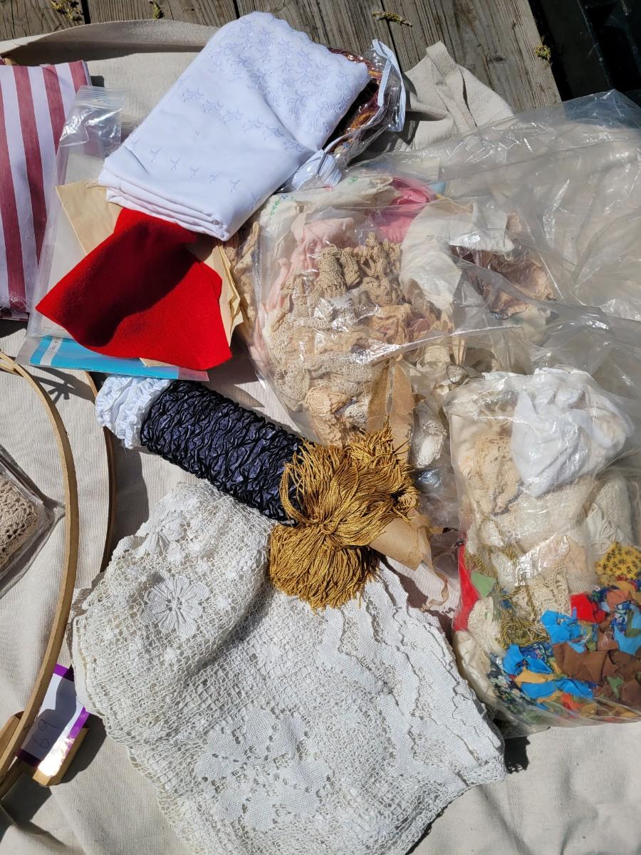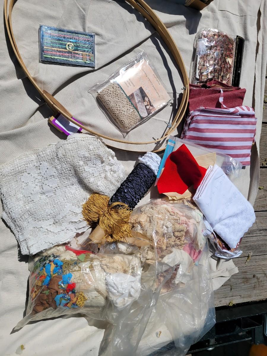 Looks like there's some thread some quilting needles, the skirt marker, an old apron, a quilt Loom, some fabric, and everything pictured.