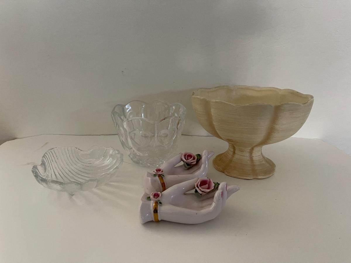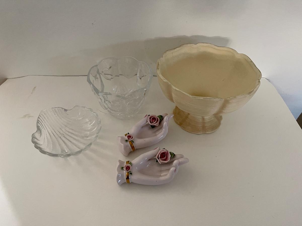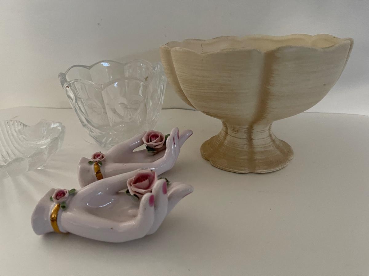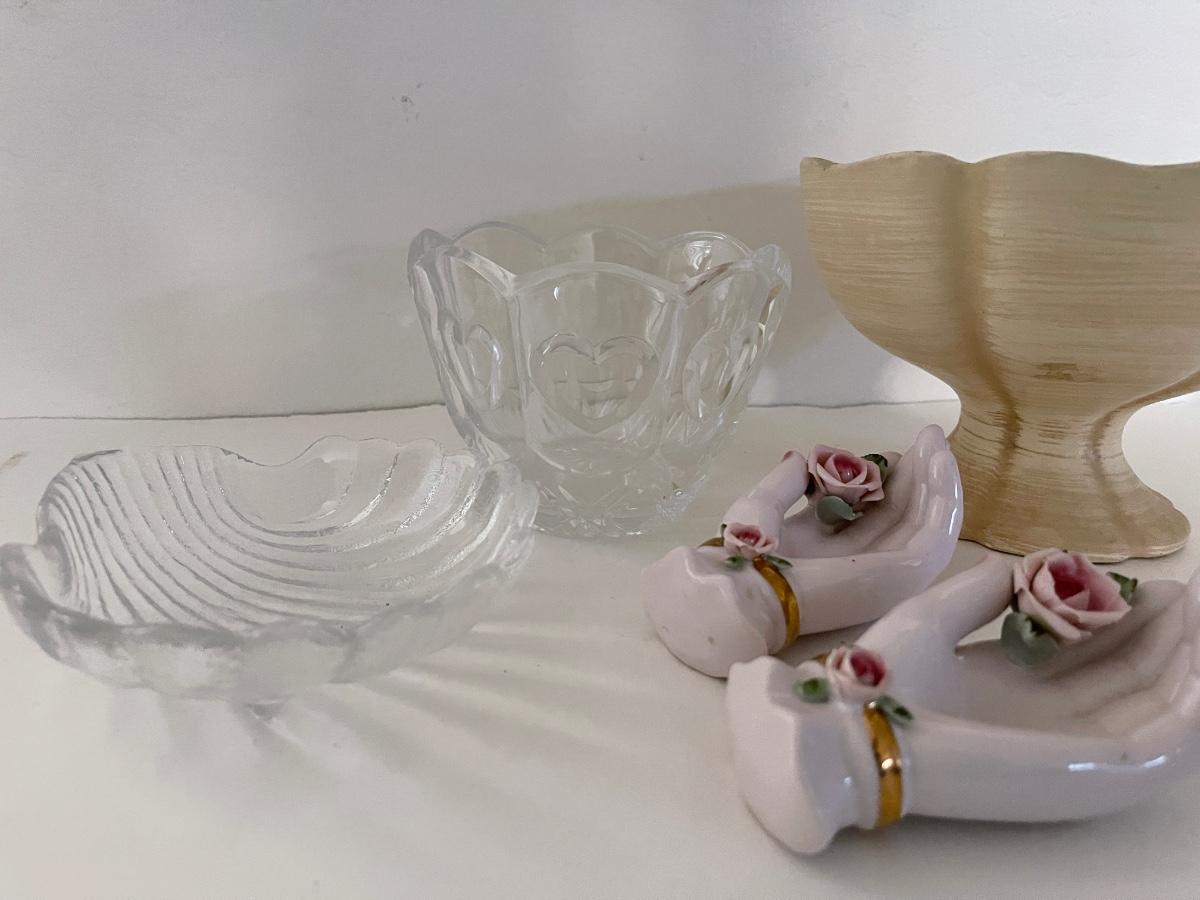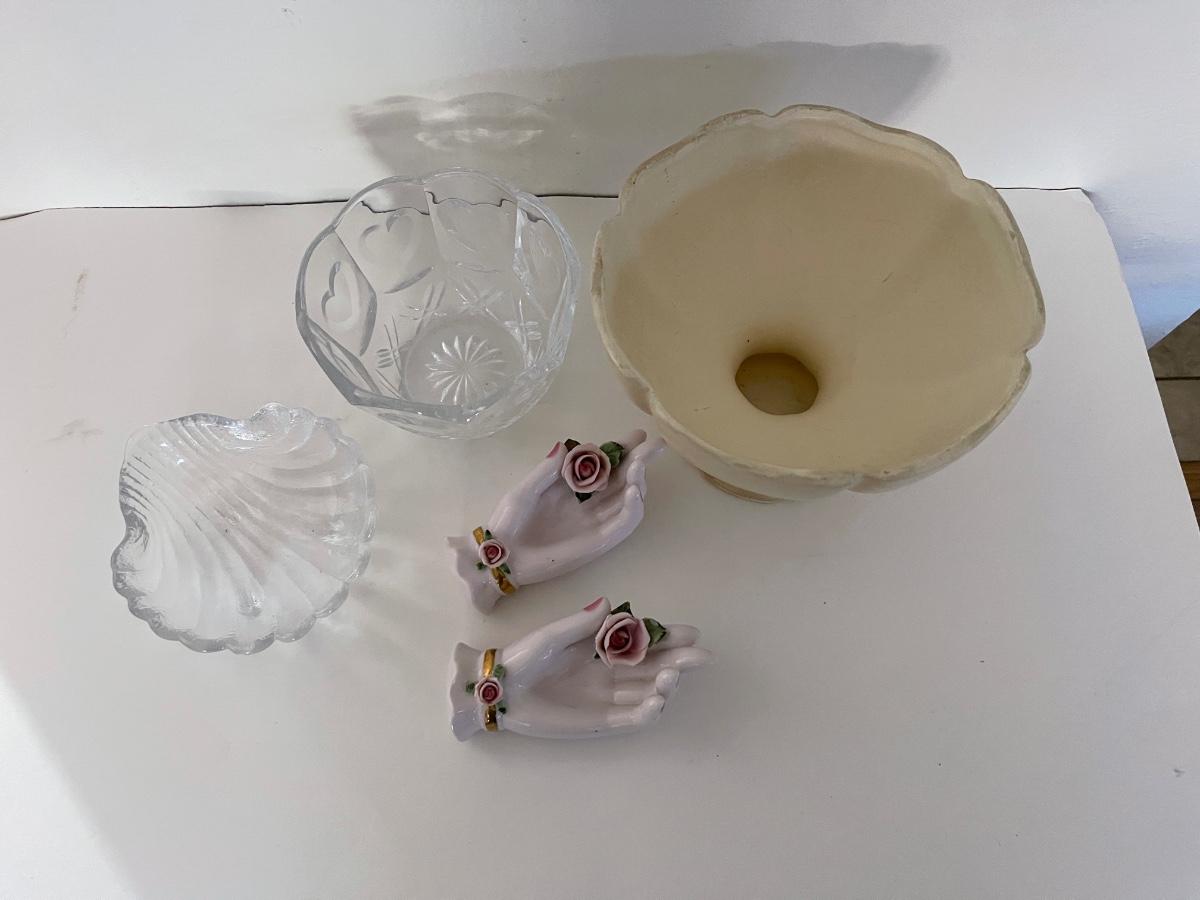 Lot of Random items, case, glass hands, Shell trinket holder, Glass heart bowl