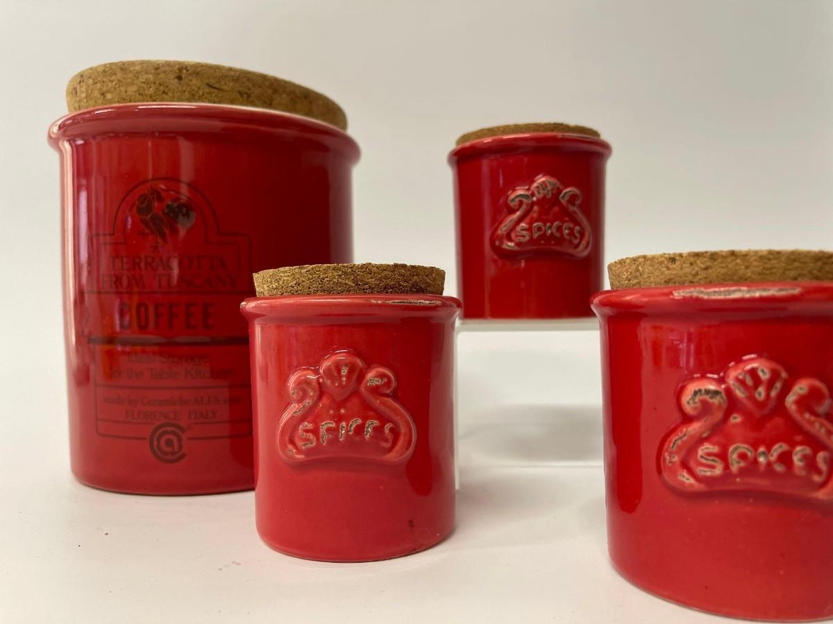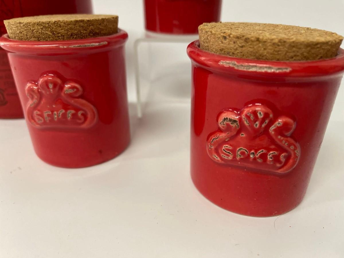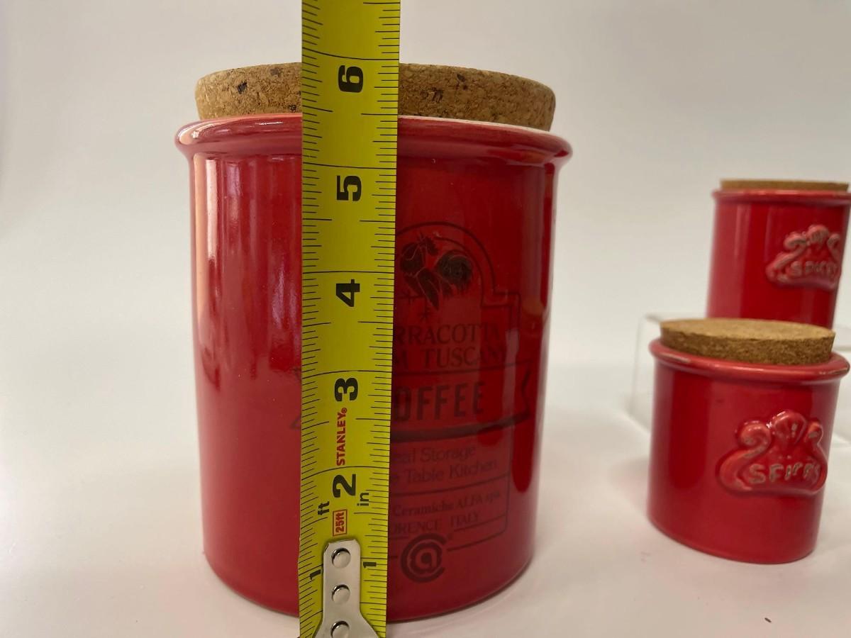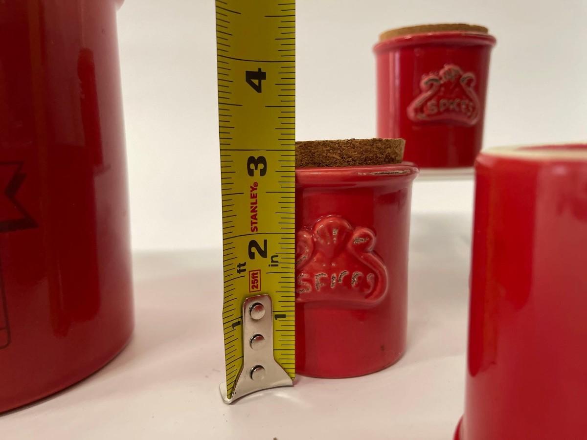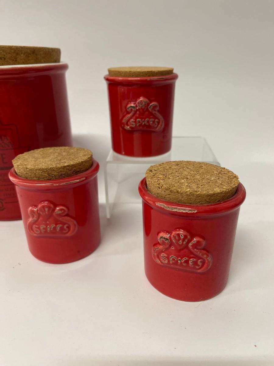Lot of Sur La Table Canisters. Includes one coffee canisters and 3 coordinating spice jars, all red with cork tops. Intentional distressing here and there along the rims, examine photos carefully for condition.