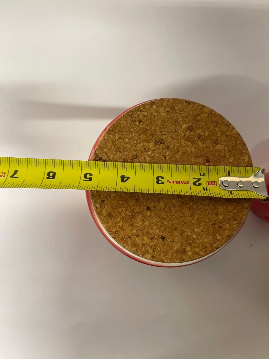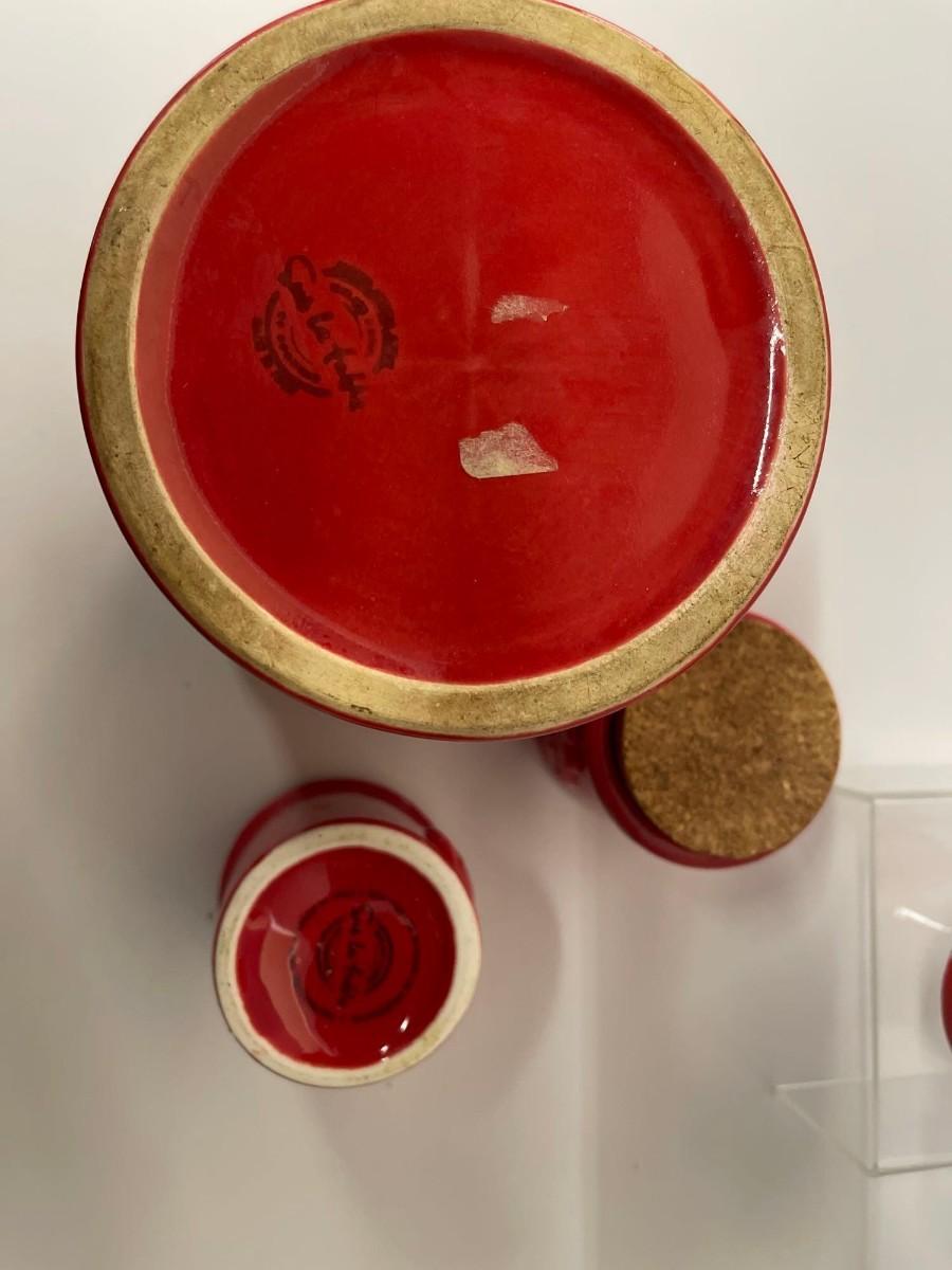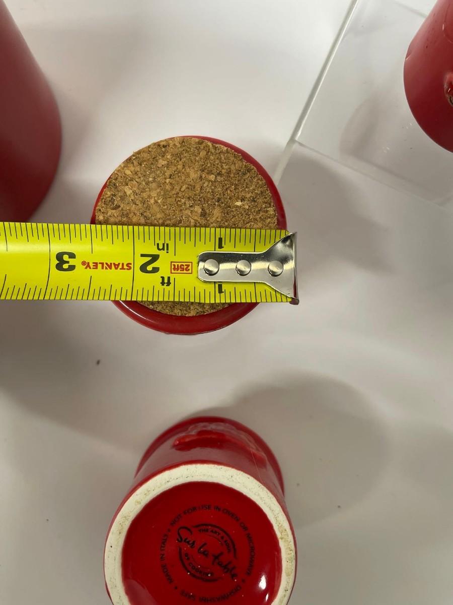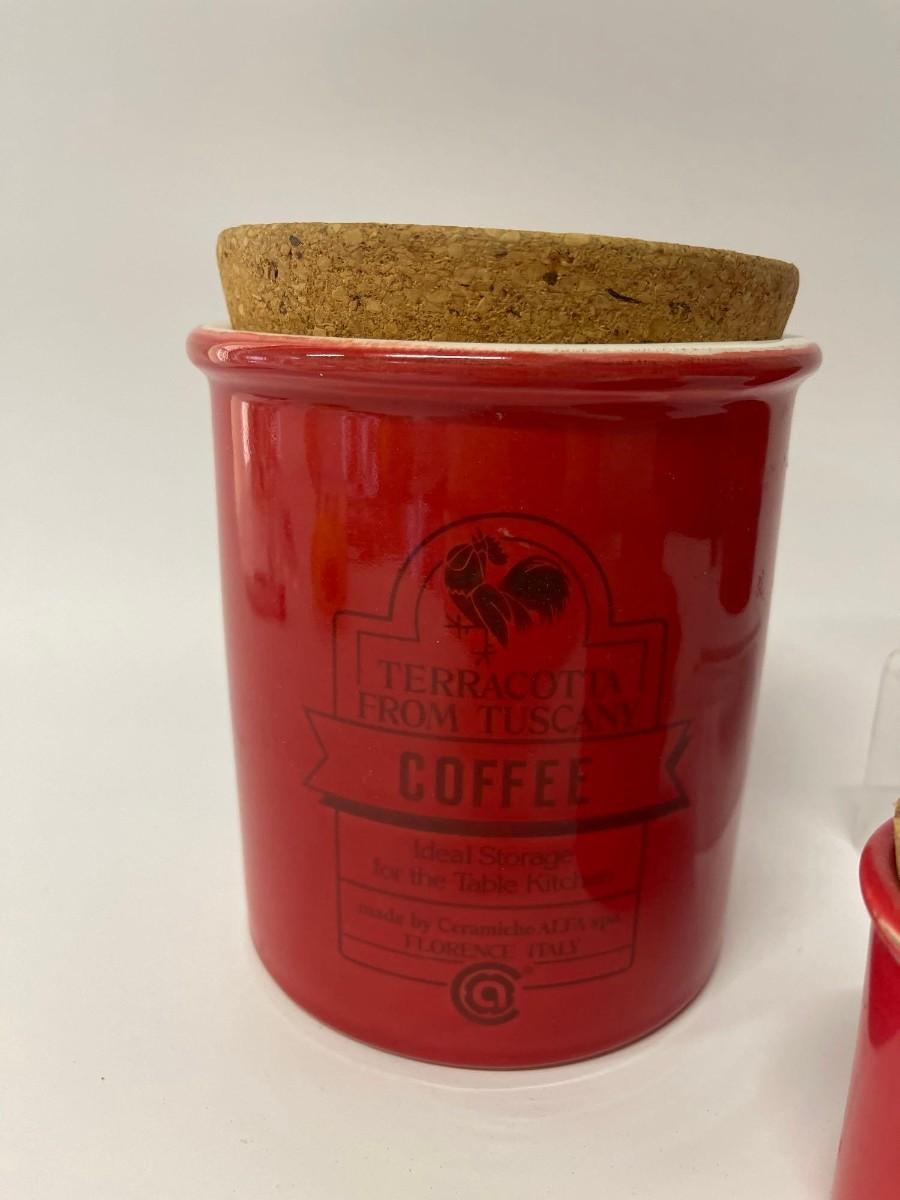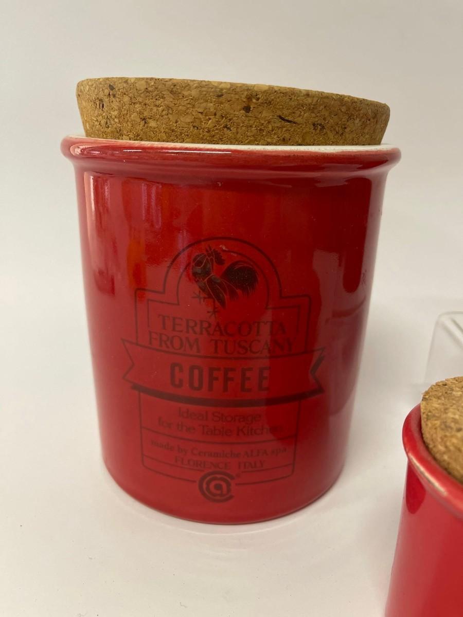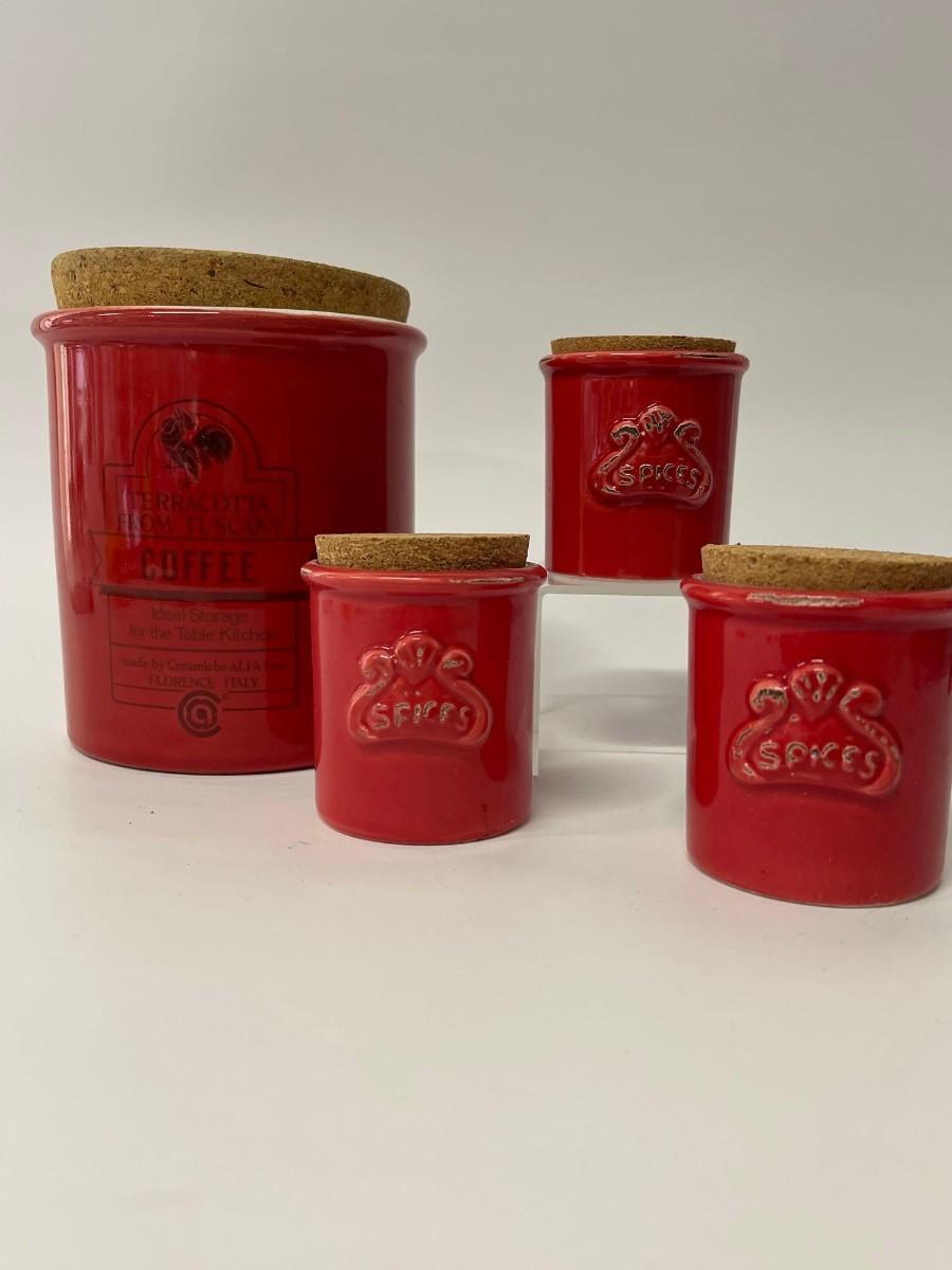 Lot of Sur La Table Canisters. Includes one coffee canisters and 3 coordinating spice jars, all red with cork tops. Intentional distressing here and there along the rims, examine photos carefully for condition.