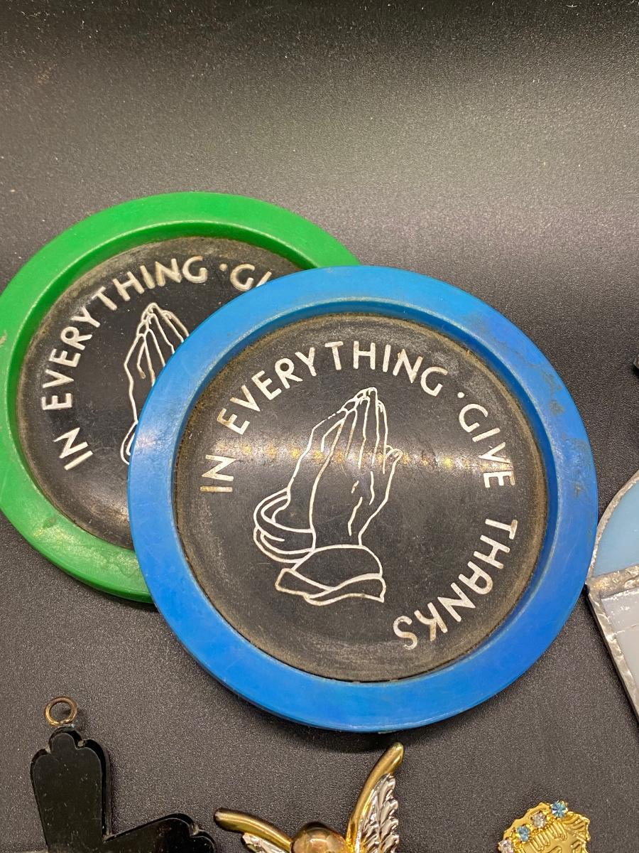 Lot of Religious Home Decor, Trinkets, Pins, Church Souvenirs & More, there is no significant damage to any of the pieces included in the lot and are in good condition. Check pictures for what is included and for sizing.