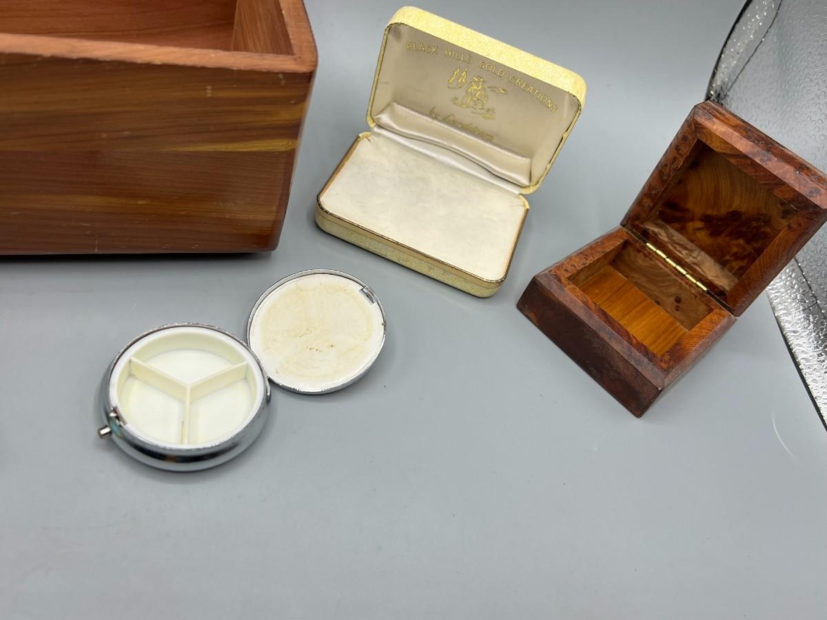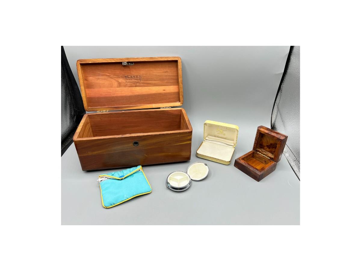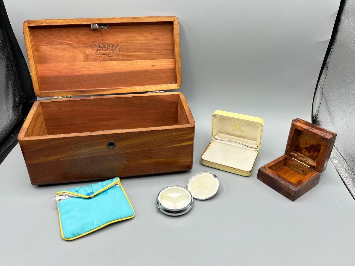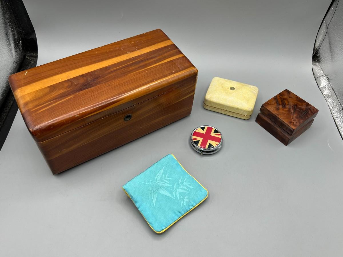 Lot of Retro Jewelry Trinket Ring Boxes & Storage, there is some light wear, but there is no significant damage to the boxes and is in good useable condition. The cedar wood jewelry box does not come with the locking key, check pictures for more details and for sizing.