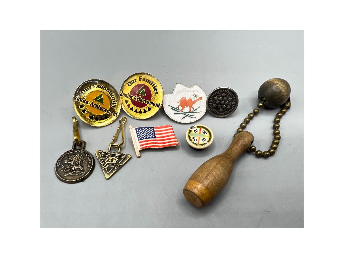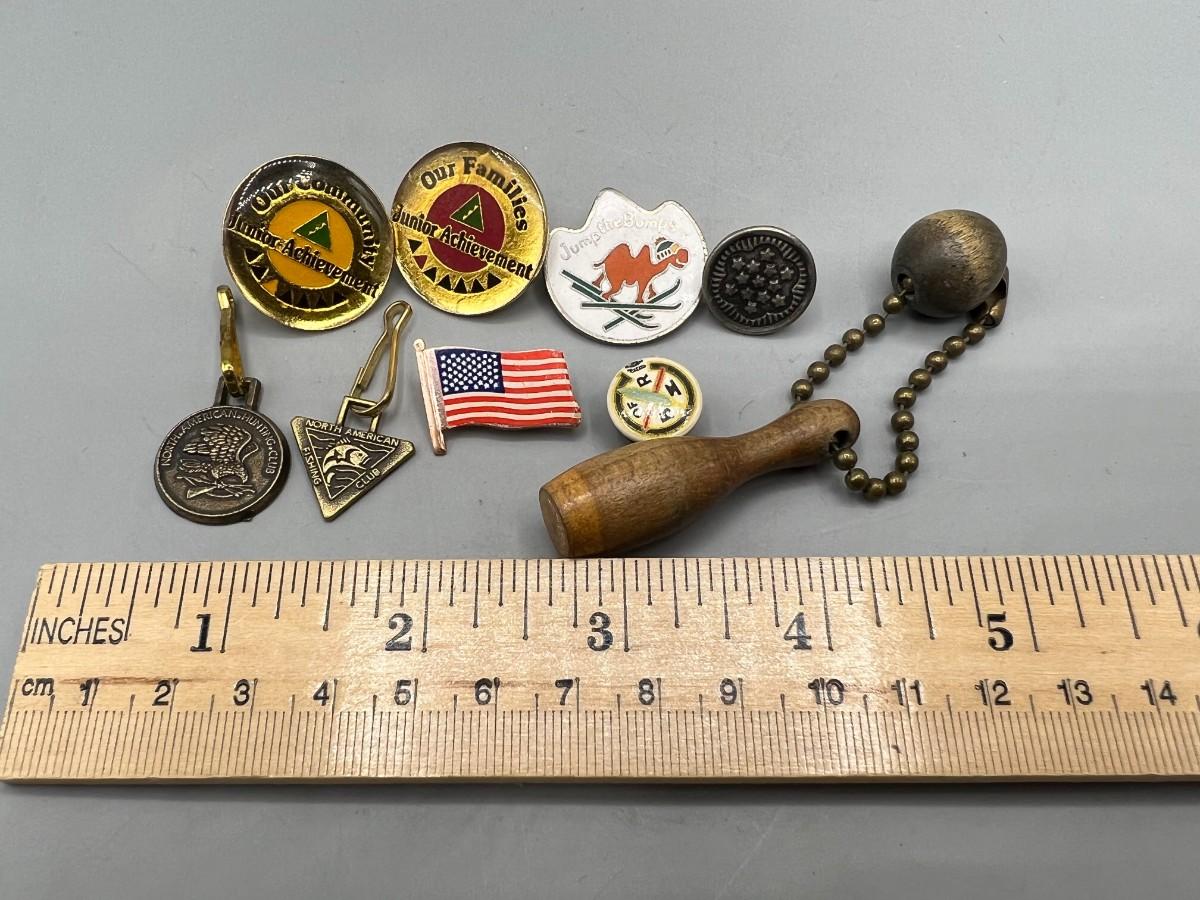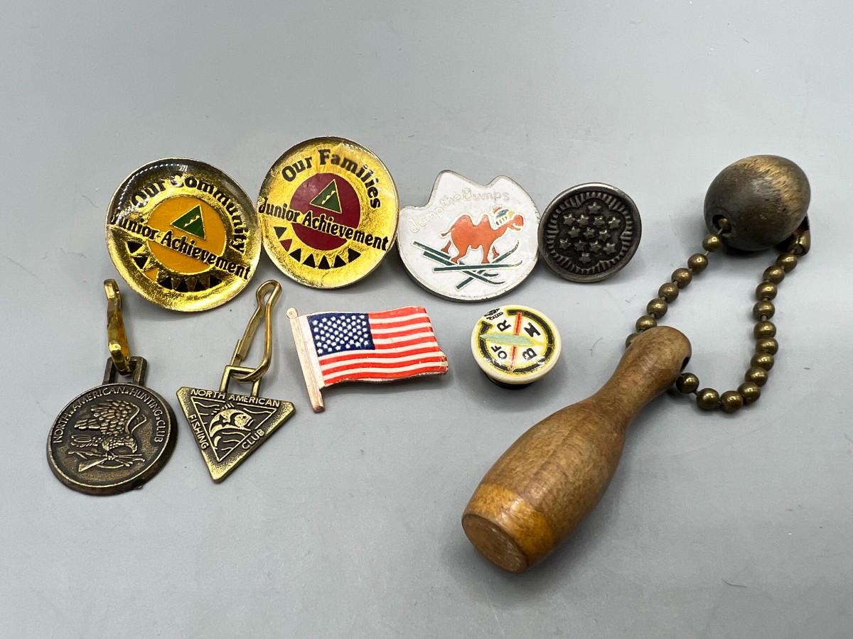 Lot of Retro Miscellaneous Pins & Kecahins Hunting Club, Senior Community Achievement, Bowling Pin & More
