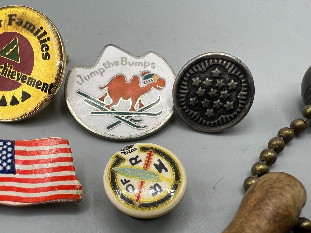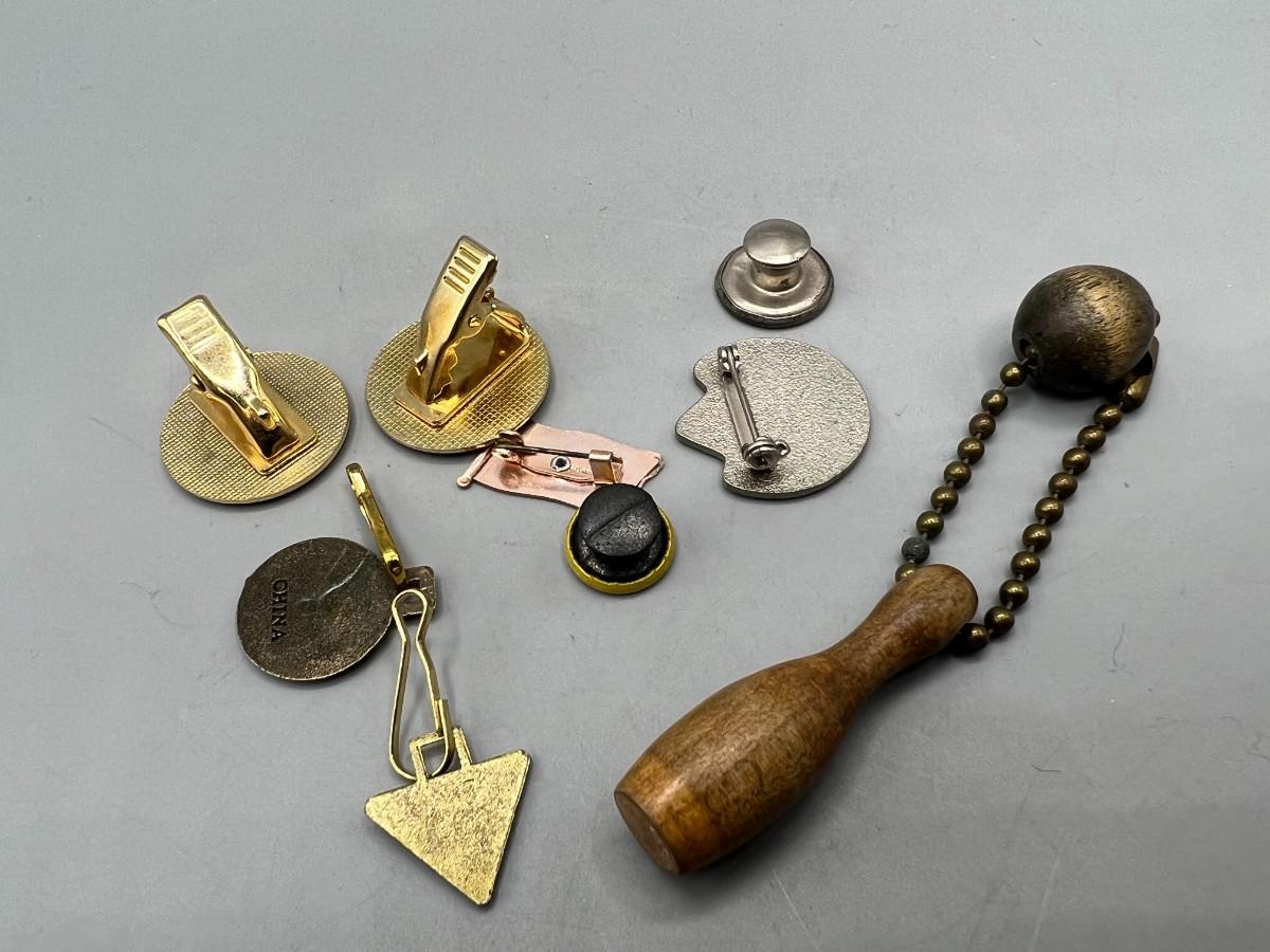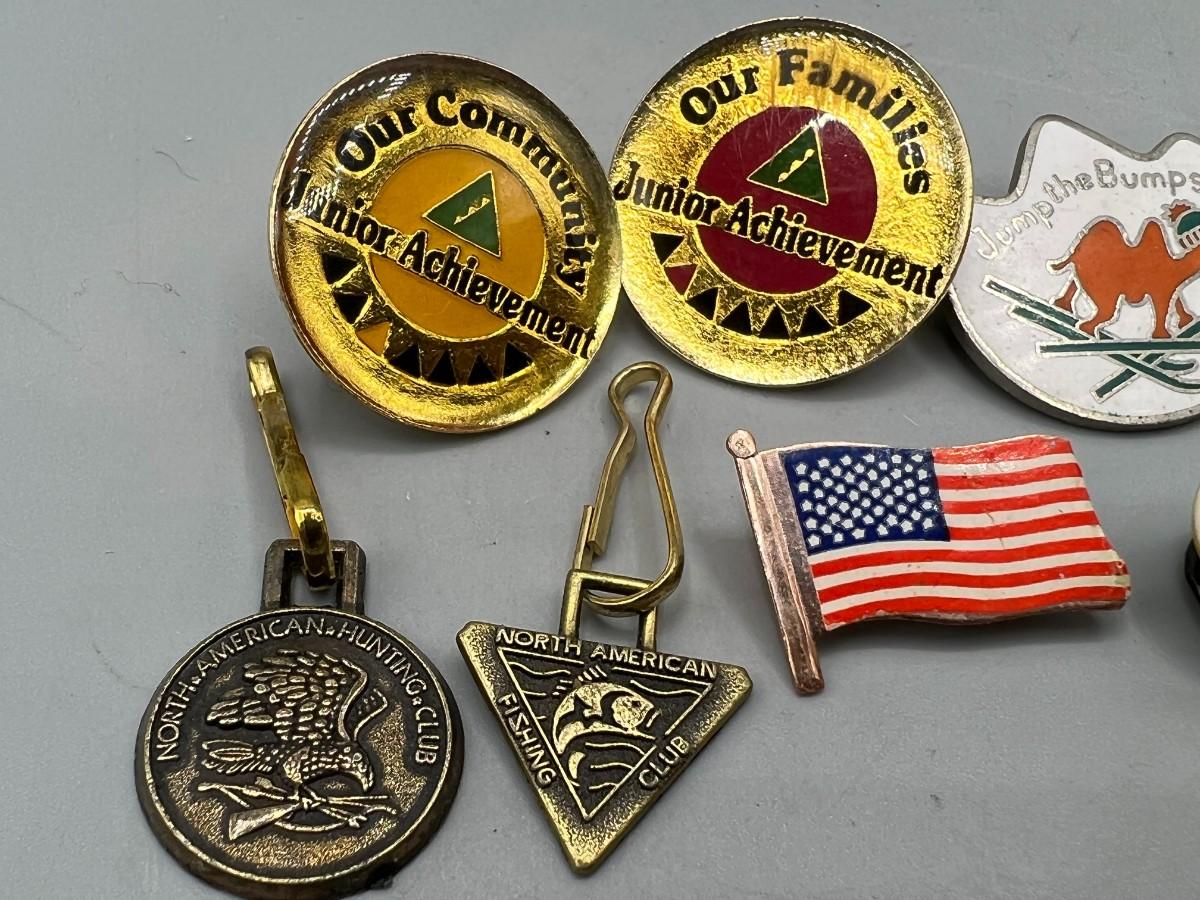Lot of Retro Miscellaneous Pins & Kecahins Hunting Club, Senior Community Achievement, Bowling Pin & More