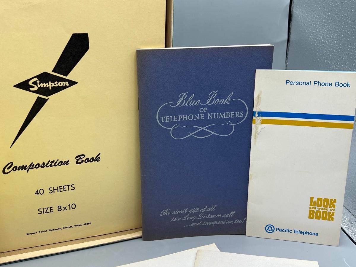 Lot of Retro School Office Supplies Composition Books, Notebooks, Telephone Books & More, there is no significant damage to any of the pieces and is in good useable condition. None of the books have been written in and is in unused, check pictures for more details and for sizing.