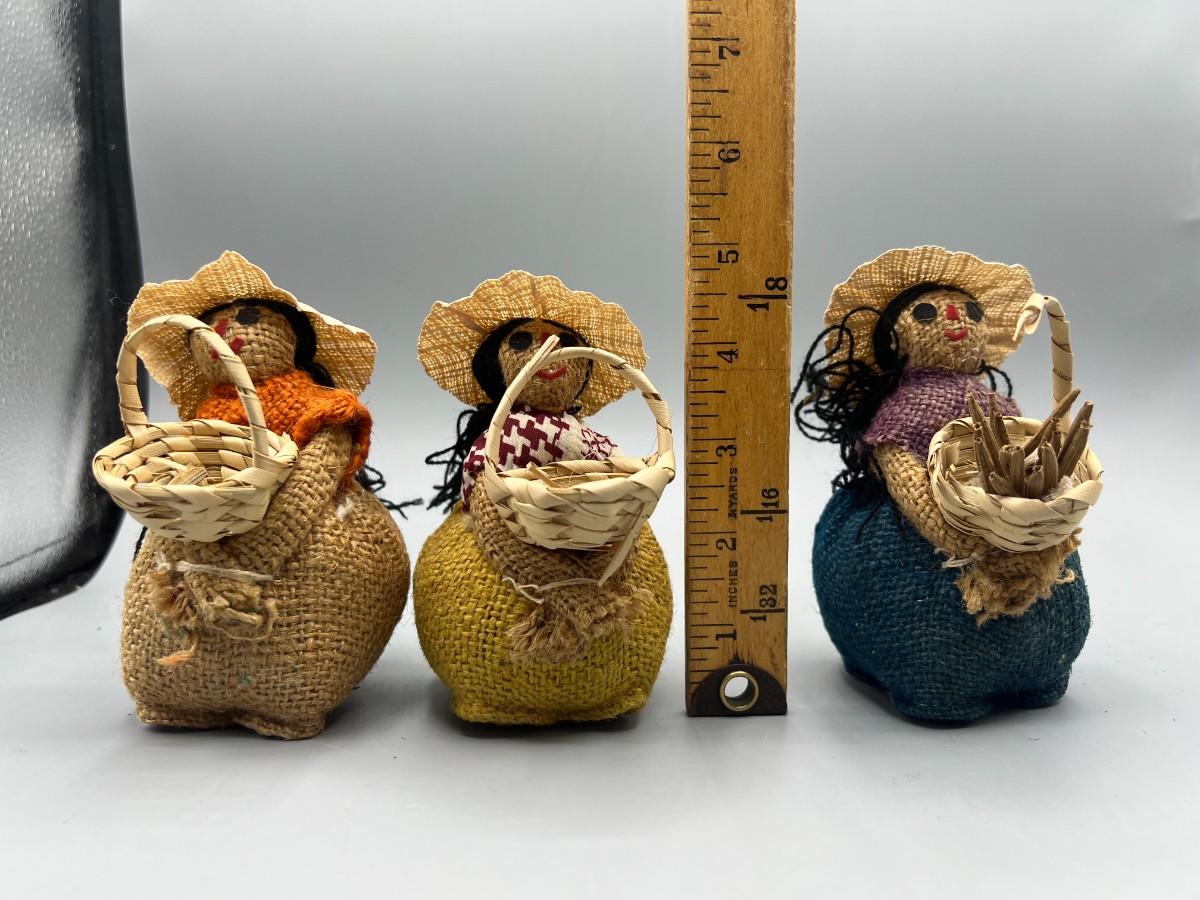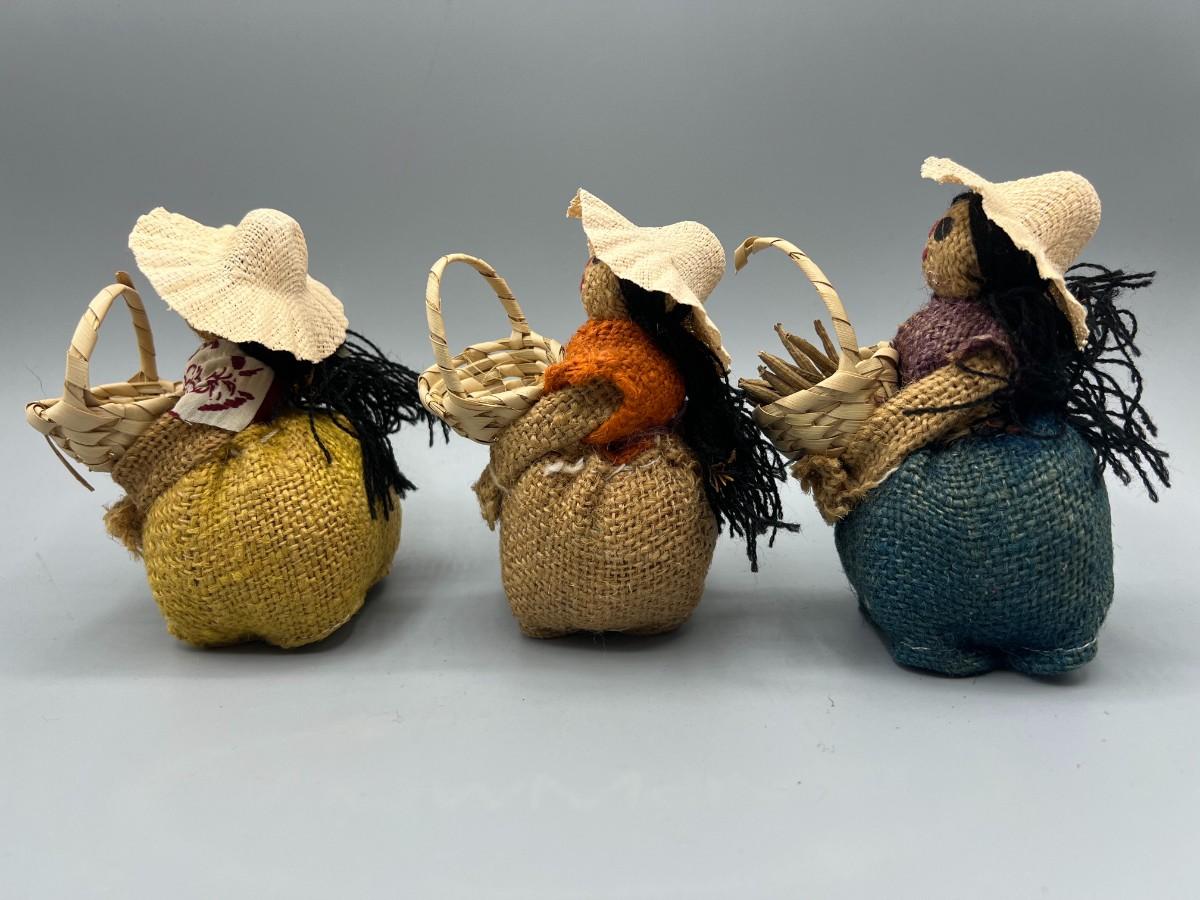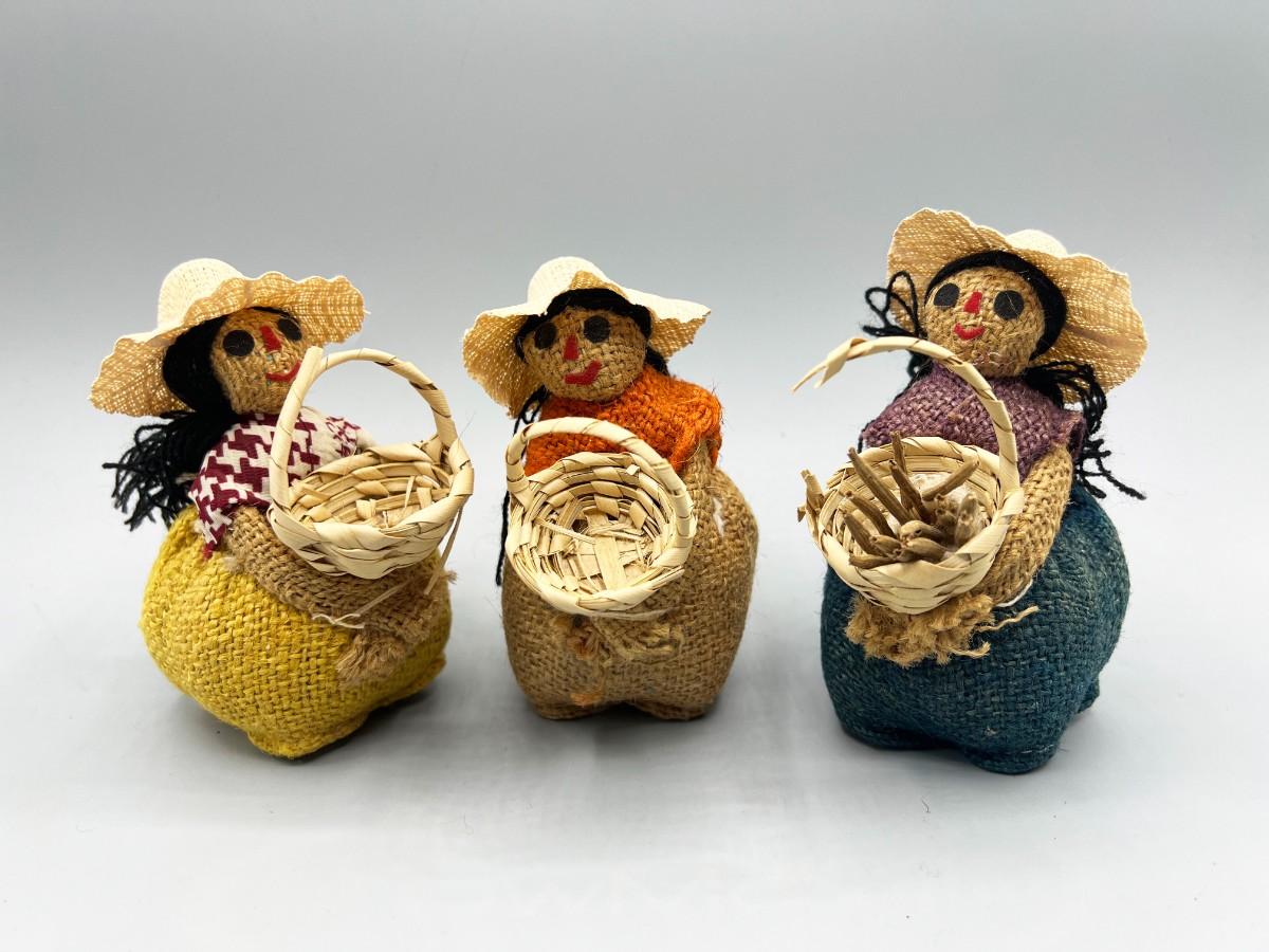 Lot of Retro Stuffed Burlap Cloth Dolls Mexican Souvenirs, the handle to one of the baskets is torn, but there is no other signifncant damage and is in good displayable condition. Check pictures for more details and for sizing.
