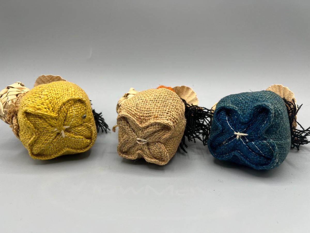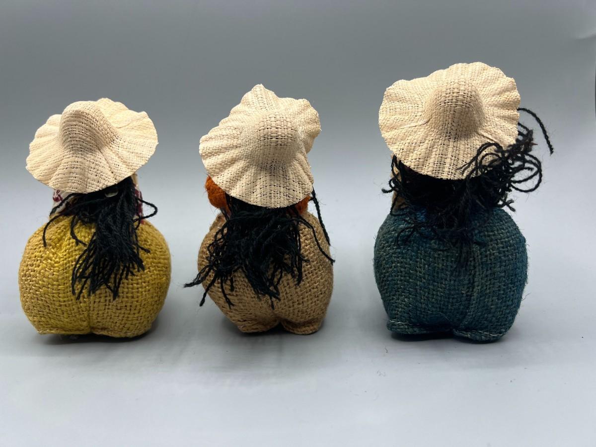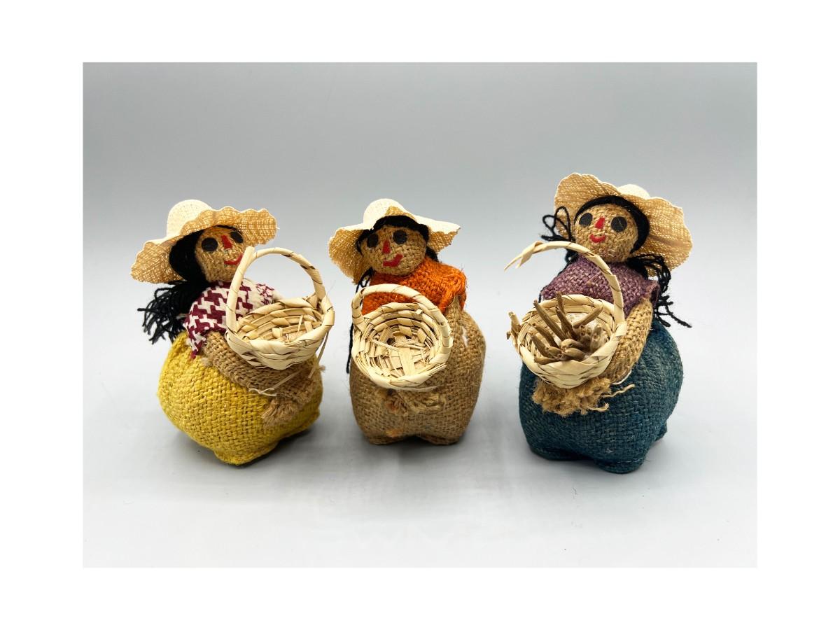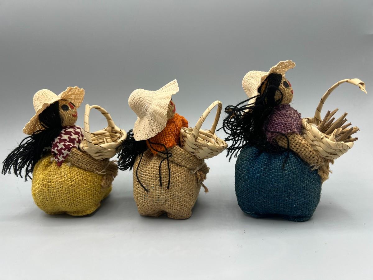 Lot of Retro Stuffed Burlap Cloth Dolls Mexican Souvenirs, the handle to one of the baskets is torn, but there is no other signifncant damage and is in good displayable condition. Check pictures for more details and for sizing.