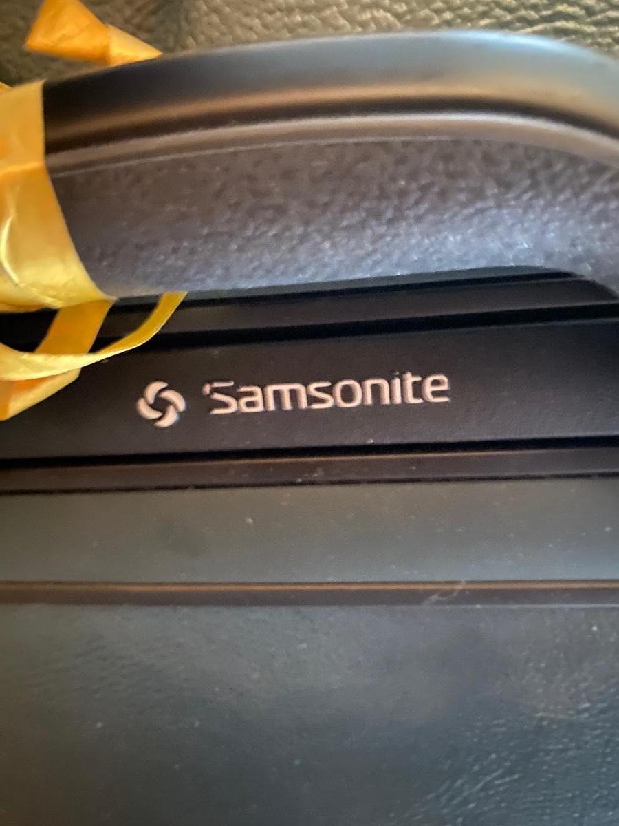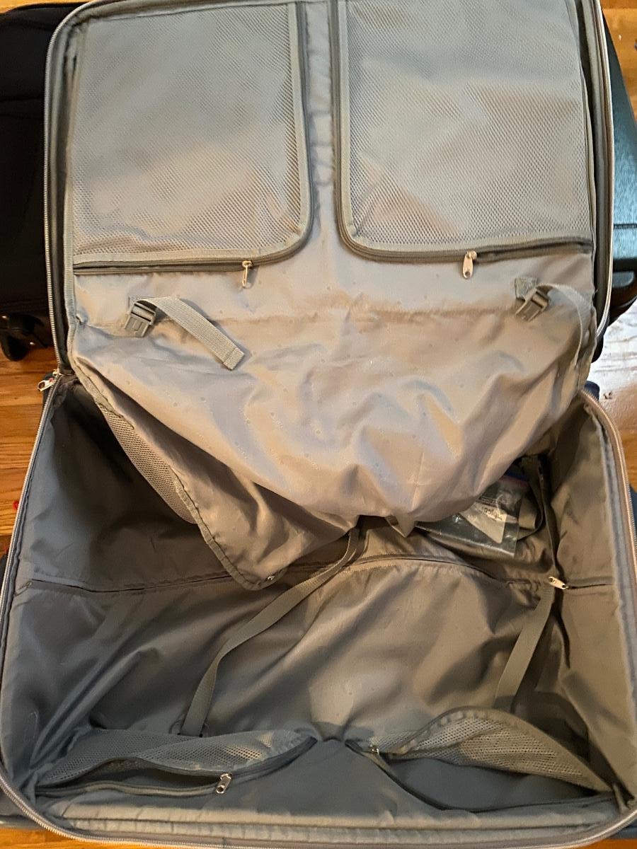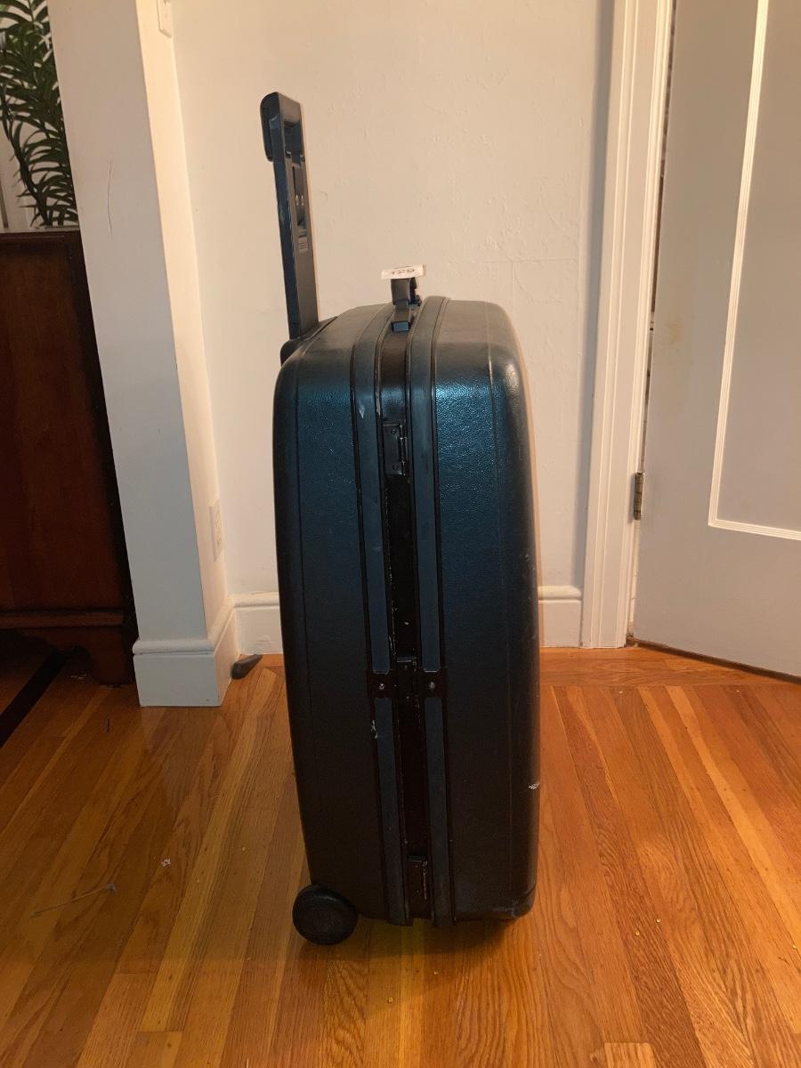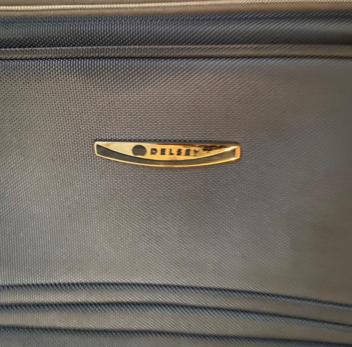 1 small Delsey carry-on suitcase. Two large suitcases. Hardcover is Samsonite (19x28). Other large is Delsey softcover.