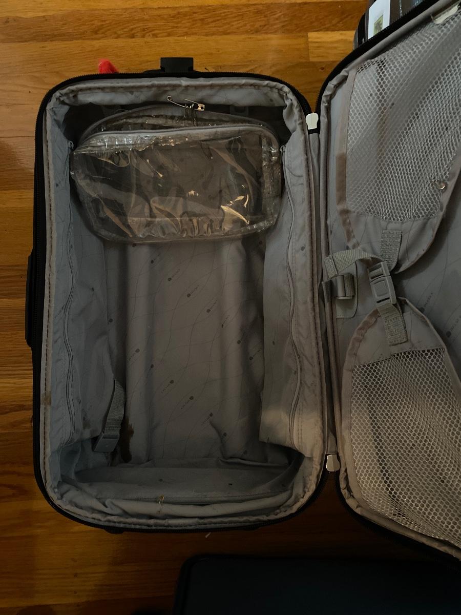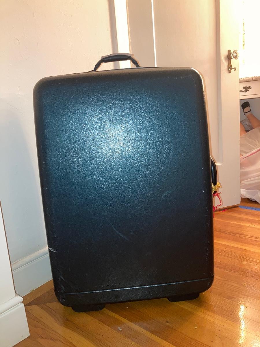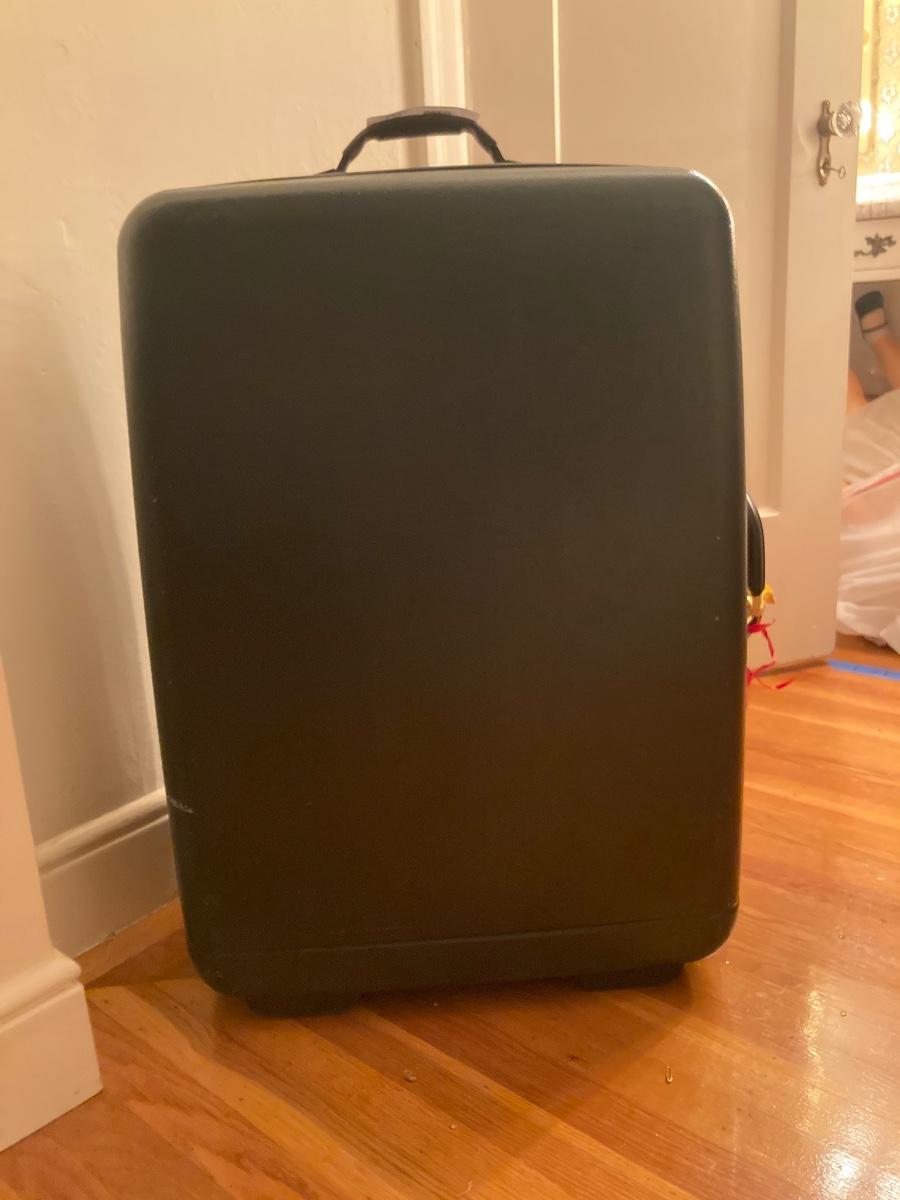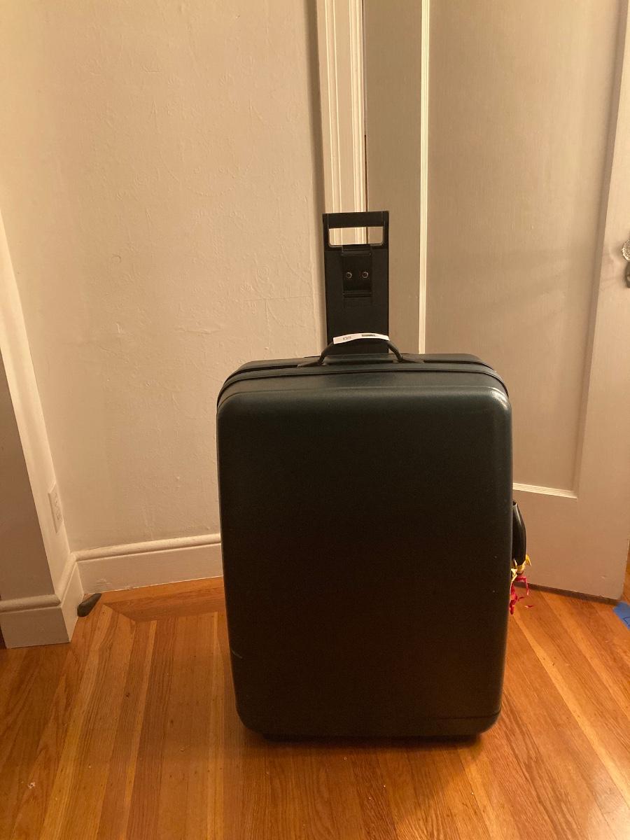 1 small Delsey carry-on suitcase. Two large suitcases. Hardcover is Samsonite (19x28). Other large is Delsey softcover.