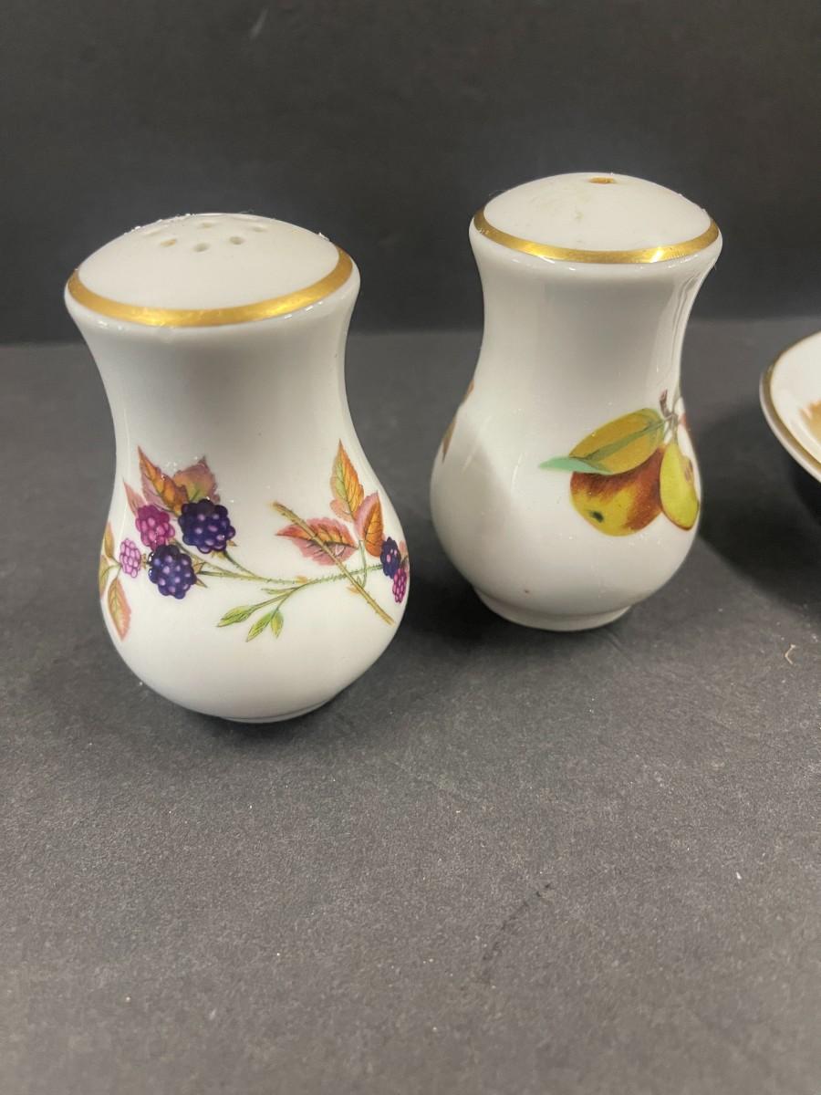 Lot of Royal Worcester gravy boat (under plate has a chip) and salt and pepper shakers.