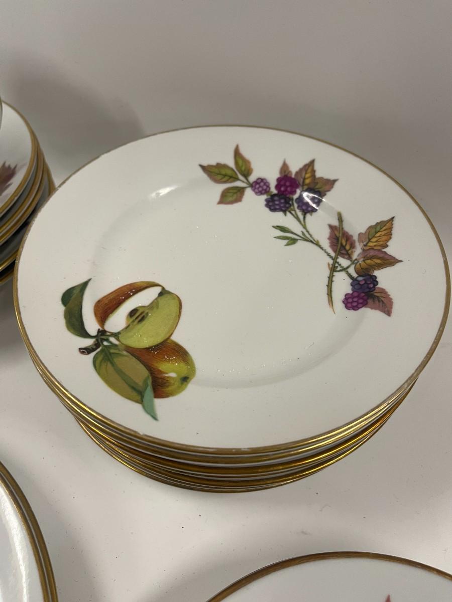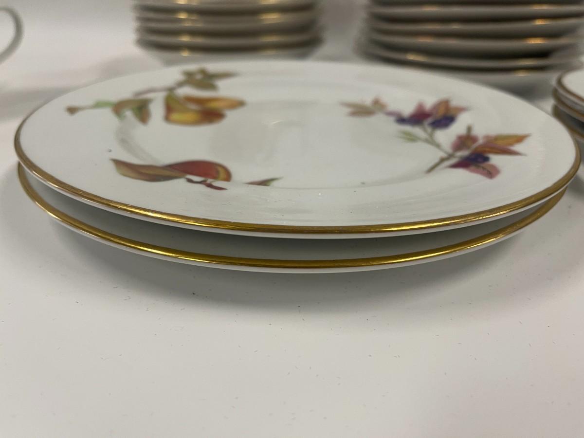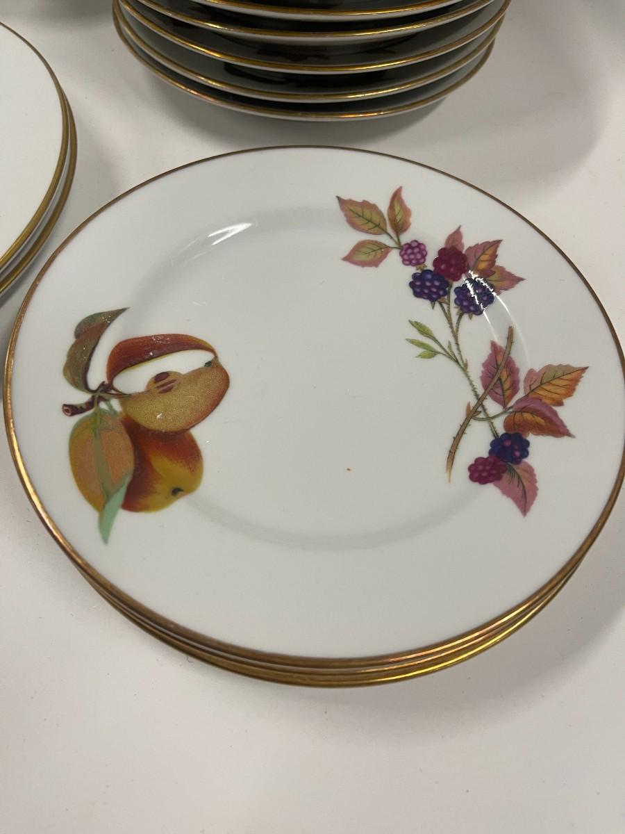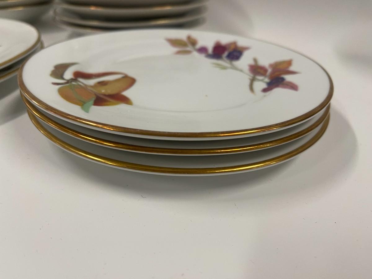 Lot of Royal Worcester Evesham China. Mixed lot. No chips but some of the older, smaller plates have wear to the gold rims.