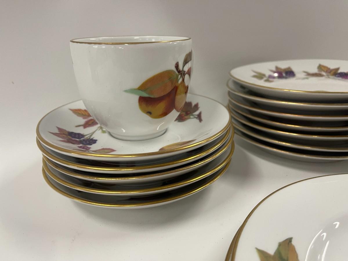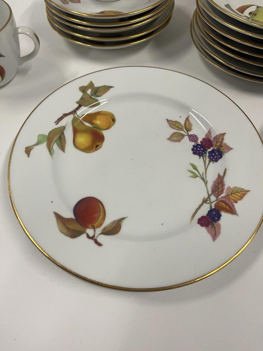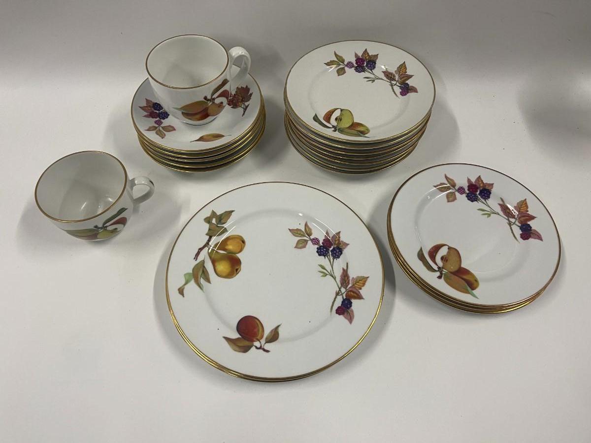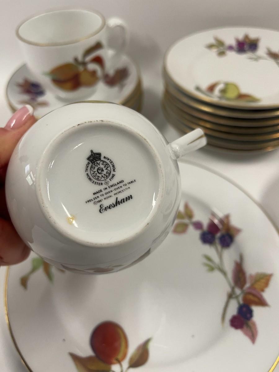 Lot of Royal Worcester Evesham China. Mixed lot. No chips but some of the older, smaller plates have wear to the gold rims.