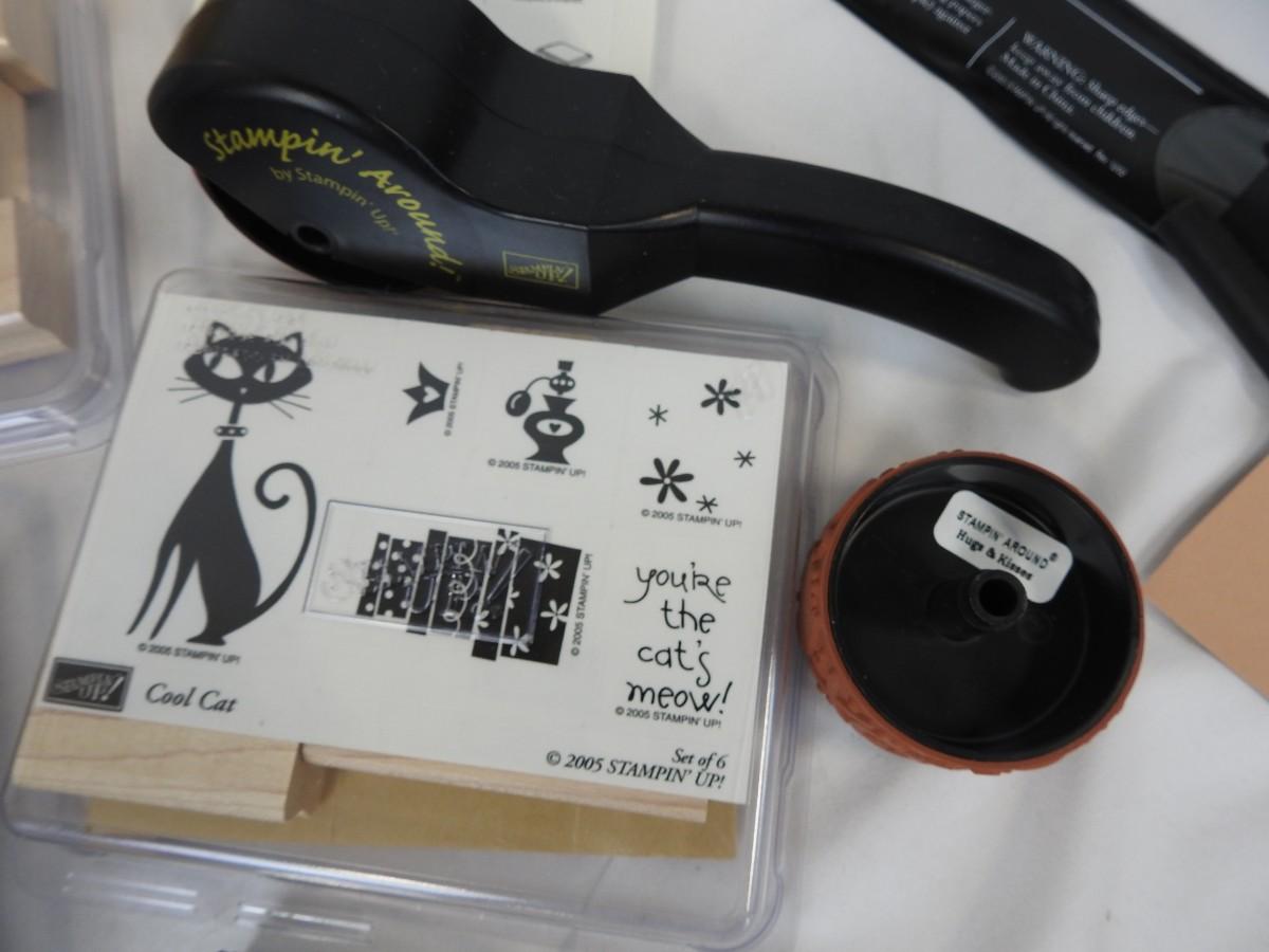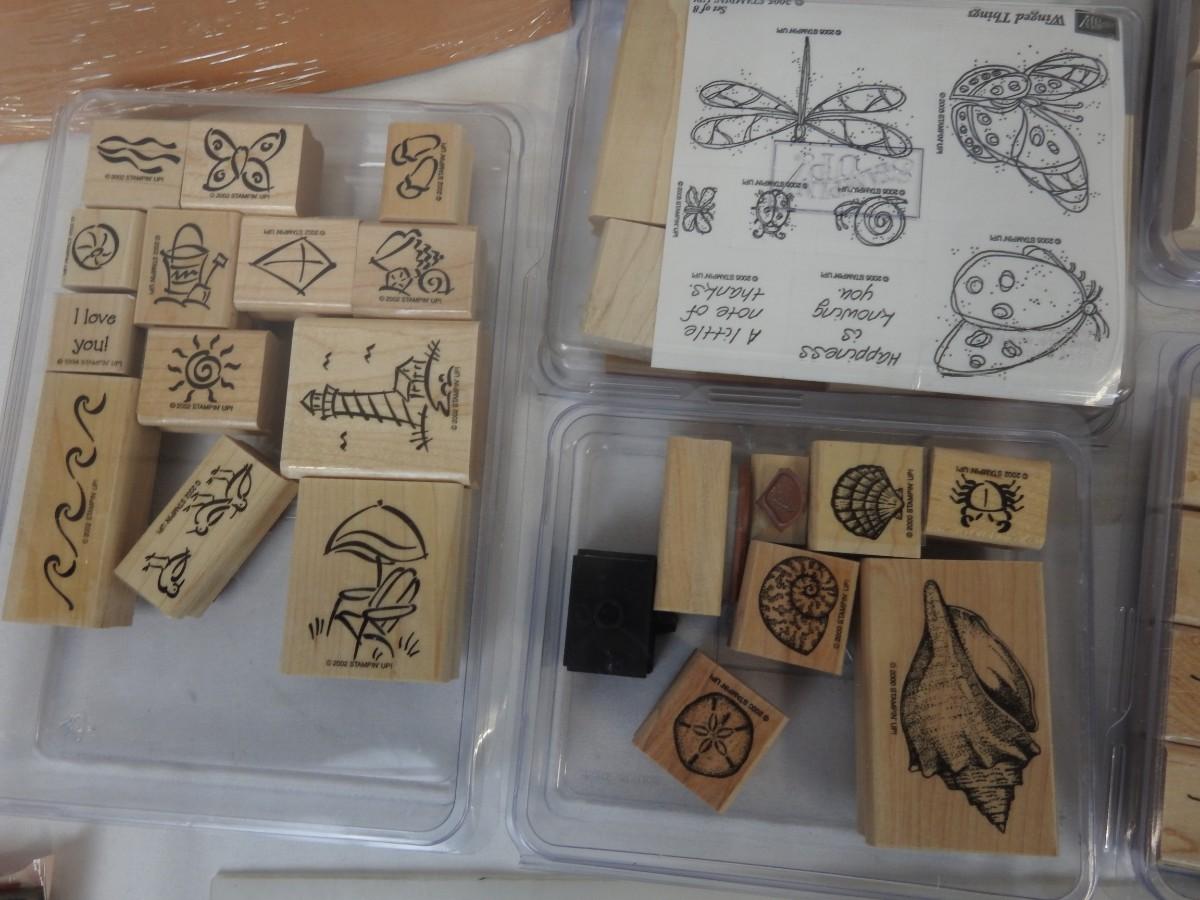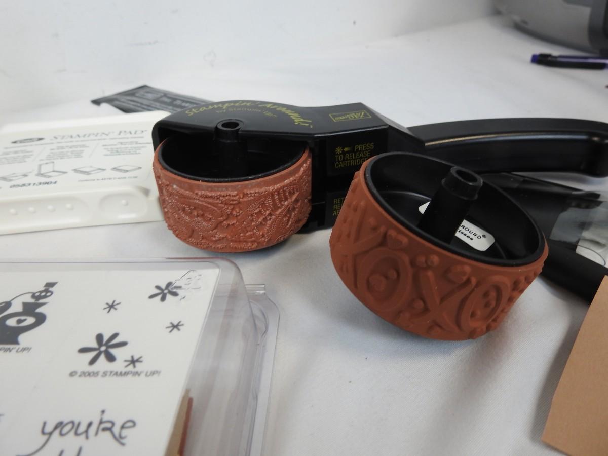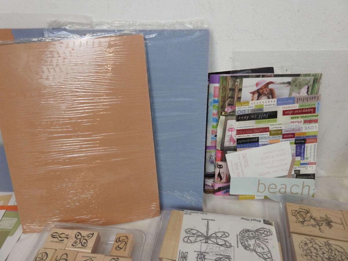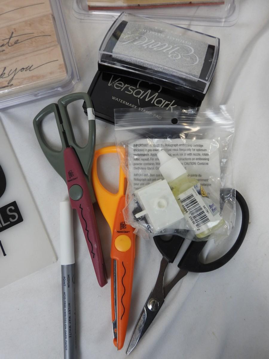 Lot of Rubber Stamps, Stamp Pads, Paper, Scissors