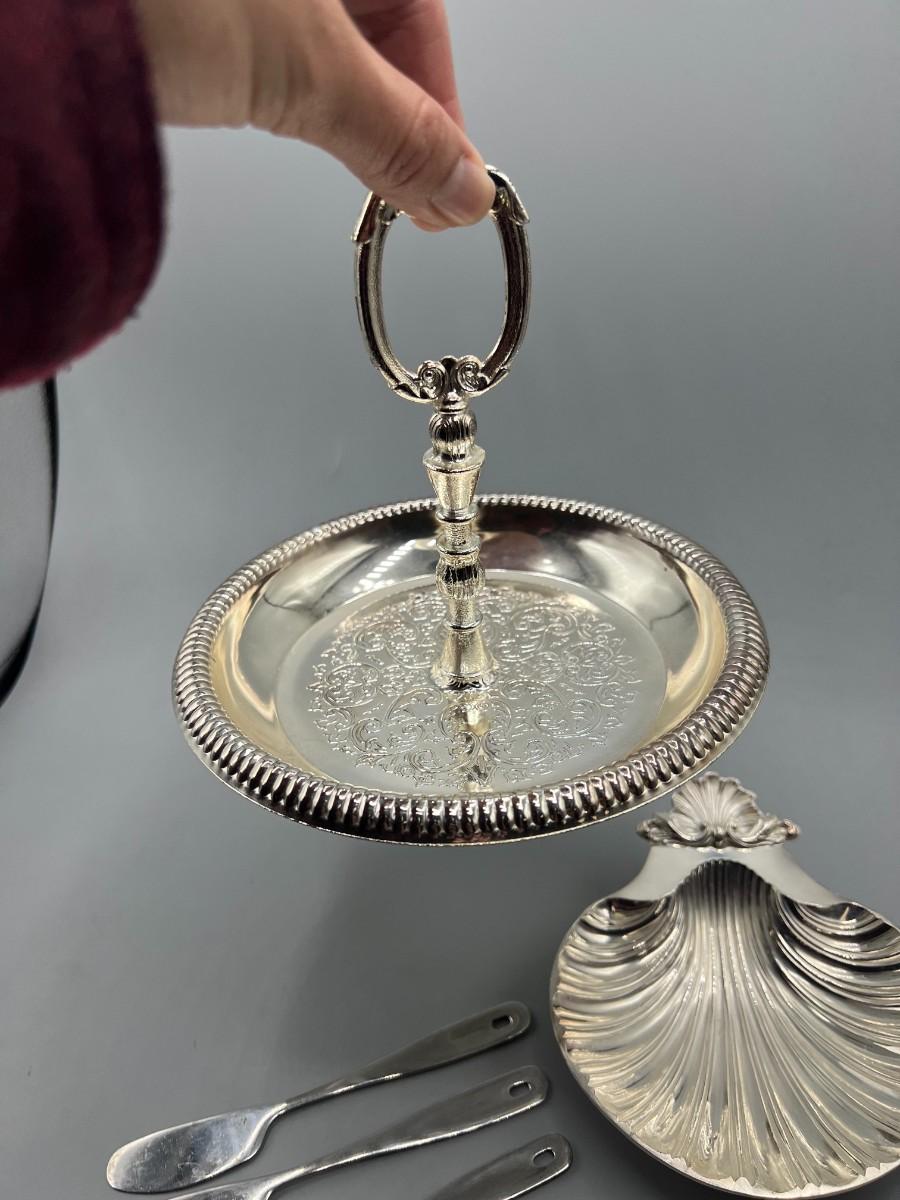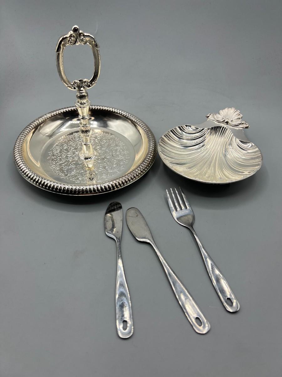 Lot of Serving Dishes Brass Shell Reproduction Design Sheffield England RF Inc. & Handled Dish with Stainless Utensils