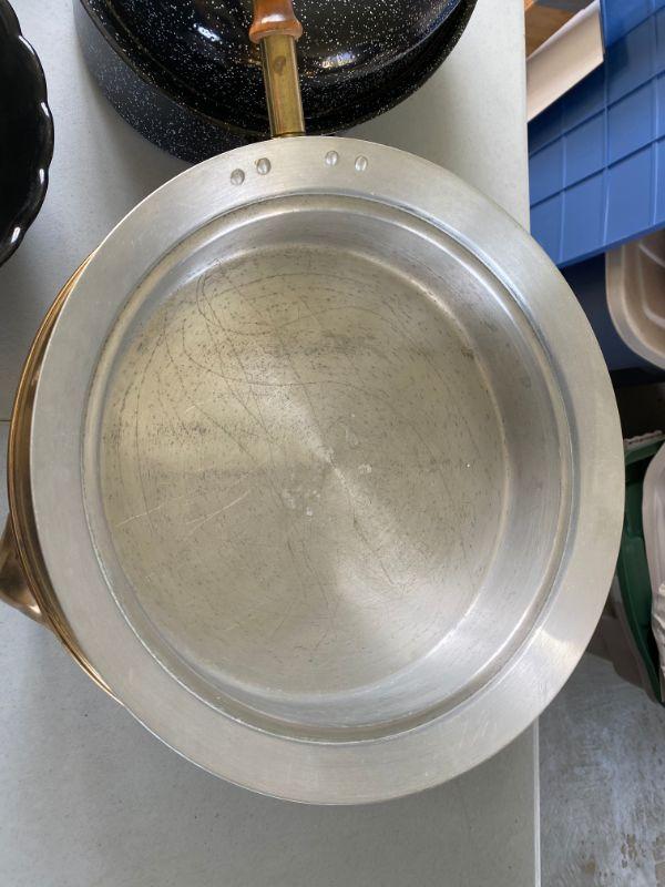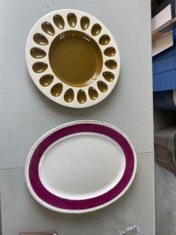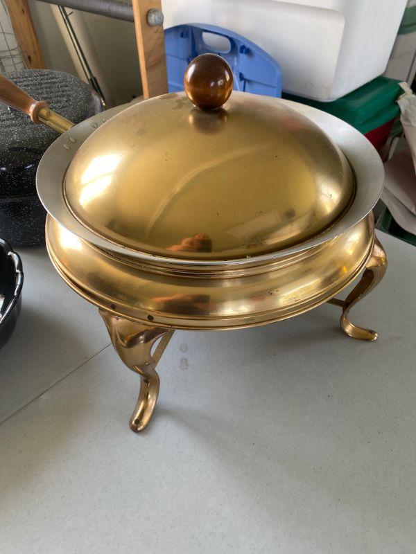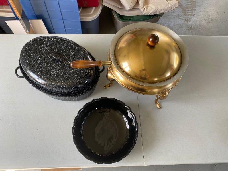 Large Copper Chafing dish measures 14" round with Oval roaster measuring 16.5" and large oval ironstone platter measuring 20.5" with 16.5" round egg dish