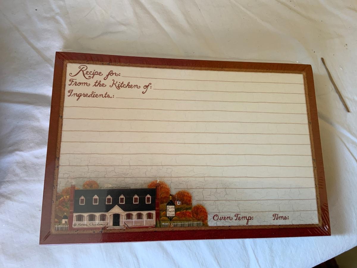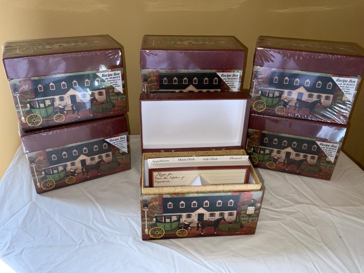 Lot of seven new Williamsburg recipe boxes. Six boxes still in original wrapping.