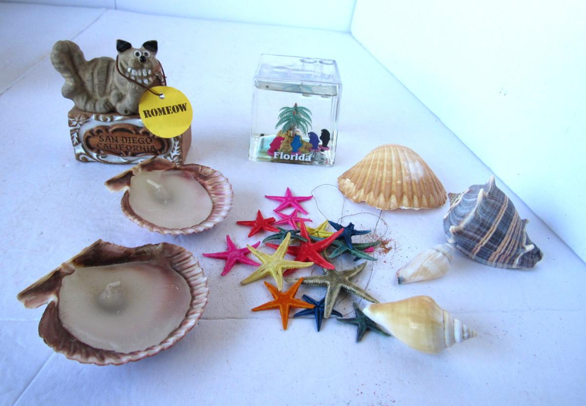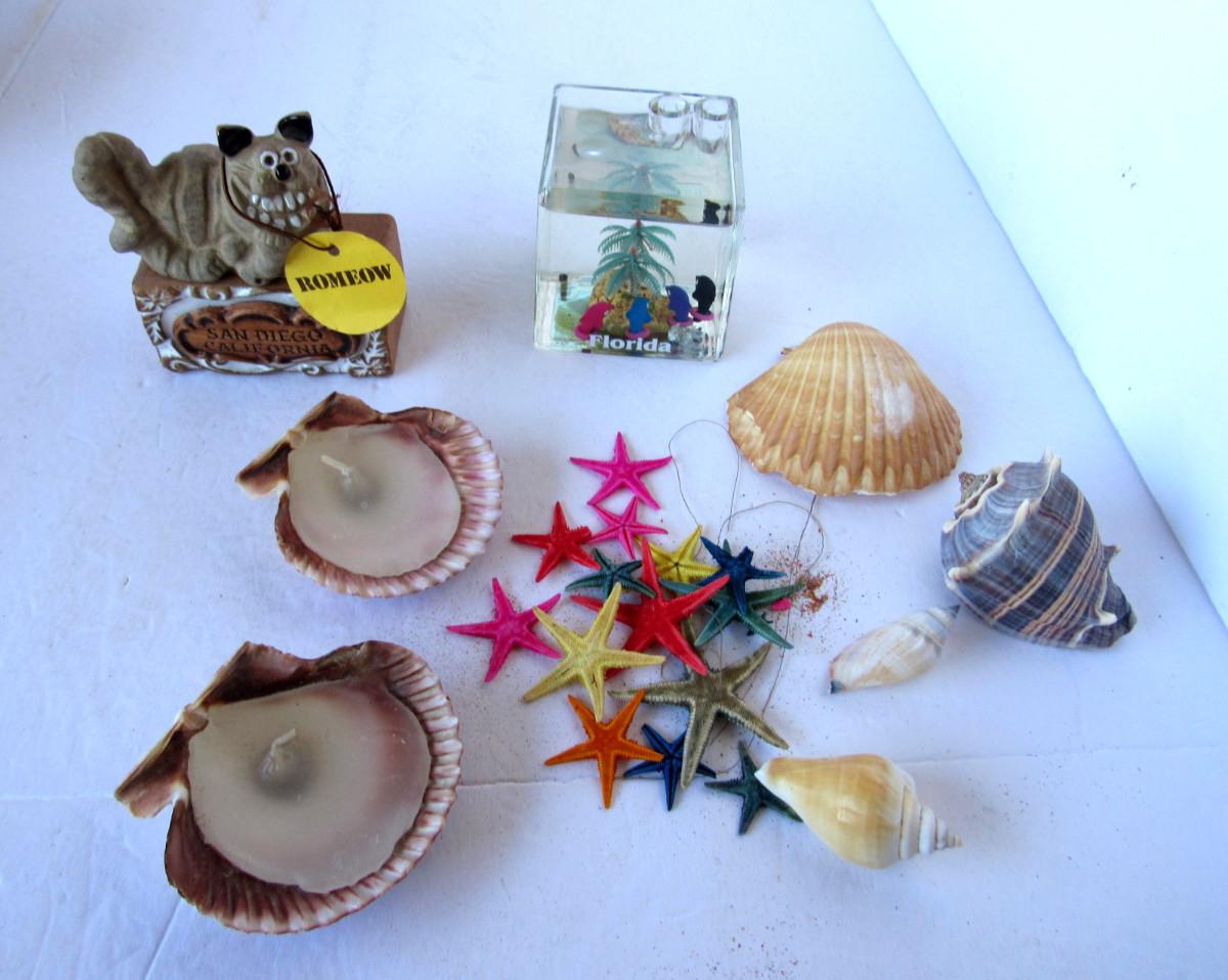 Lot of Shells and Starfish, Shell Candles, Florida Pen Holder, Dog Figure