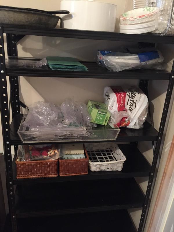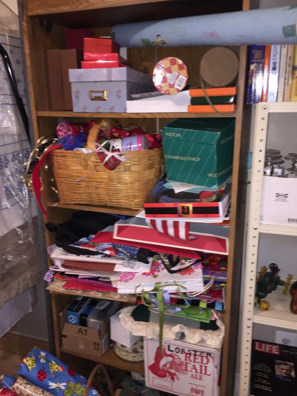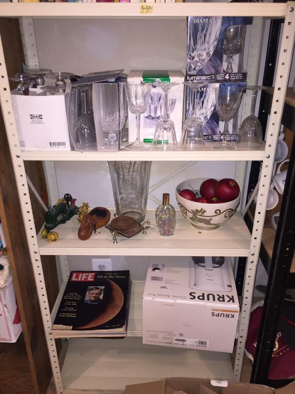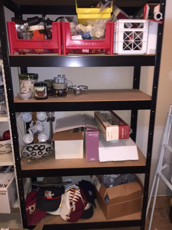 Includes one heavy duty black metal shelf with fiberboard shelves 17" x 36 1/2" x 72", two light duty metal utility shelves, and one oak finish tall bookcase. Items on shelves not sold seperately.